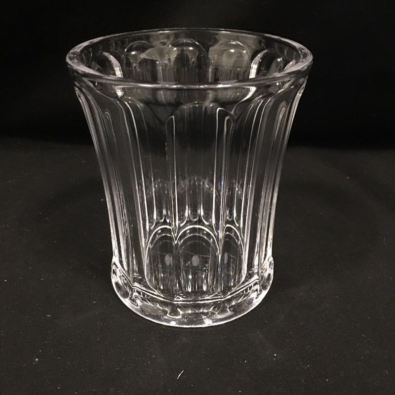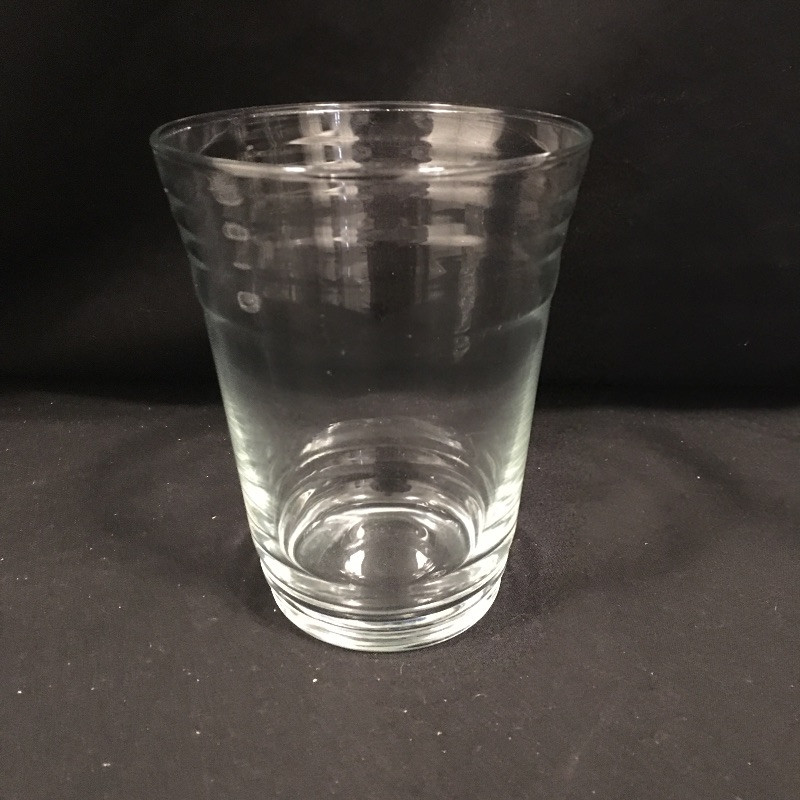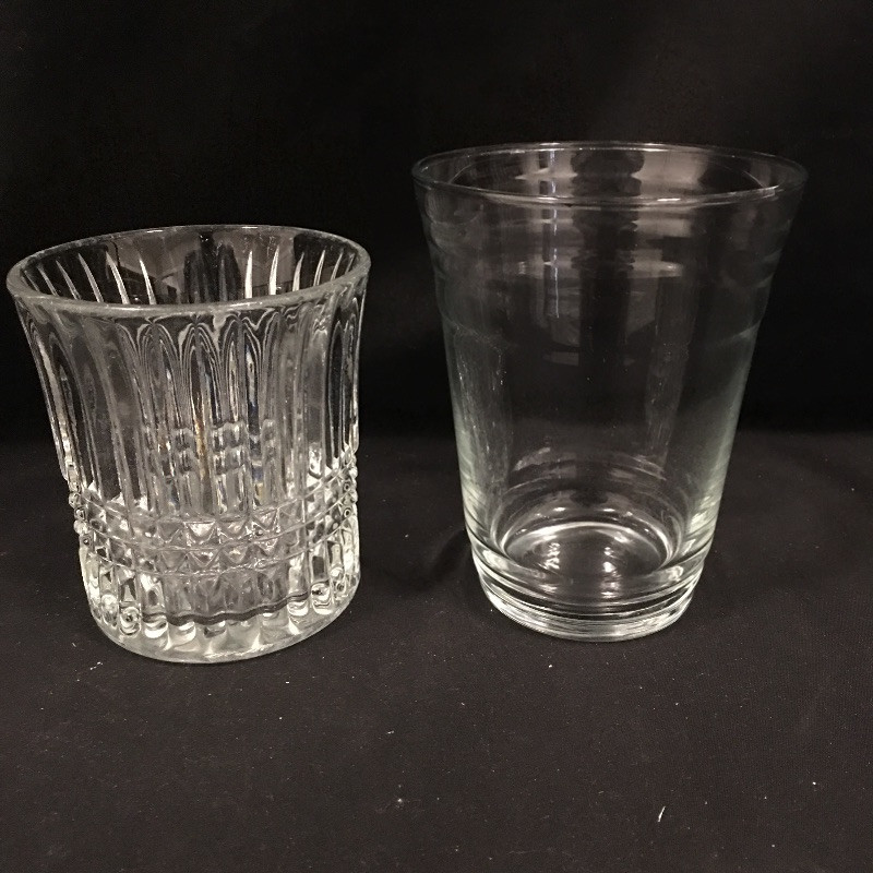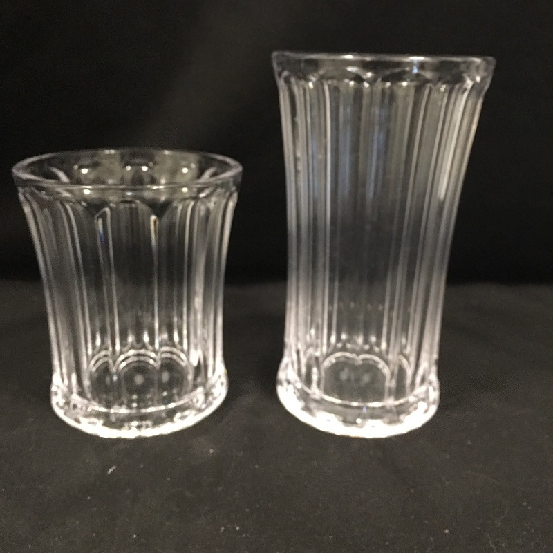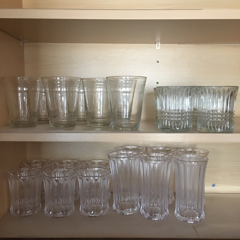 Perfect starter glassware set or add to your existing one with this great set of glasses that includes twelve plastic glasses and eleven that are glass. Bottom shelf houses the plastic glasses. Largest glass measures 3.25” D x 5.75” tall.