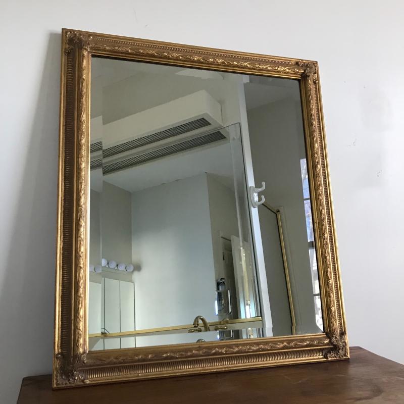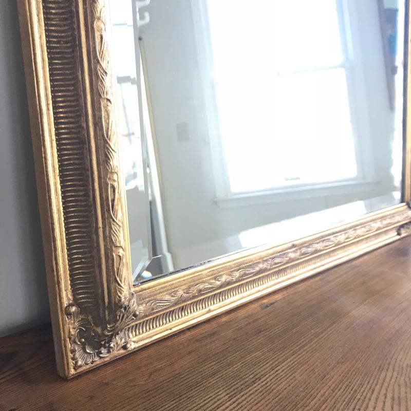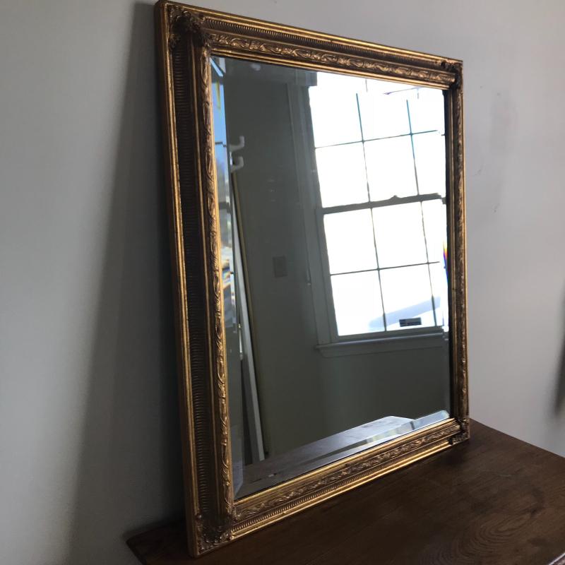 Nice heavy gold painted wooden framed mirror. Beveled glass on edge. Can hang with vertical or horizontal. 28.5”l x 24.5lw. No Shipping. Local pick up in Asheville, NC