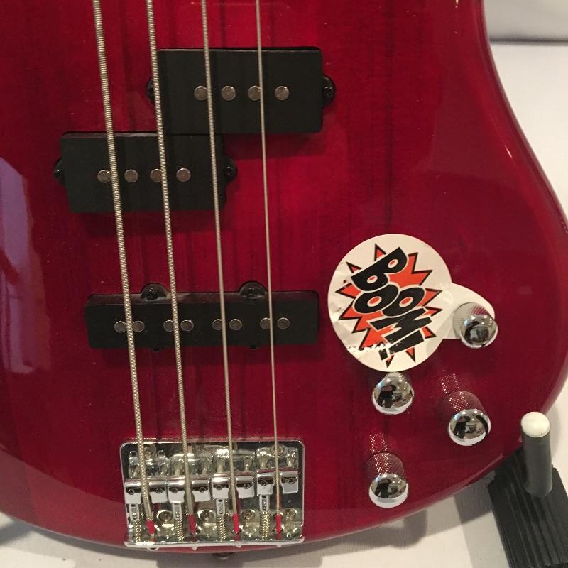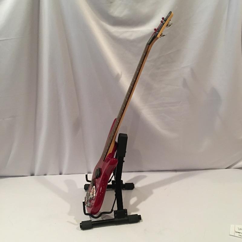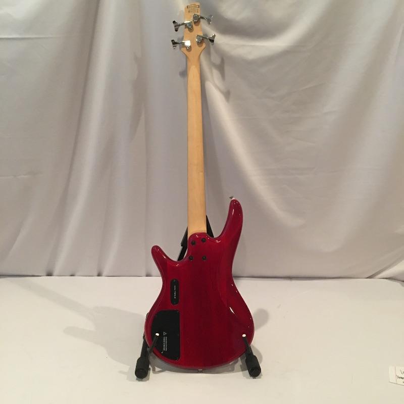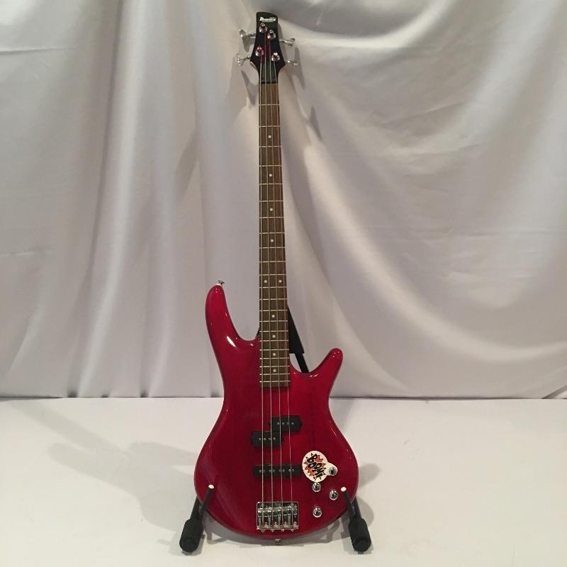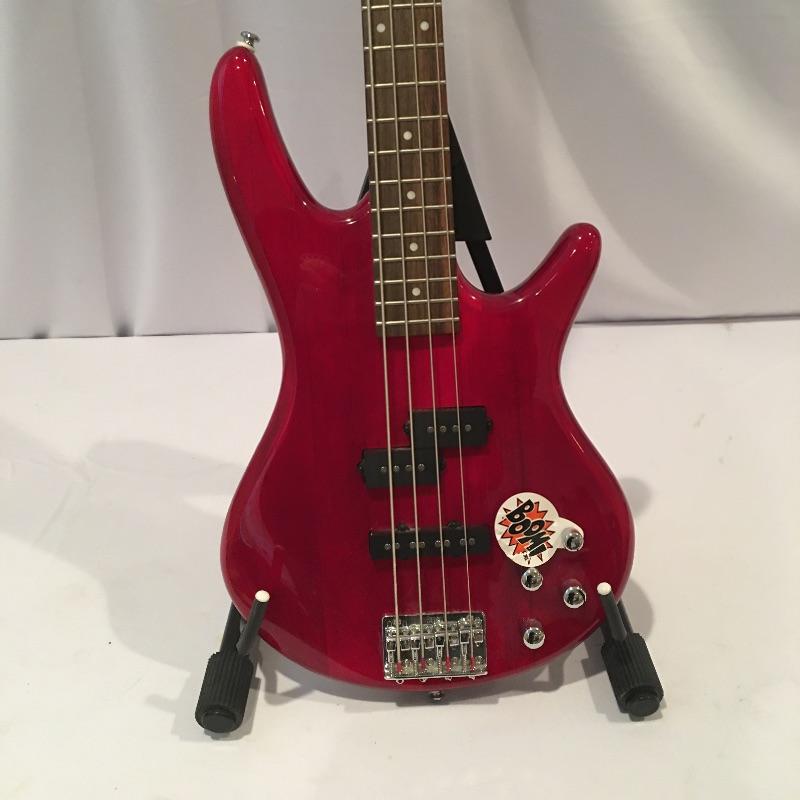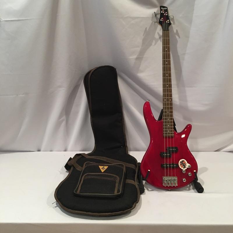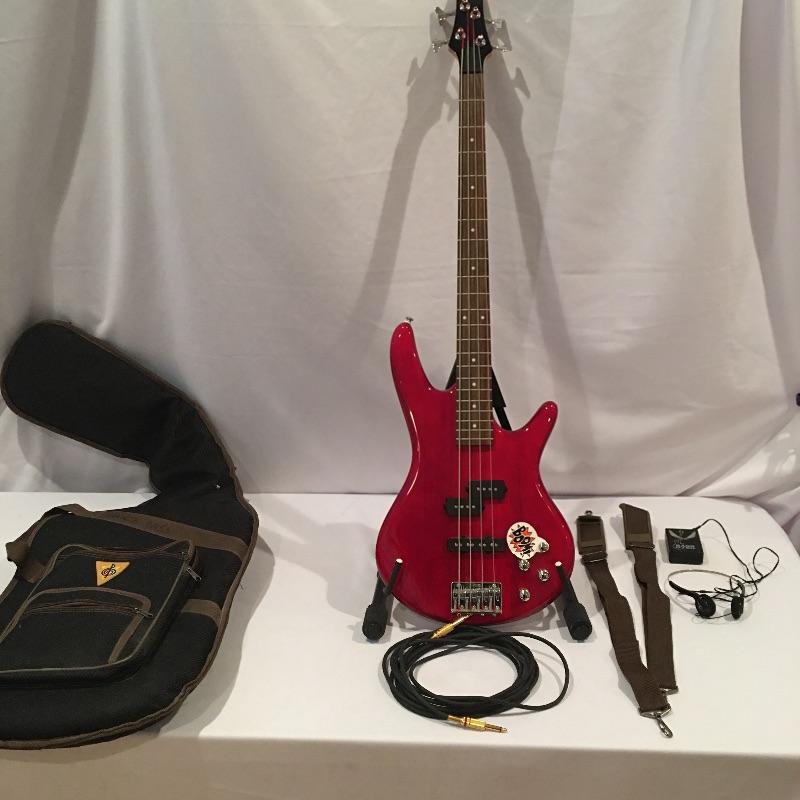 Ibanez bass guitar with a soft carrying case. Lot also includes a "bass in a box" (not tested- as batteries are dead), a cable to plug in guitar and a pair of straps. There is a small "boom" tag on front. Guitar measures 13” x 44.5” x 2”.