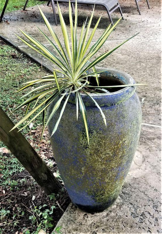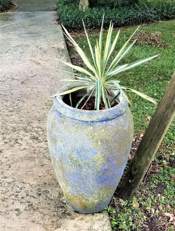 We're throwing in the plant! Nice, HEAVY concrete urn for patio or garden. 24" tall - still has the remnants of robin's egg blue paint.