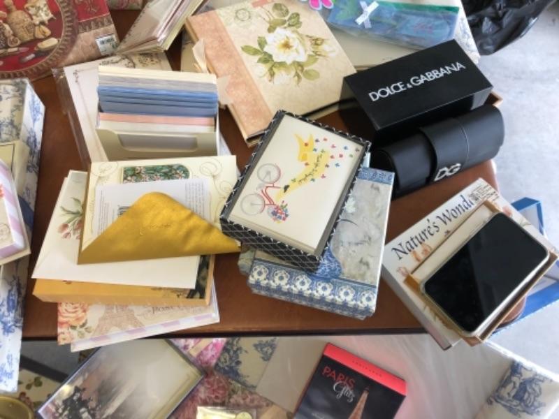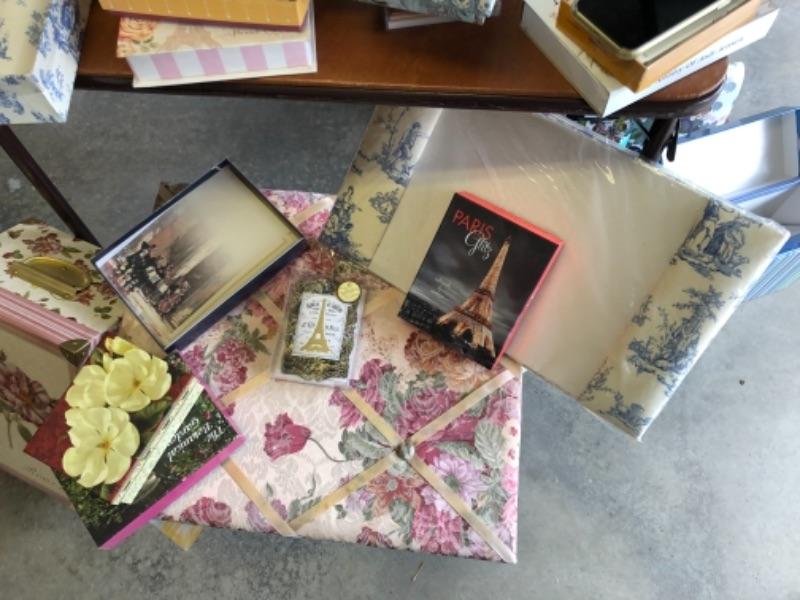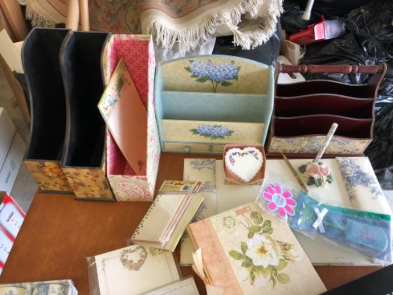 Lot 80. Lot of stationery, letter holders, blotters, magazine holders shelf paper, file boxes, decorative boxes and pens--WAS $65““NOW $48.75