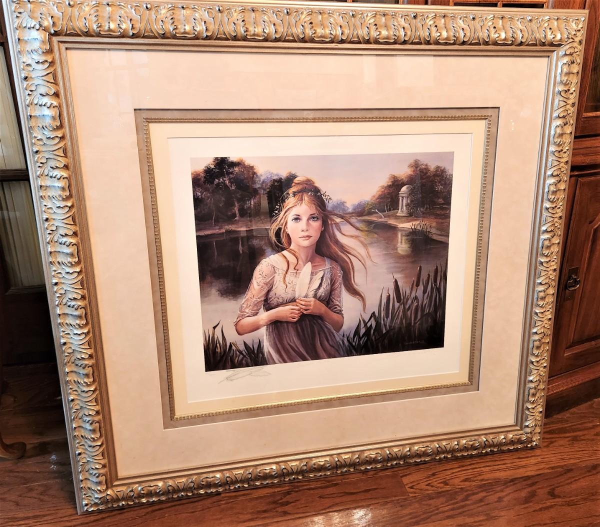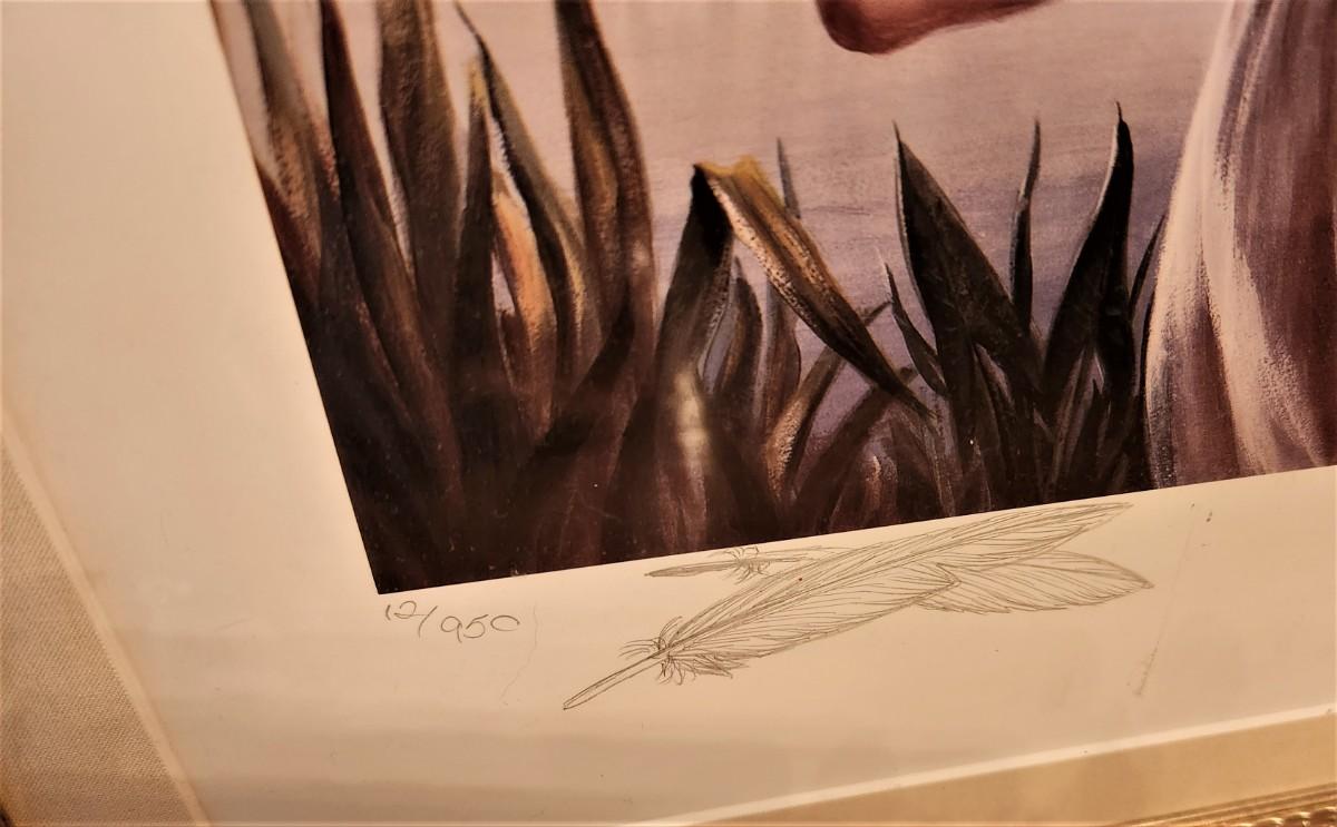 Framed beautifully (custom) - heavy - excellent condition, #12/950, pencil signed with name of work by artist. Charming extra "doodle" of a feather done by artist on the mat. 42" across, 40" tall.