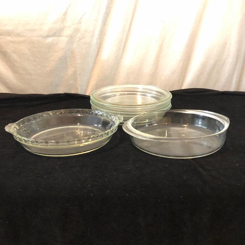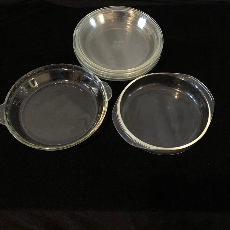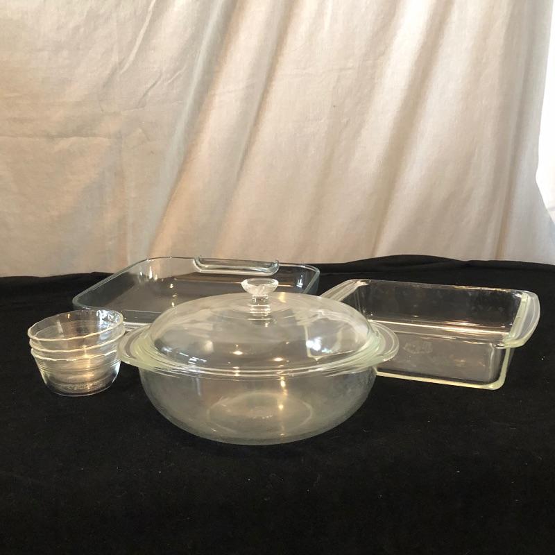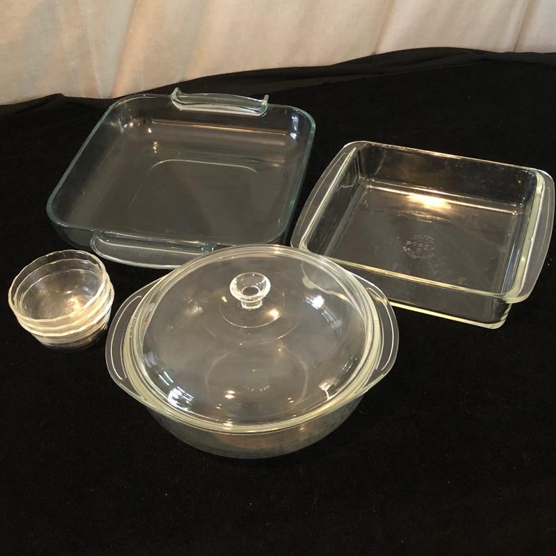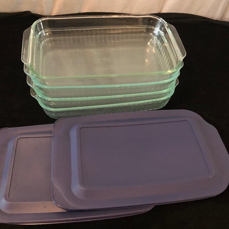 Nice collection of various sizes of Pyrex dishes. The 4 rectangular shaped dishes measure 9” x 13” and the largest square dish measures 10” x 10”. No shipping.
