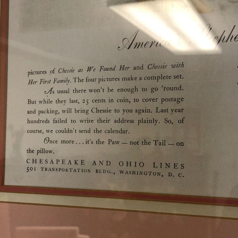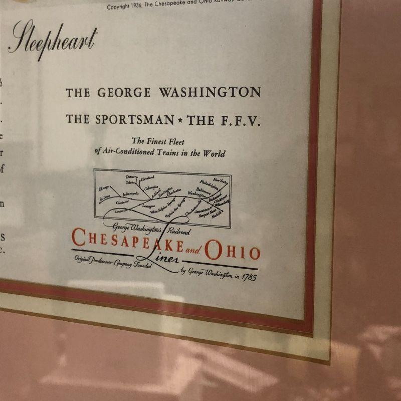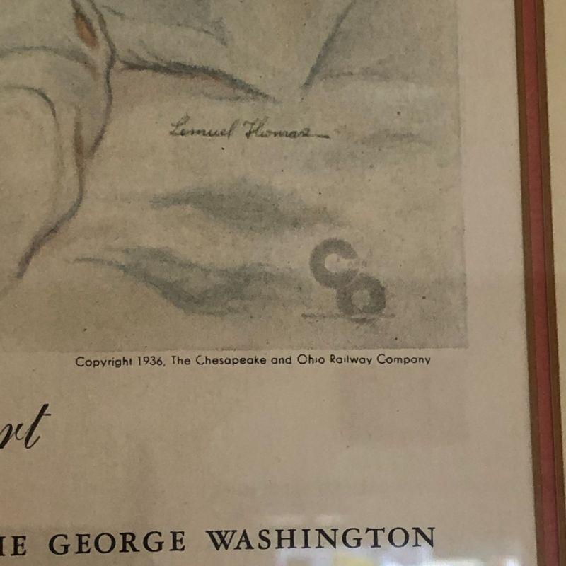 Just like Lot 79, the picture was originally copyrighted in 1936 for the Chesapeake and Ohio Railway Company and used in their calendar. It has a multi-layer border and is professionally framed. The frame measures 18" x 15.75".