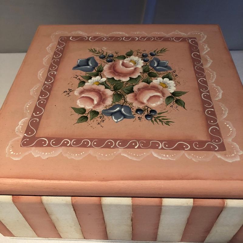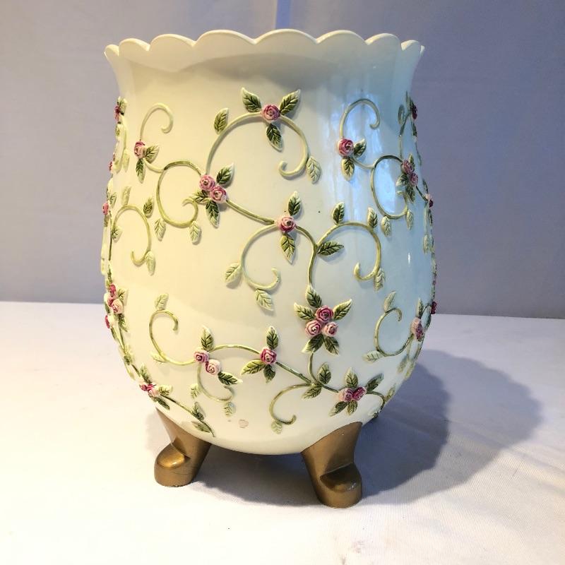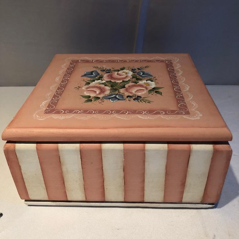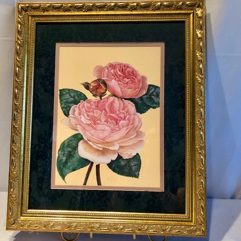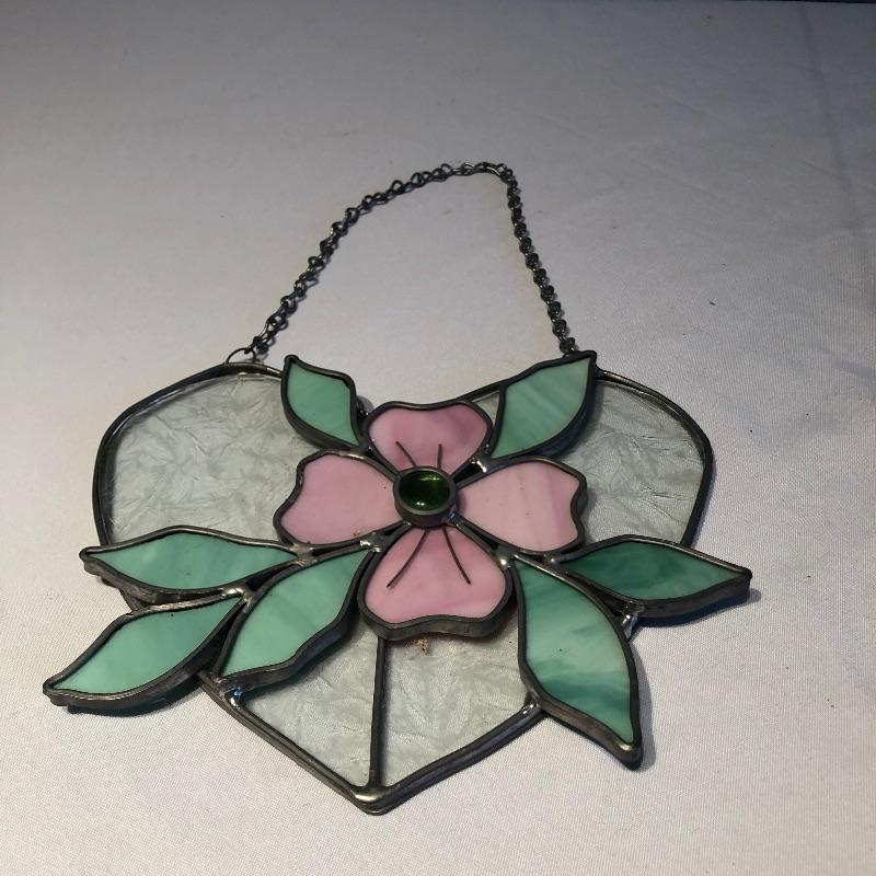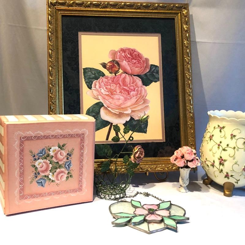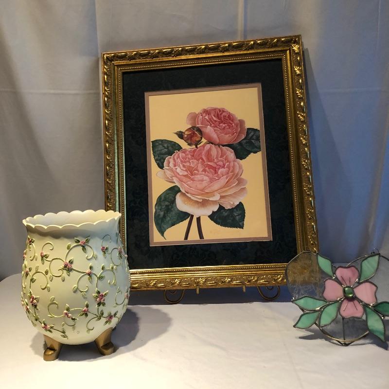 This lovely assortment of decor items all have pink flowers as their common theme. The lovely signed artwork by Waltraud Fuchs Von Schwarzbek is a delightful piece that has been mounted in a beautiful gold colored frame with a dark green damask matting that compliments the art perfectly. Other items include a plastic footed rose adorned urn, a hanging window stained glass piece in the shape of a heart, a wooden box, metal small plant stand and a tiny resin vase with faux flowers.