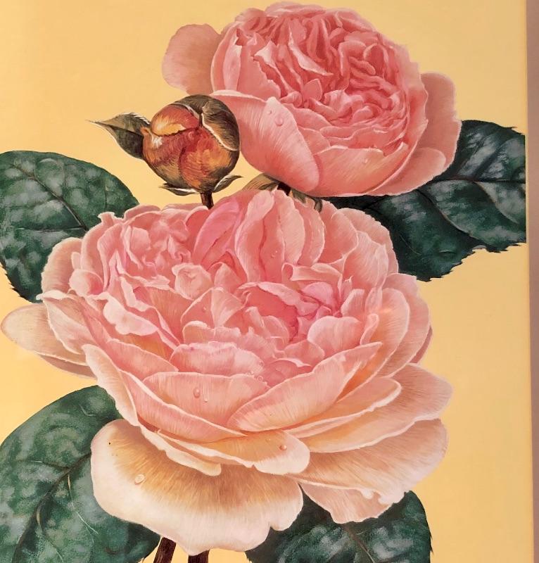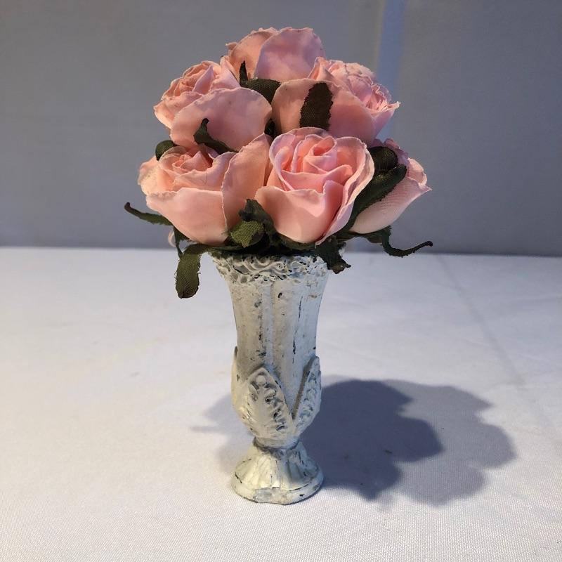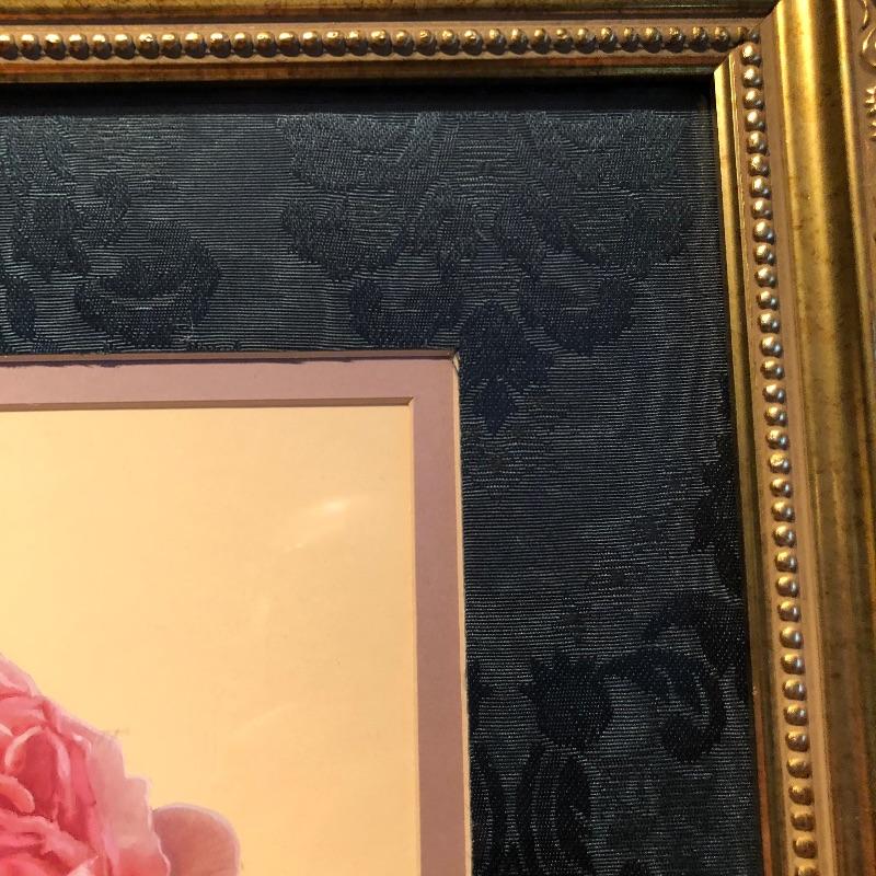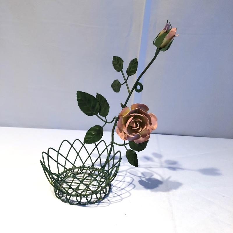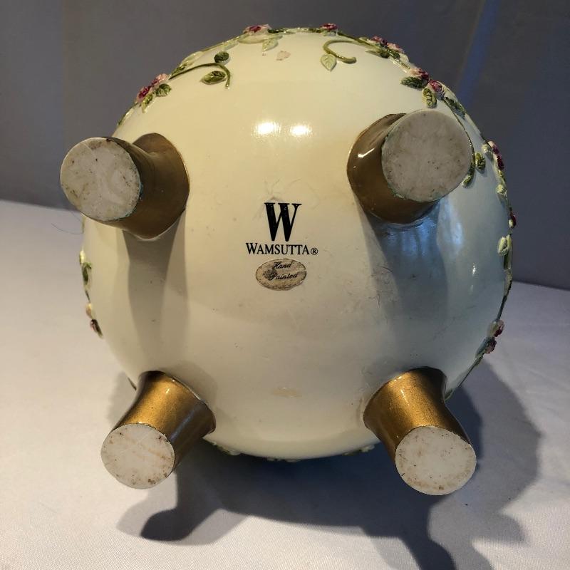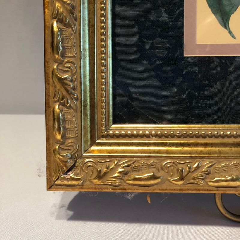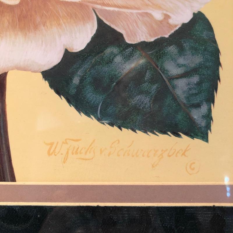 This lovely assortment of decor items all have pink flowers as their common theme. The lovely signed artwork by Waltraud Fuchs Von Schwarzbek is a delightful piece that has been mounted in a beautiful gold colored frame with a dark green damask matting that compliments the art perfectly. Other items include a plastic footed rose adorned urn, a hanging window stained glass piece in the shape of a heart, a wooden box, metal small plant stand and a tiny resin vase with faux flowers.