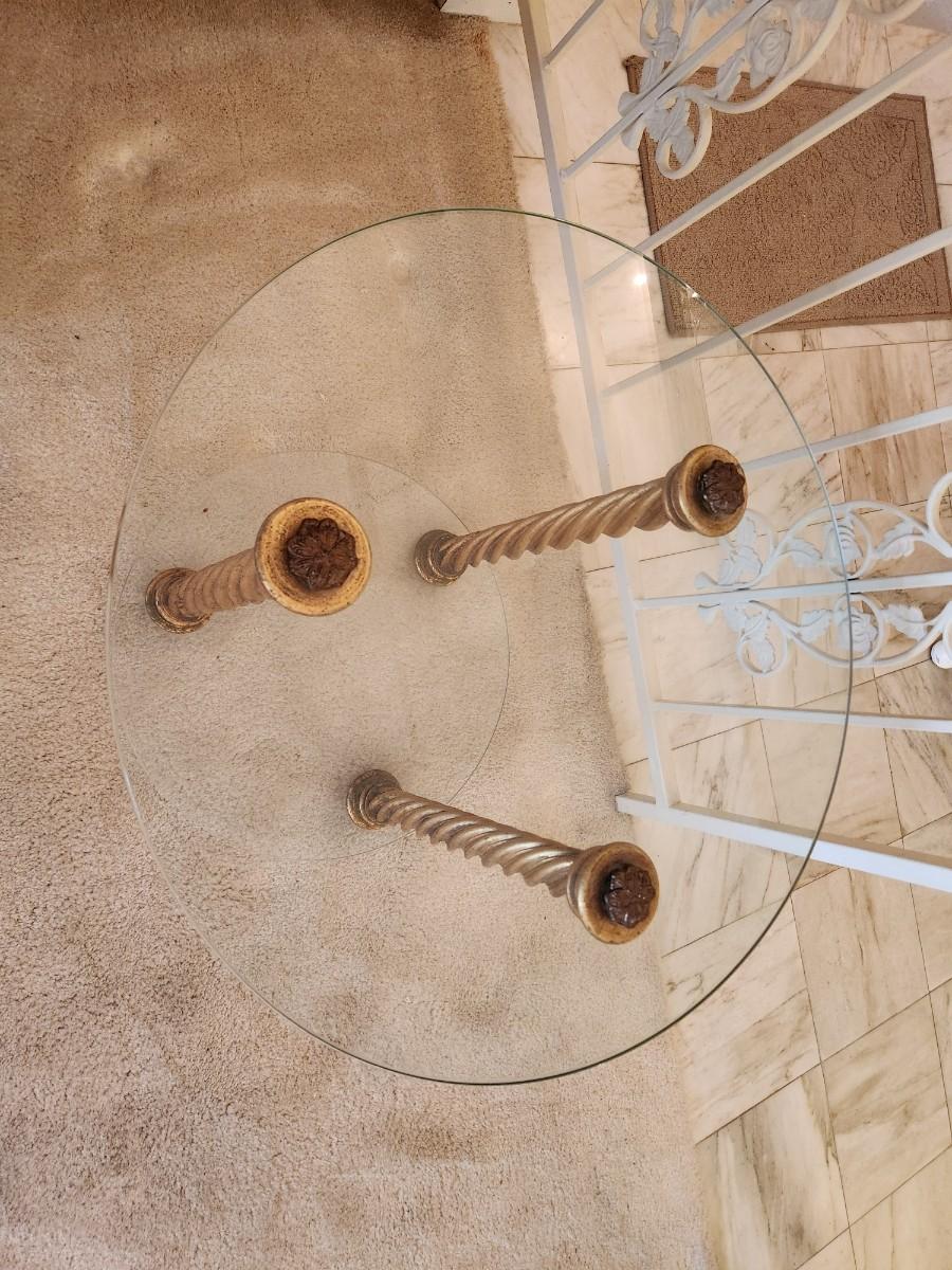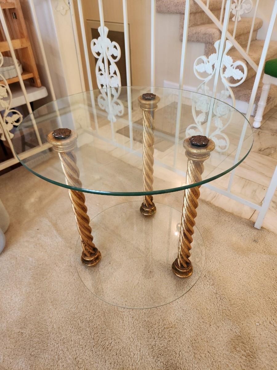 Vintage Hollywood Regency style side table - Glass top and bottom. Very good condition. 24" across, 21" tall.