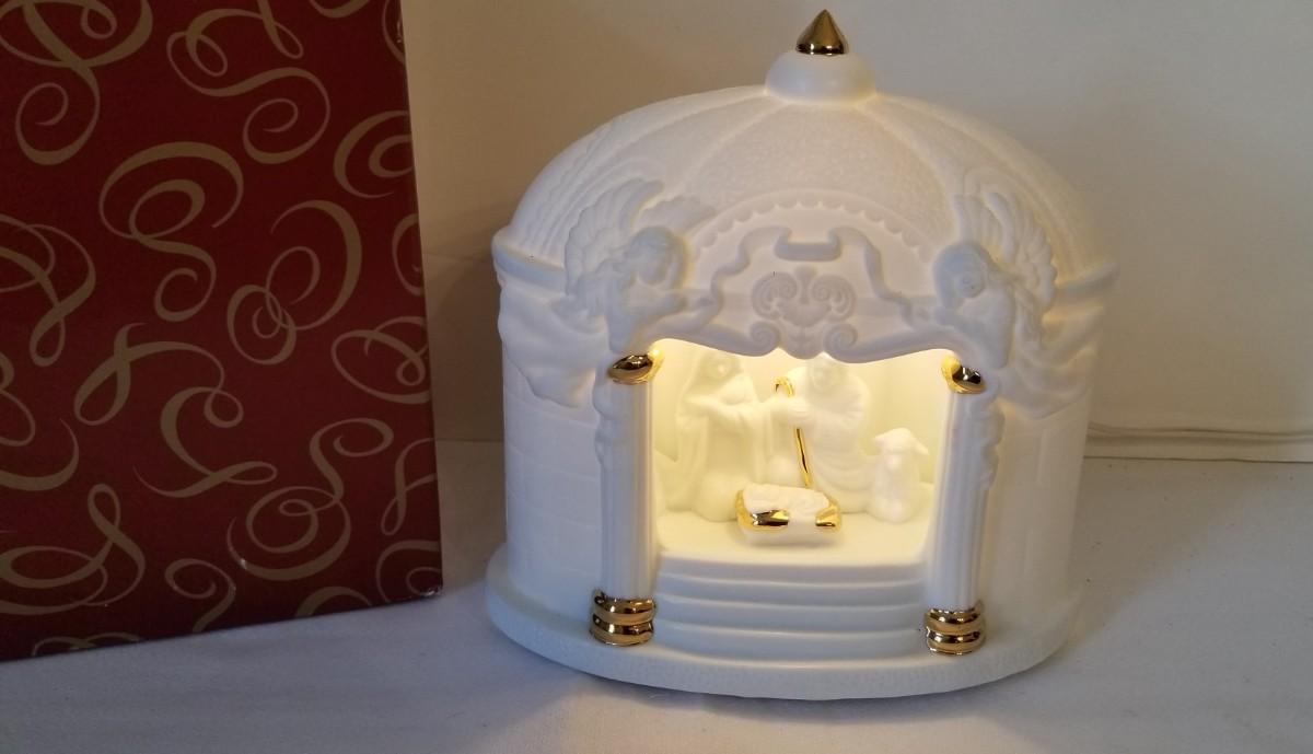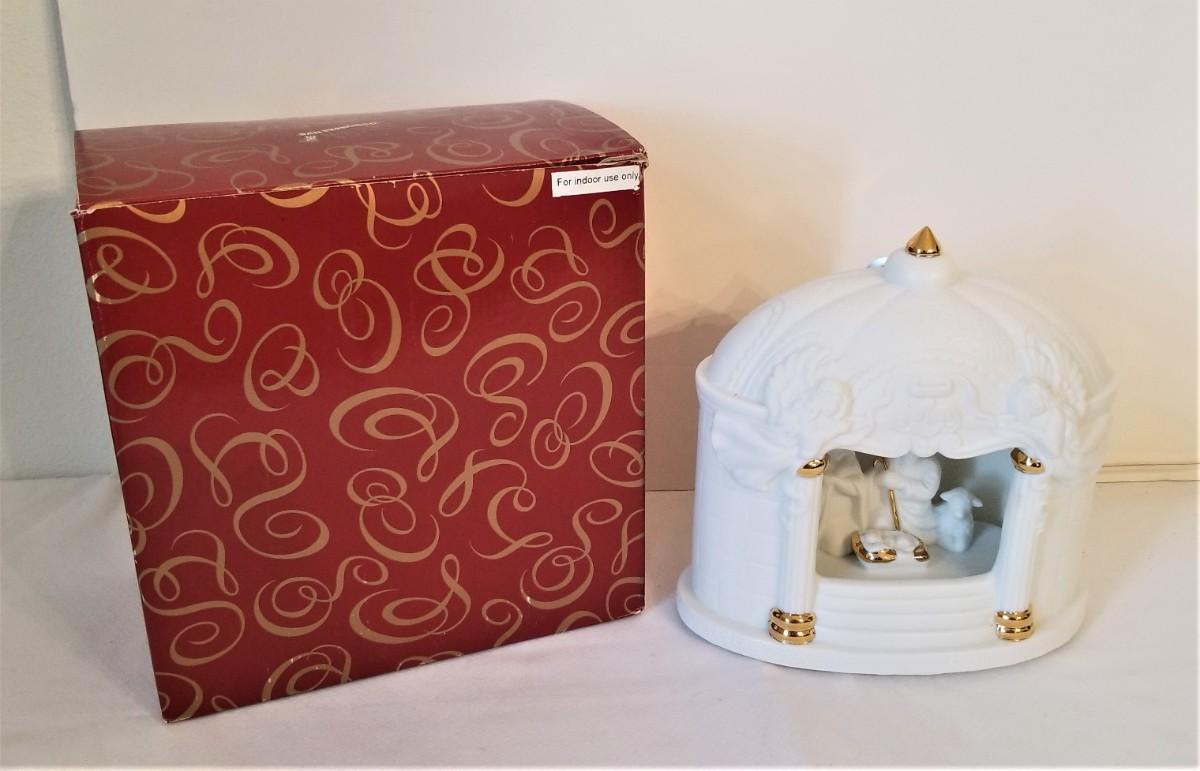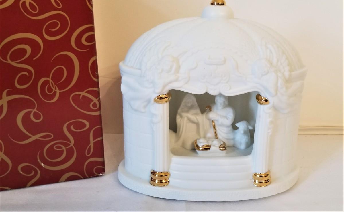 Porcelain Christmas Nativity from the San Francisco Music Box Company - original box - lights up and plays "Silent Night". 8.5" tall, 8" across.