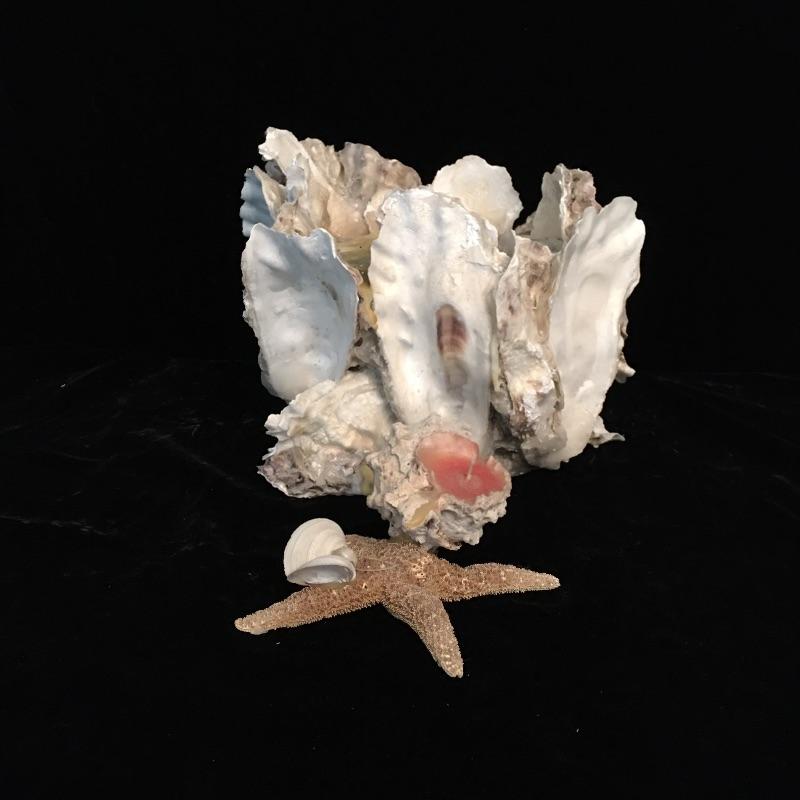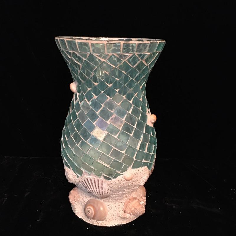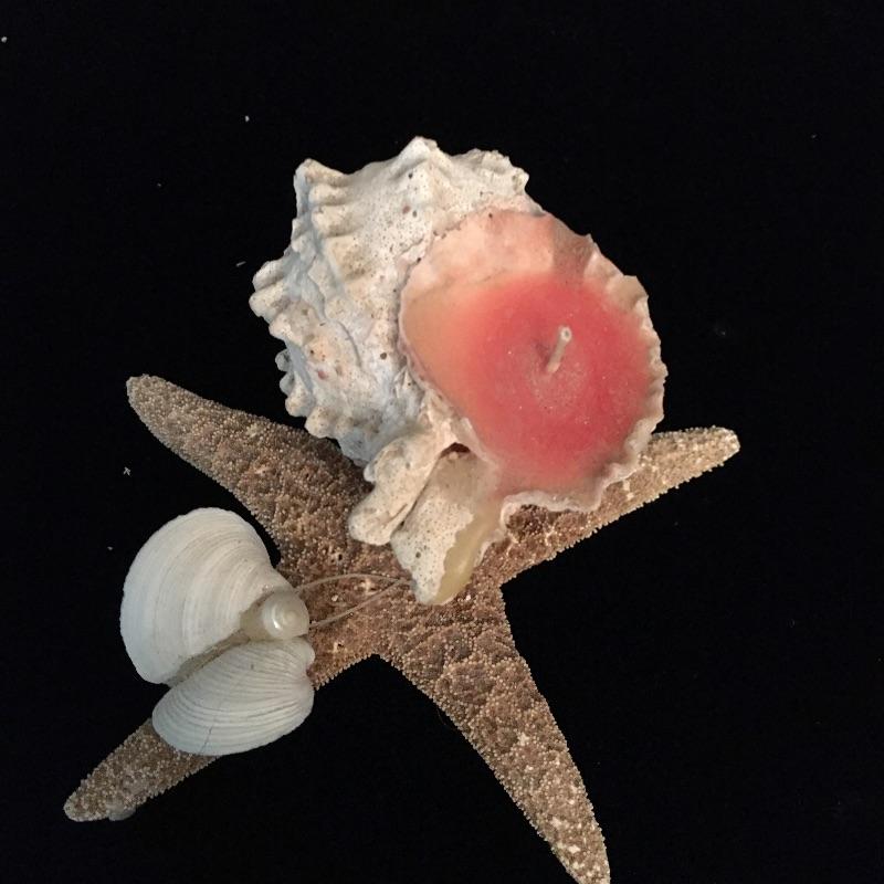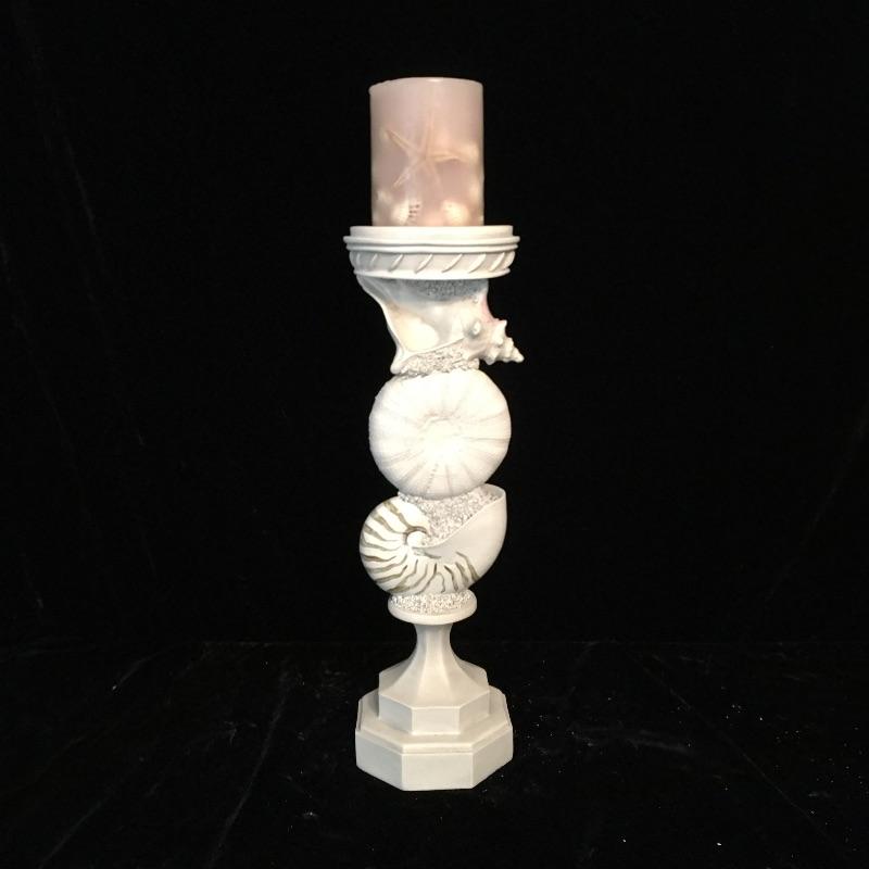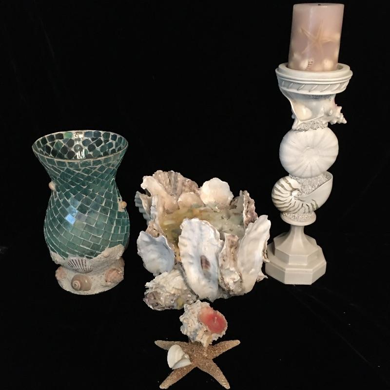 This unique assortment includes a starfish with candle in shell, hurricane glass with shells on bottom, faux shell candle stick and a large circle of shells filled with candle wax. Faux shell candlestick measures 5”D x 19.5” tall.