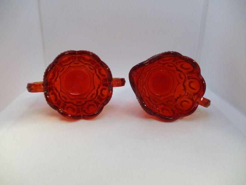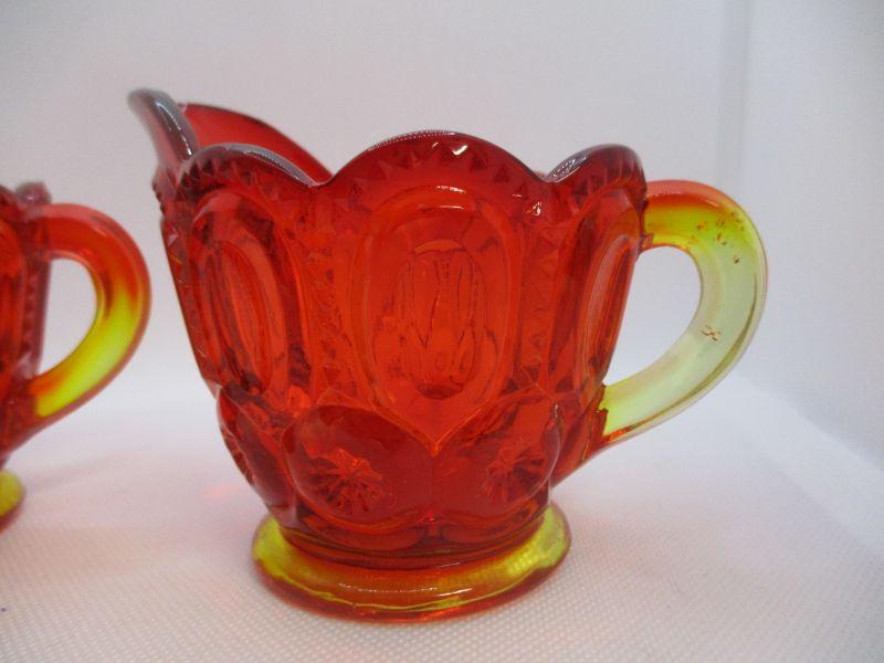 Very pretty cream and sugar set by (I believe based on the handles) Smith Glass. It is the amberina color that has a blend of yellow to orange to red. The only issue that I found was a very tiny rough spot on the edge of the sugar. Not really enough to be a fleabite, but you can feel it with your finger.