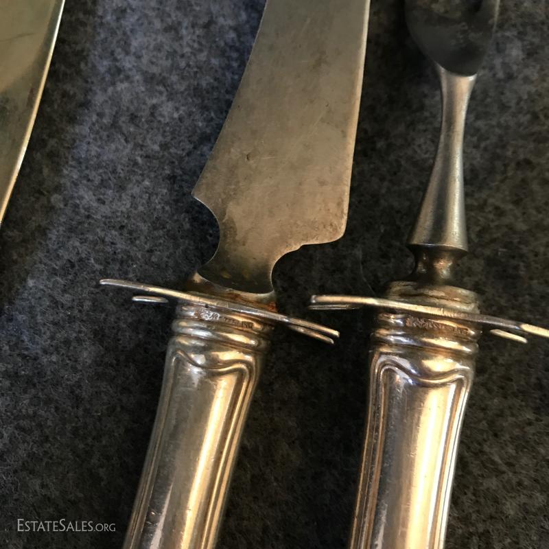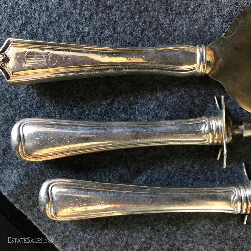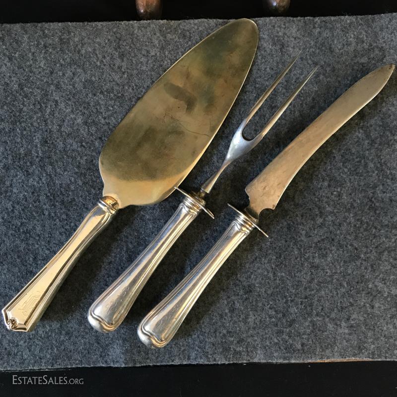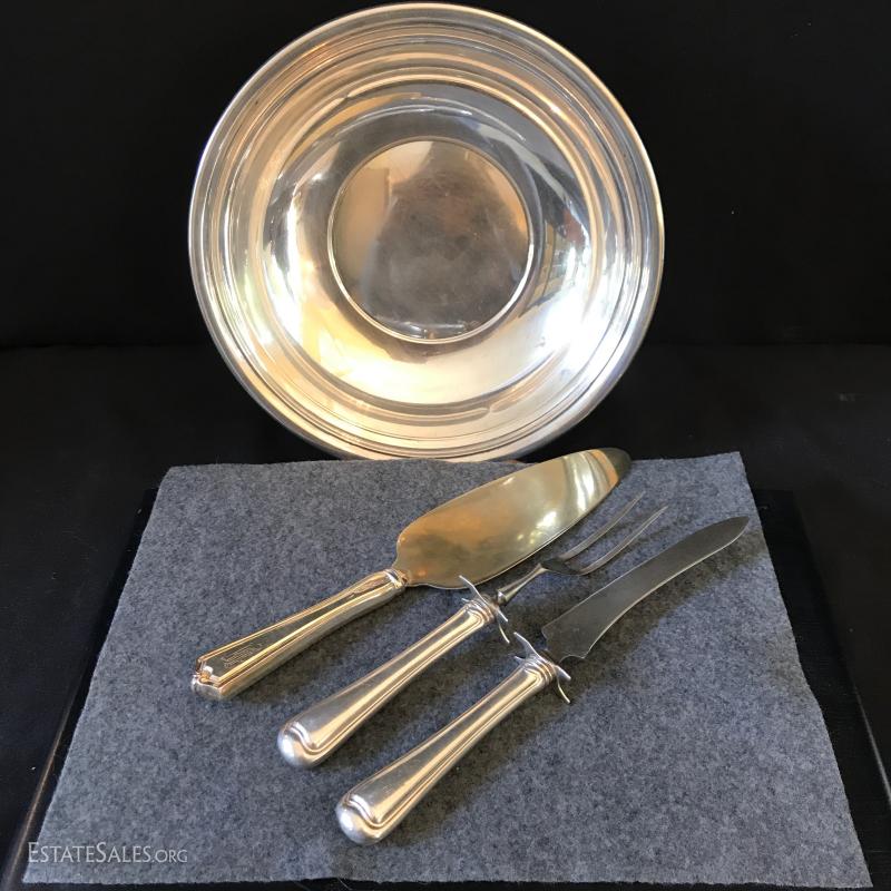 Silver bowl marked "Lord Saybrook International Sterling D342" measures 10" diameter. Serving pieces have engravings on handle marked Sterling. Classic pieces to add to your collection. See photos for details. Shipping available or local pick up in Flat Rock, NC.