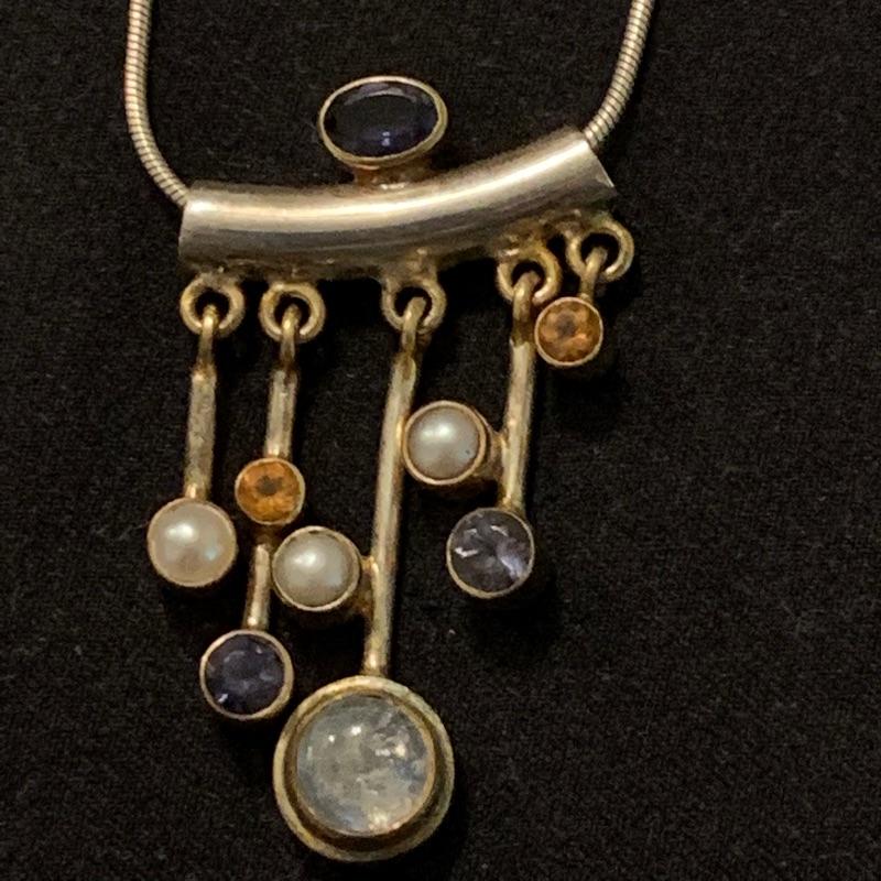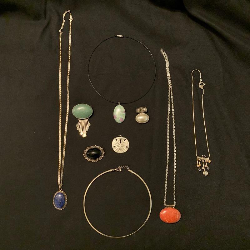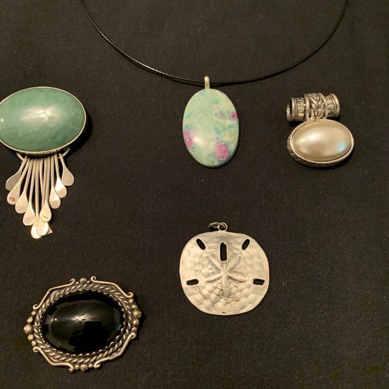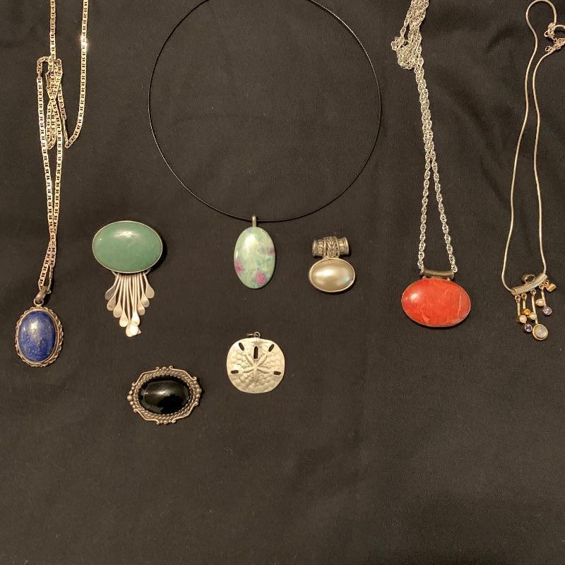 Lovely lot of some hand made pieces including one pendant/pin combo with what appears to be jade with sterling dangles, three other stone pieces and one multi gem with pearls and moonstone pendant. All chains are 925 and three other pendants with one being a sand dollar pewter piece. The nice part of this lot is you can swap pieces out on the chains and neck cuffs. Longest chain measures 15” and the Jade is the largest stone in lot measuring 2” x 1.5”. Shipping available.