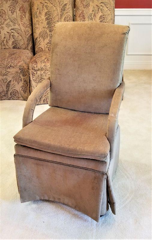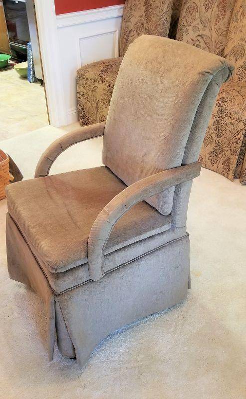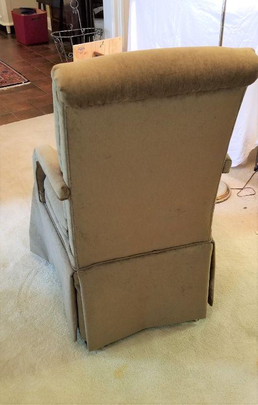Velveteen covered armchair on wheels - good condition. Measures 22" across, 22" deep and 40" tall.