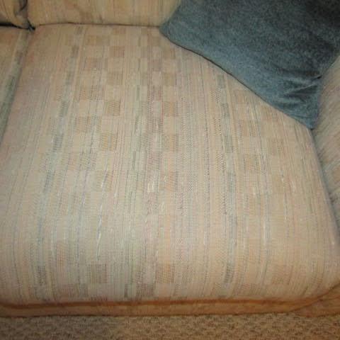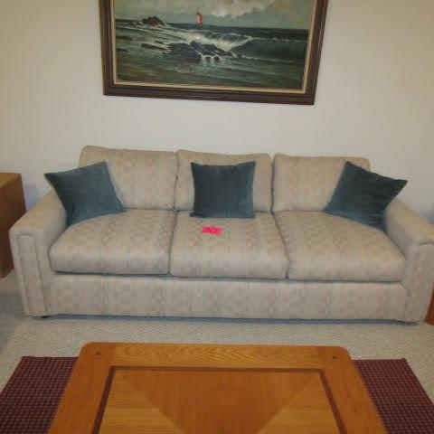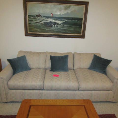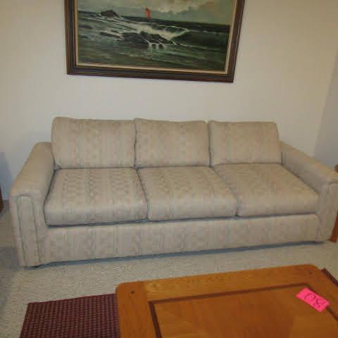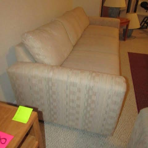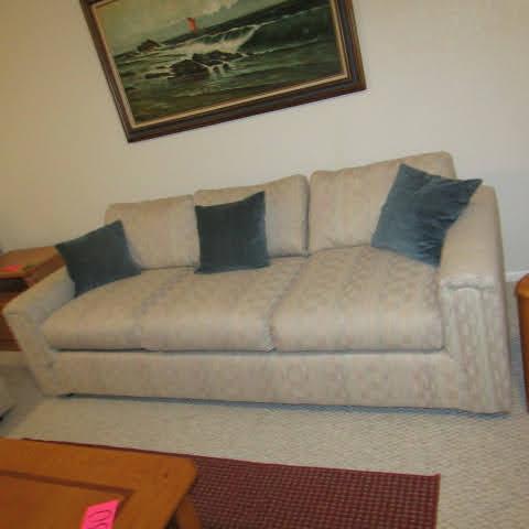 CREAM SOFA COUCH WITH LIGHT CHECK PATTERN. MEASURES APPROXIMATELY 83x34. COMES WITH 3 SMALL BLUE THROW PILLOWS AND MATCHES THE LOVESEAT