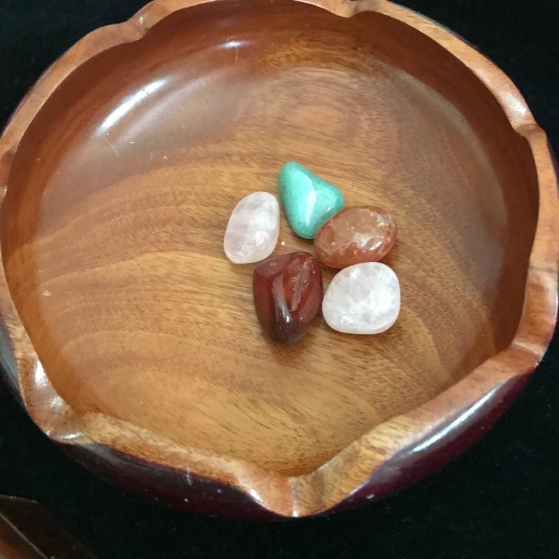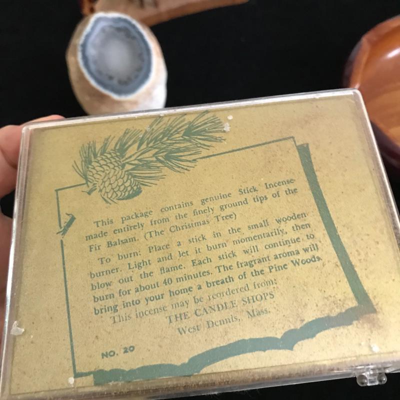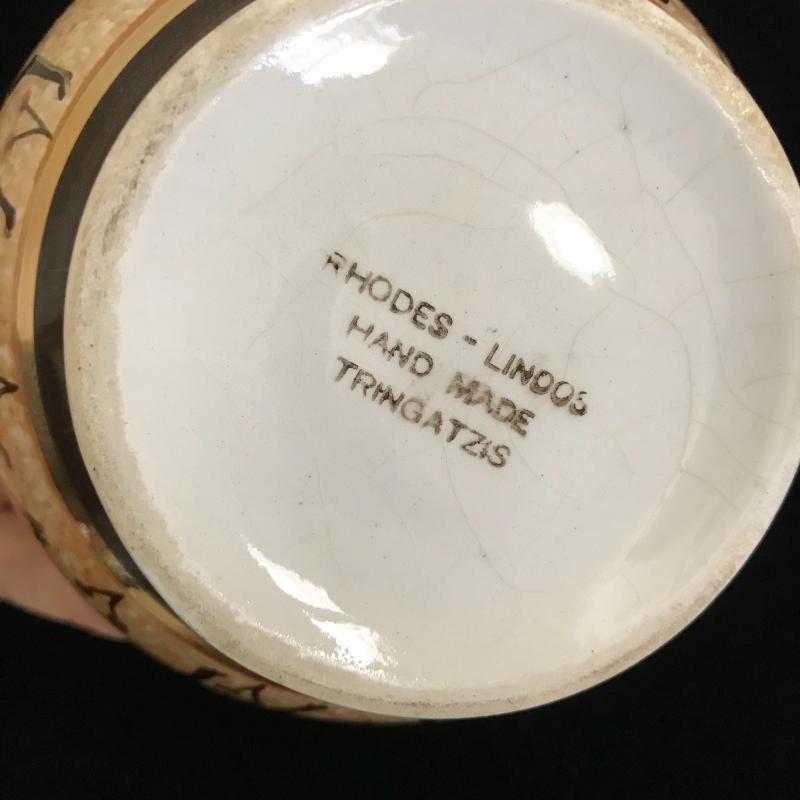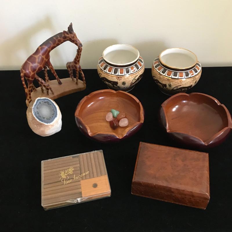 Lot includes two pieces of pottery marked “Rhodes - Lindos handmade Tringatzis”, wooden giraffe carving, two wooden bowls, wooden box, box of incense, and geode. No shipping available. Local pickup only in Hendersonville, NC.