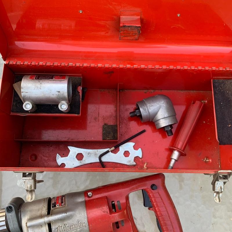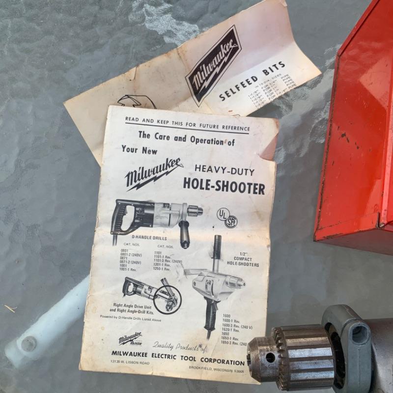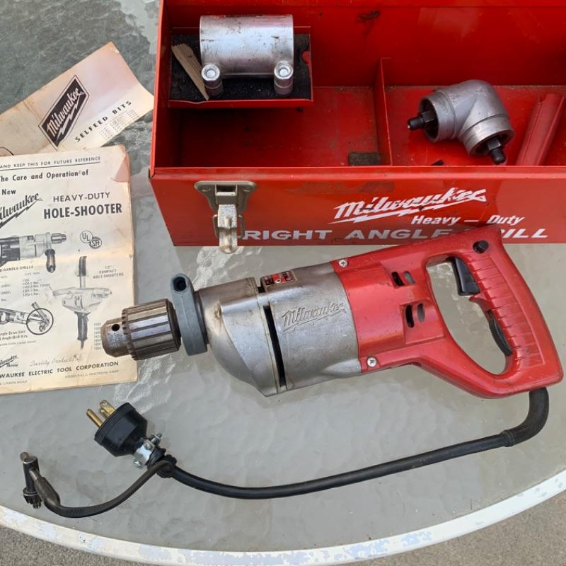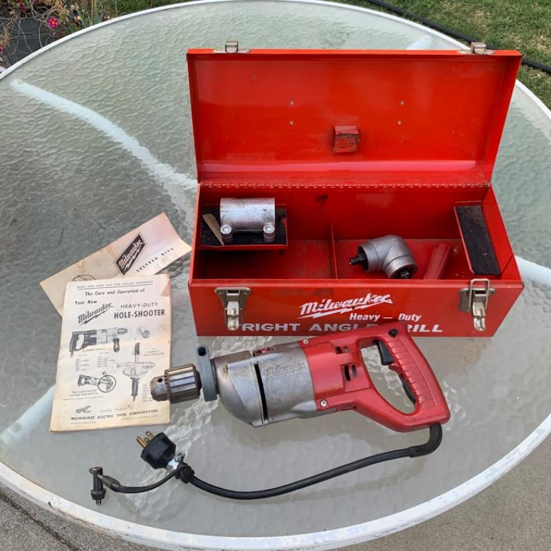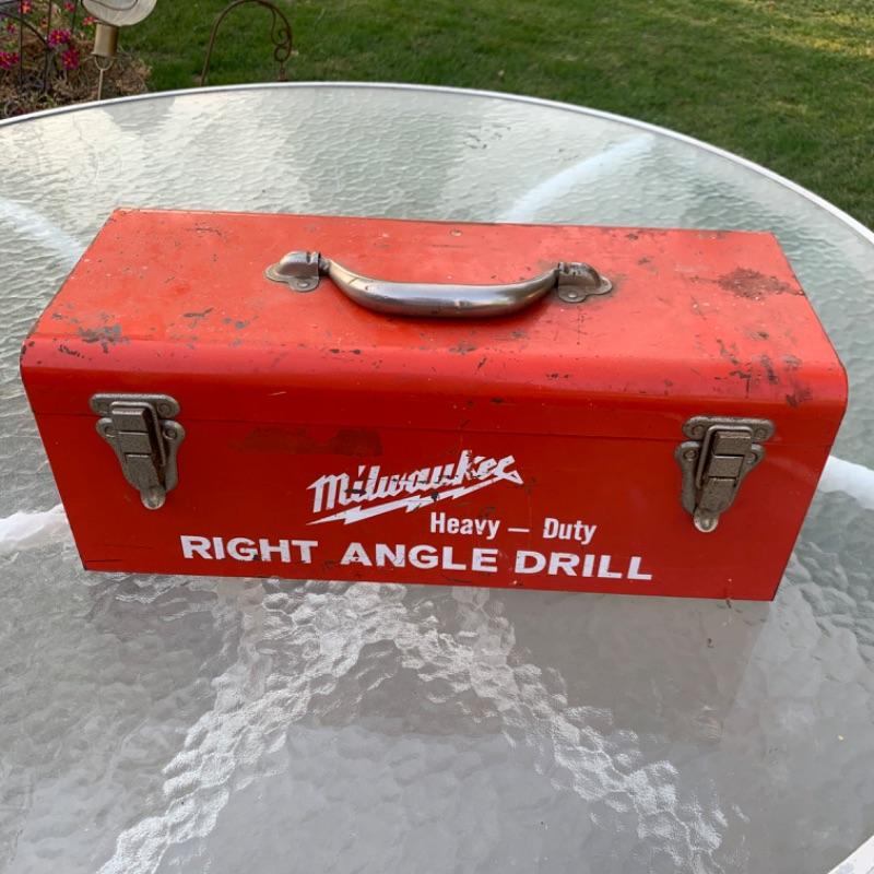 Vintage Milwaukee Heavy Duty Right Angle Drill with accestand red metal storage toolbox. Powers up without issue, but has not been tested.
