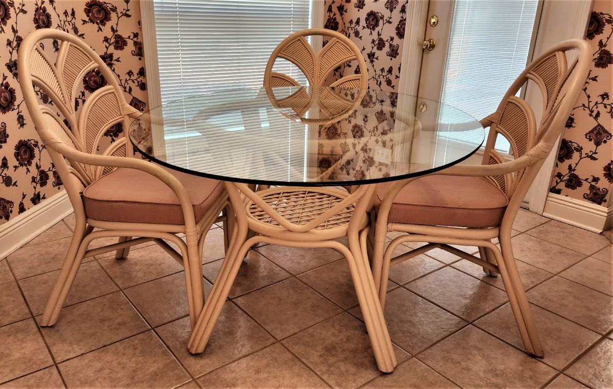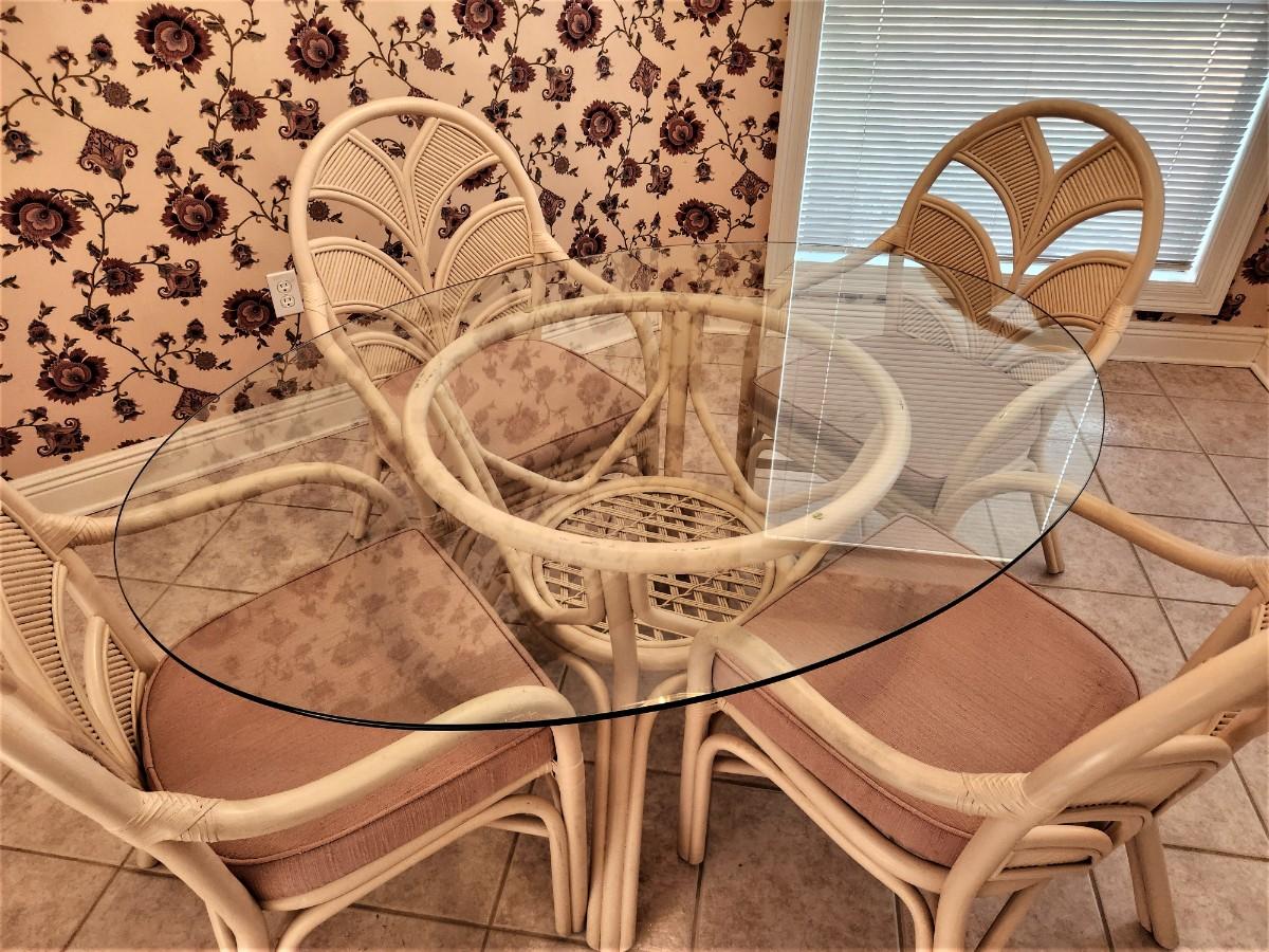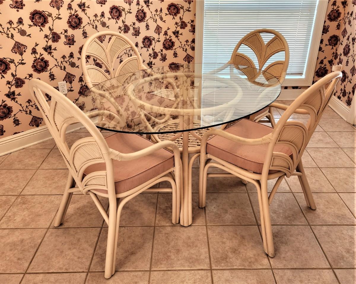 Nice vintage rattan glass table/chair set - 4 chairs. Table is 40" x 54", 28" tall - each chair is 20" across at the arms and 37" tall. Gently used condition - no major issues. Perfect for the beach house, first apartment, or covered patio.