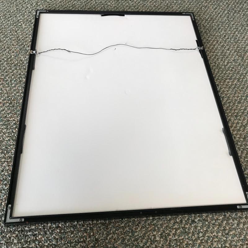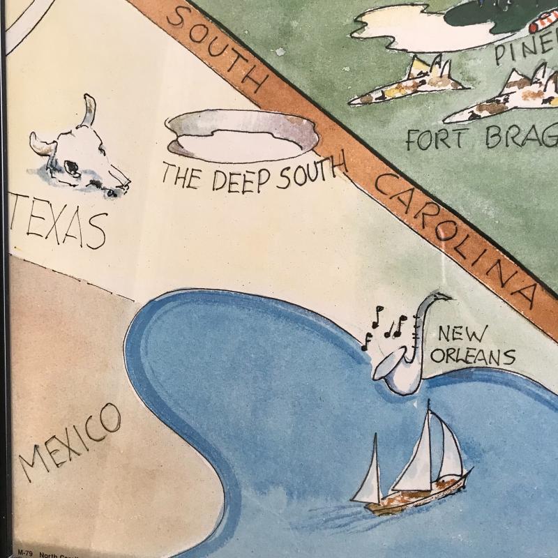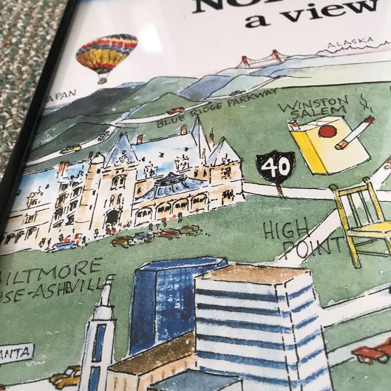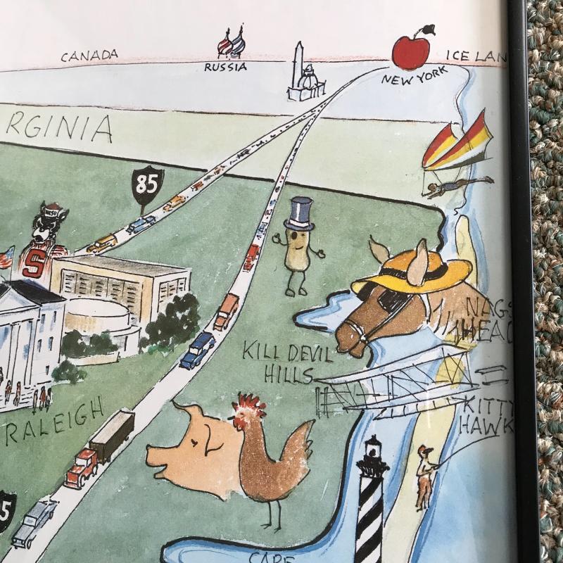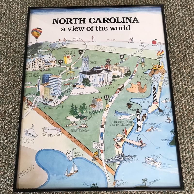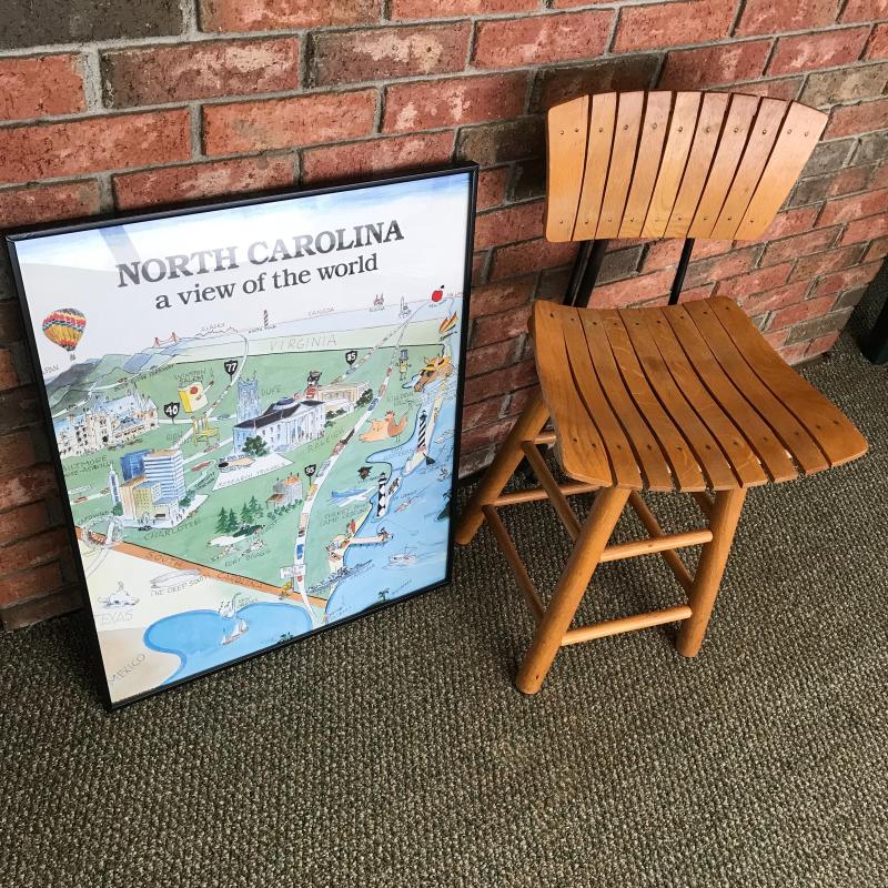 Sitting on top of the world! Comedic rendition of the great state of North Carolina in a metal black frame. Art is accompanied by a sturdy wooden stool with metal accents. No shipping.