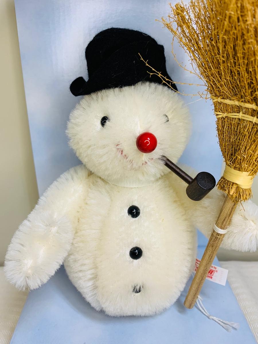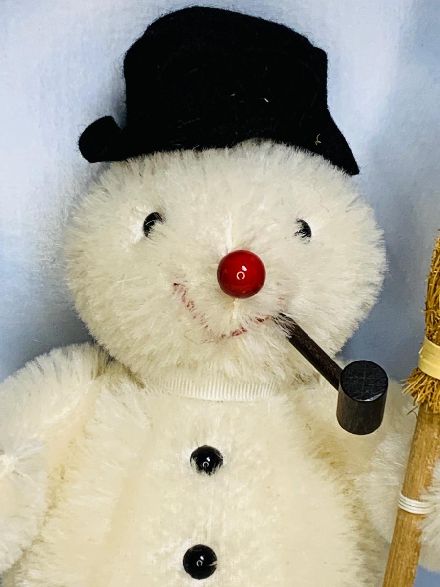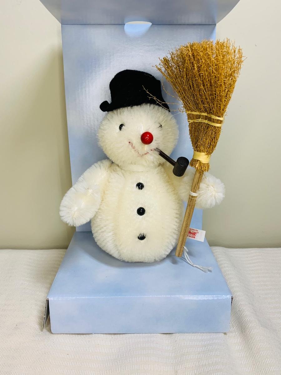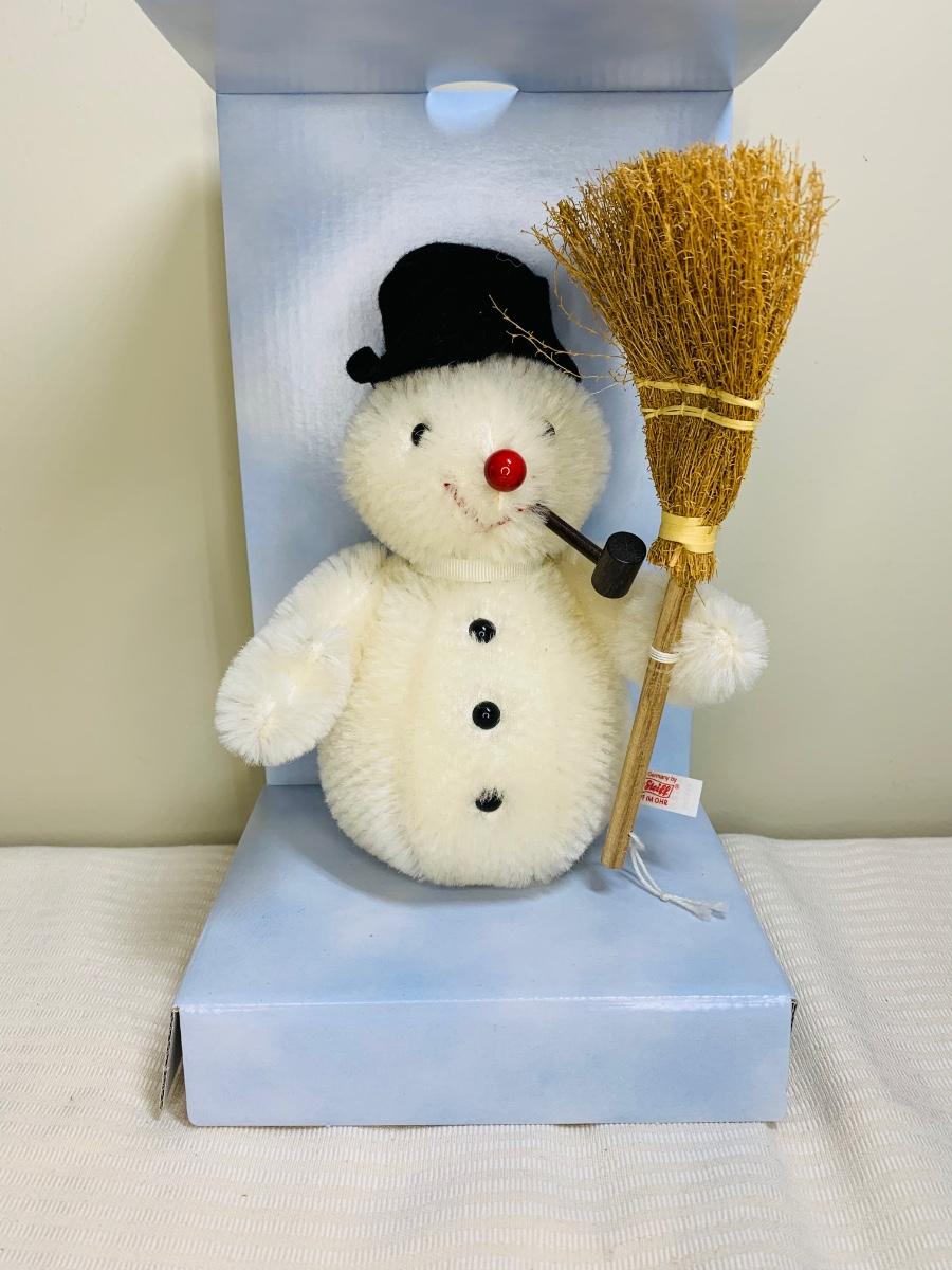 Steiff Roly Poly Snowman with a cheery red nose, wooden pipe, and inviting grin, he dares you not to smile. Snowman is made from pure white mohair. Featuring a hand-sewn, floppy felt hat atop his head and a straw broom in his hand, This Steiff plush toy is hand made in Germany and carries the signature "Button in Ear" trademark and chest tag. The Height is 6"