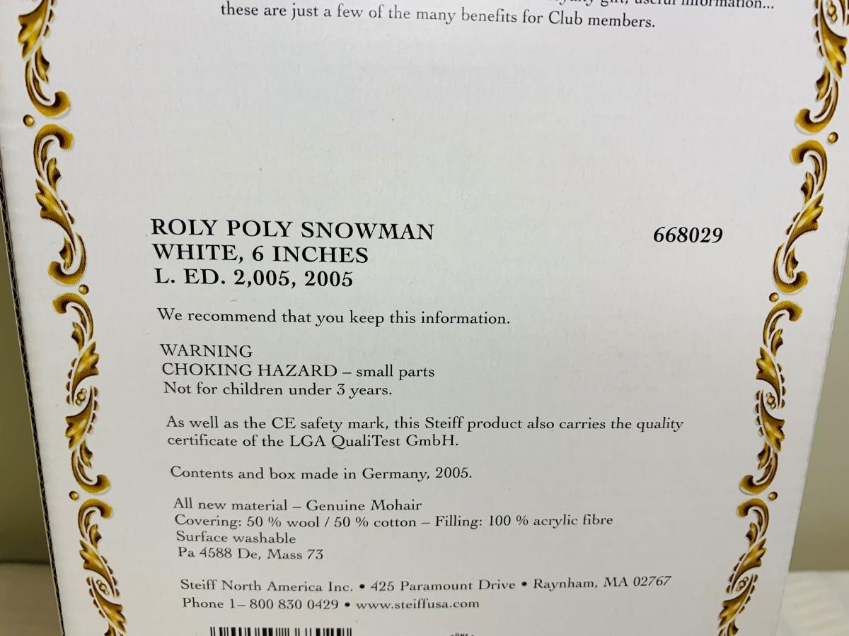 LOT 55R: Steiff Roly Poly Snowman in Original Box w/COA