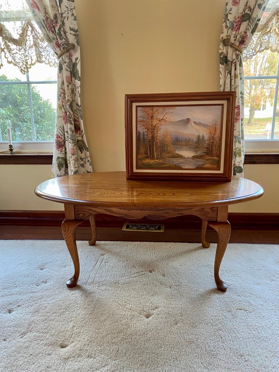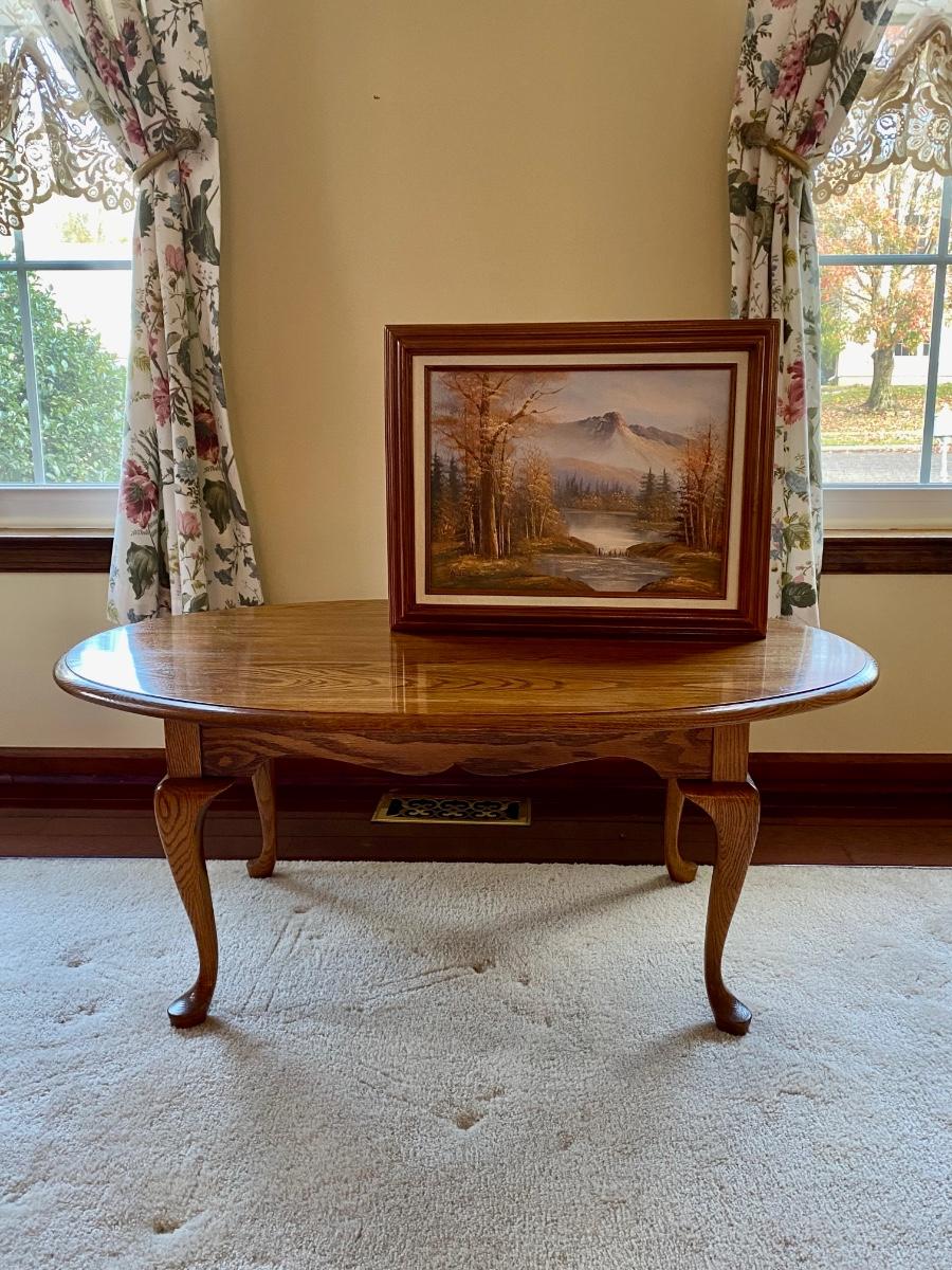 Table measures 42”x 26”x 16”. Includes framed signed painting. Please see all pictures as they are the best representation of the items. The pictures show condition, measurements if taken, and what is included in the lot. Due to the large amount that we photograph and the time frame, we are not always able to take measurements. All items unless noted, are pre-owned and have been used. If you purchased furniture, you must bring help. We do not allow one person to carry large furniture out on their own. Bring help, tools and a truck for the safety of our client’s homes, and your personal safety. Any damages that result to the property including walls, and floors due to moving of the furniture will be charged to the buyer. Company policy. Thank you.