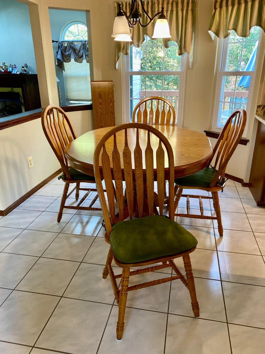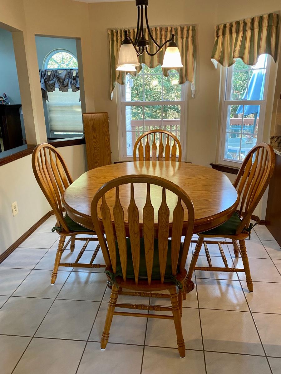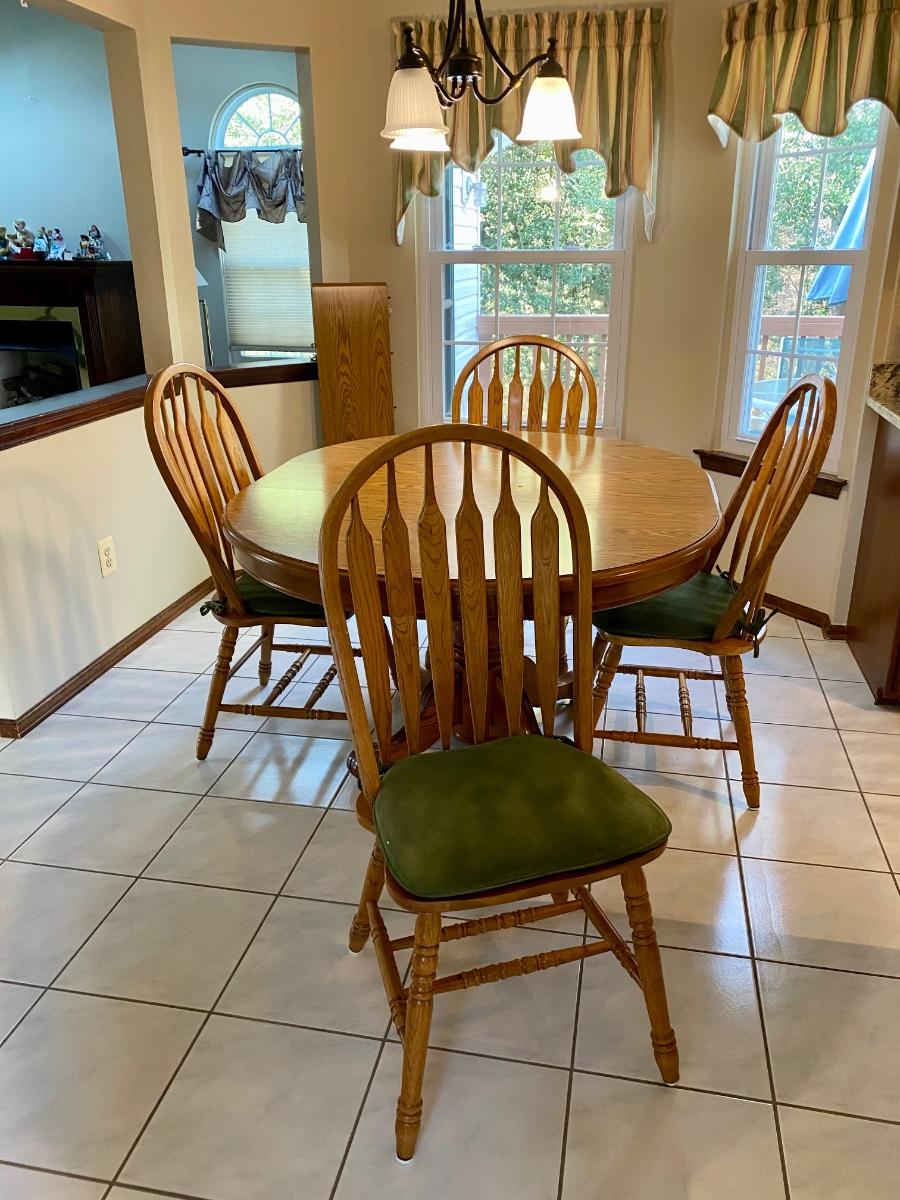 Table measures 48” without added table leaf, 72” with table leaf. Table includes 4 chairs. Please see all pictures as they are the best representation of the items. The pictures show condition, measurements if taken, and what is included in the lot. Due to the large amount that we photograph and the time frame, we are not always able to take measurements. All items unless noted, are pre-owned and have been used. If you purchased furniture, you must bring help. We do not allow one person to carry large furniture out on their own. Bring help, tools and a truck for the safety of our client’s homes, and your personal safety. Any damages that result to the property including walls, and floors due to moving of the furniture will be charged to the buyer. Company policy. Thank you.