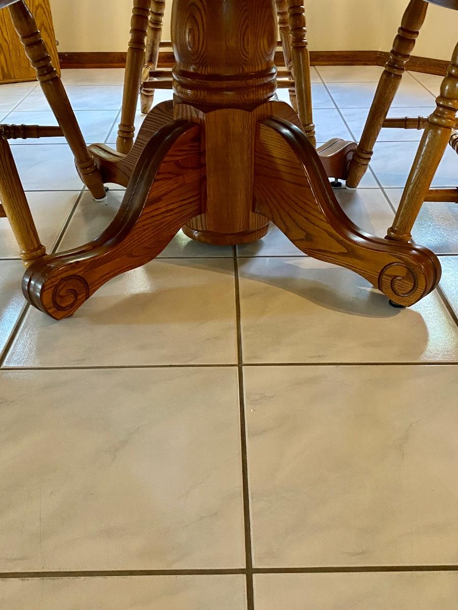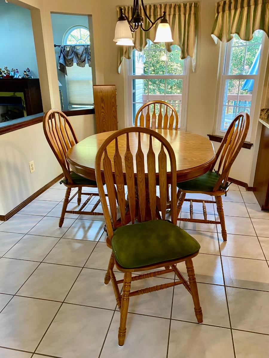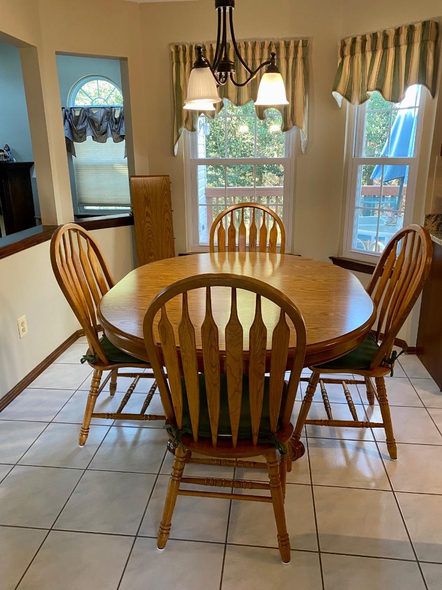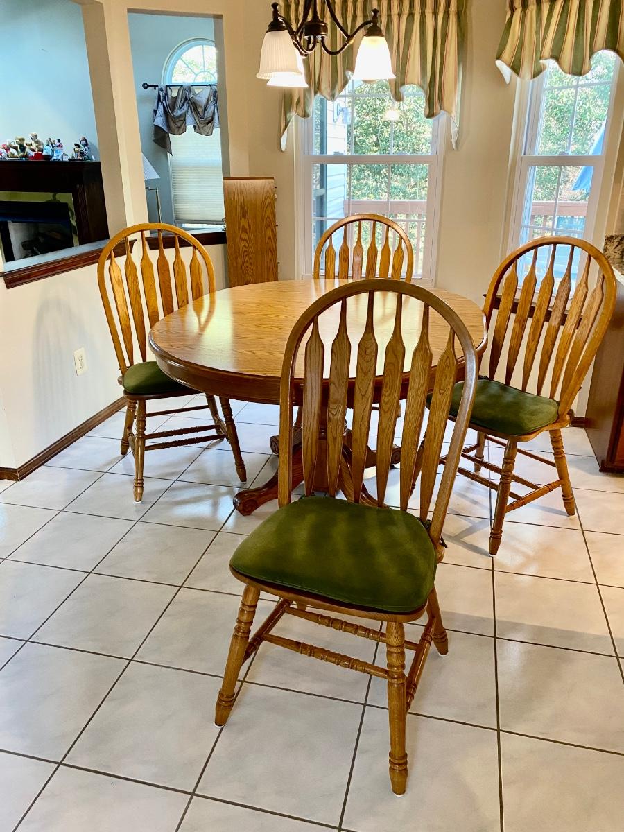 Table measures 48” without added table leaf, 72” with table leaf. Table includes 4 chairs. Please see all pictures as they are the best representation of the items. The pictures show condition, measurements if taken, and what is included in the lot. Due to the large amount that we photograph and the time frame, we are not always able to take measurements. All items unless noted, are pre-owned and have been used. If you purchased furniture, you must bring help. We do not allow one person to carry large furniture out on their own. Bring help, tools and a truck for the safety of our client’s homes, and your personal safety. Any damages that result to the property including walls, and floors due to moving of the furniture will be charged to the buyer. Company policy. Thank you.