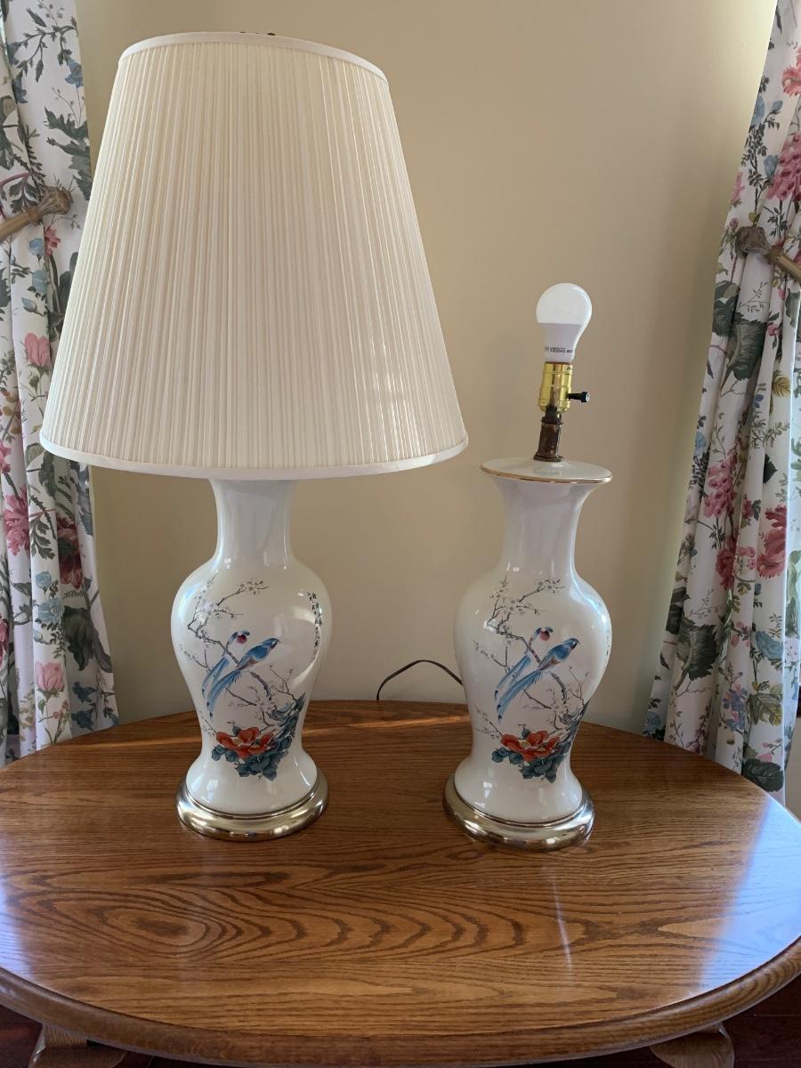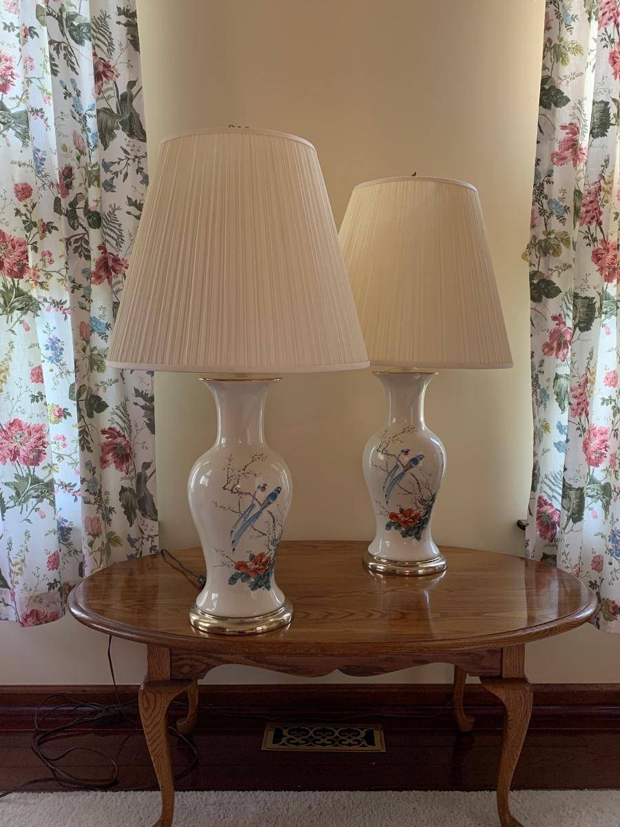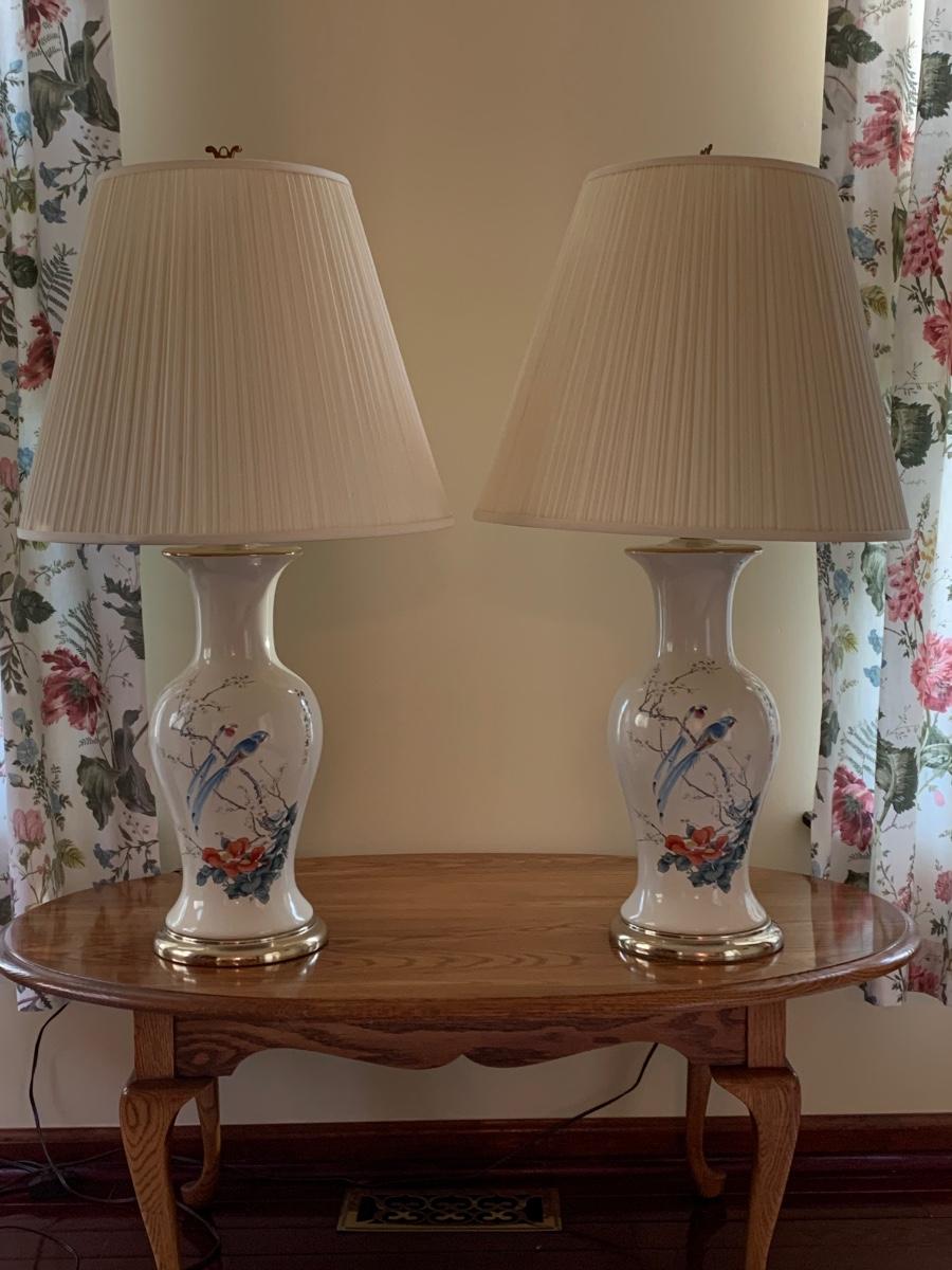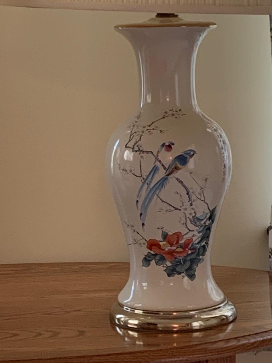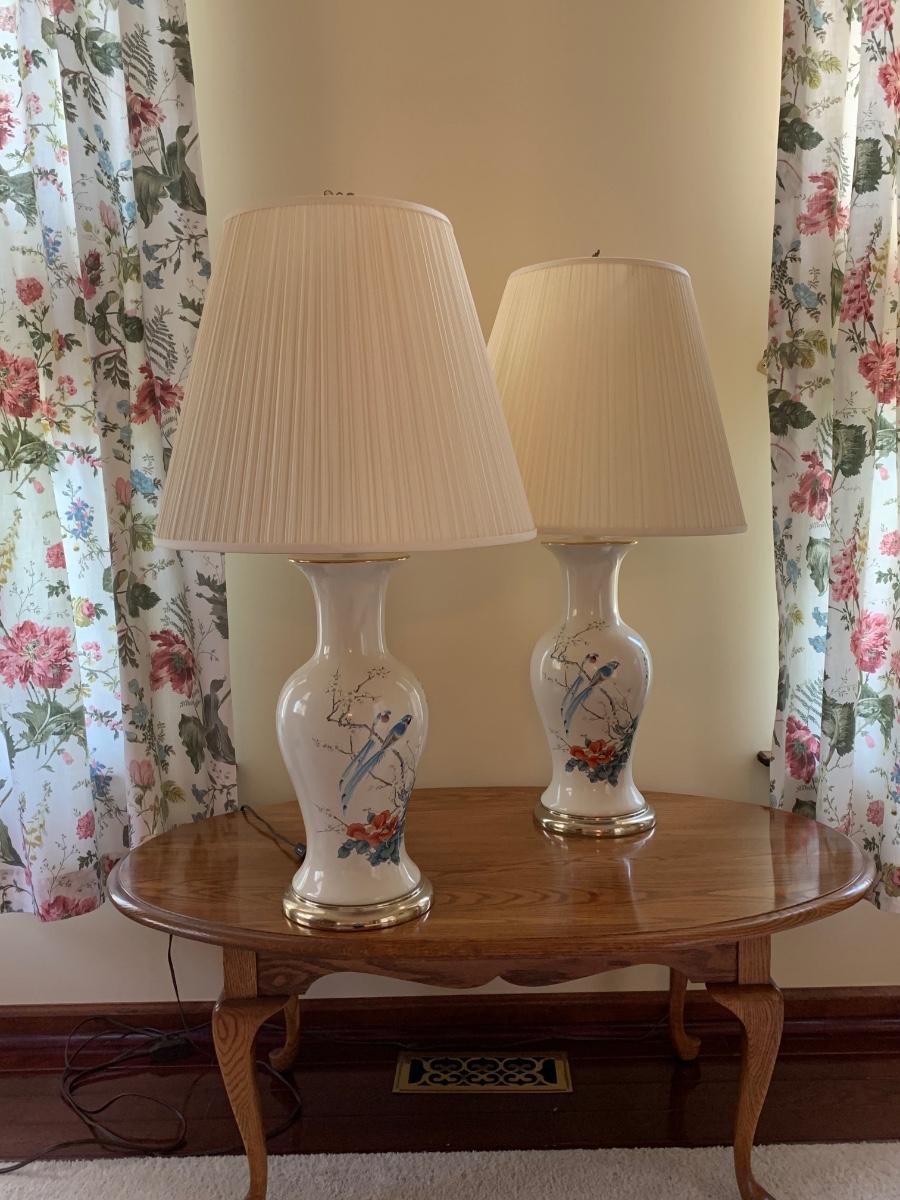 Lovely pair of lamps with Japanese writing up the side and blue long tailed birds. These have brass toned bases and do work. Please see all pictures as they are the best representation of the items. The pictures show condition, measurements if taken, and what is included in the lot. Due to the large amount that we photograph and the time frame, we are not always able to take measurements. All items unless noted, are pre-owned and have been used. If you purchased furniture, you must bring help. We do not allow one person to carry large furniture out on their own. Bring help, tools and a truck for the safety of our client’s homes, and your personal safety. Any damages that result to the property including walls, and floors due to moving of the furniture will be charged to the buyer. Company policy. Thank you.