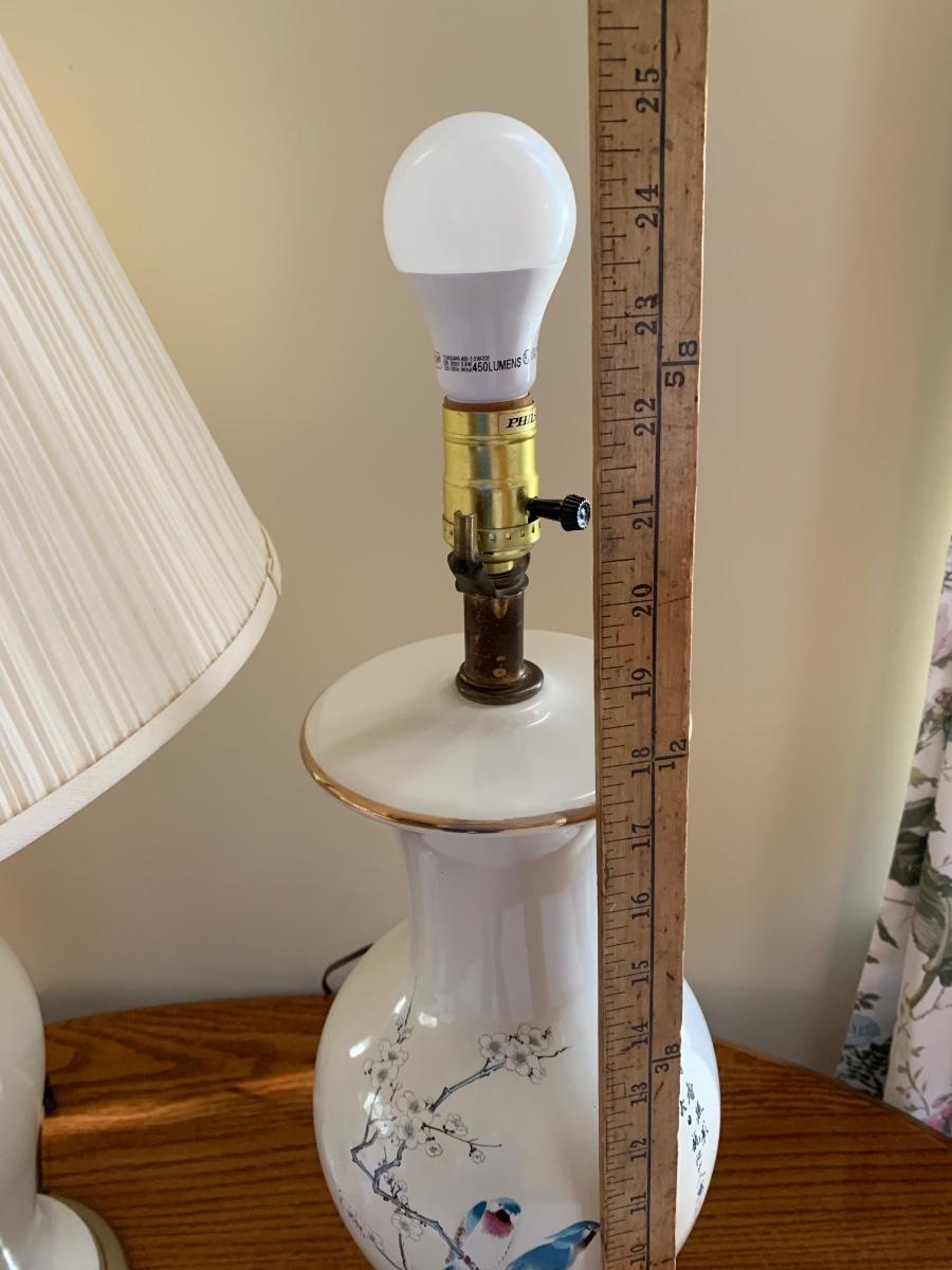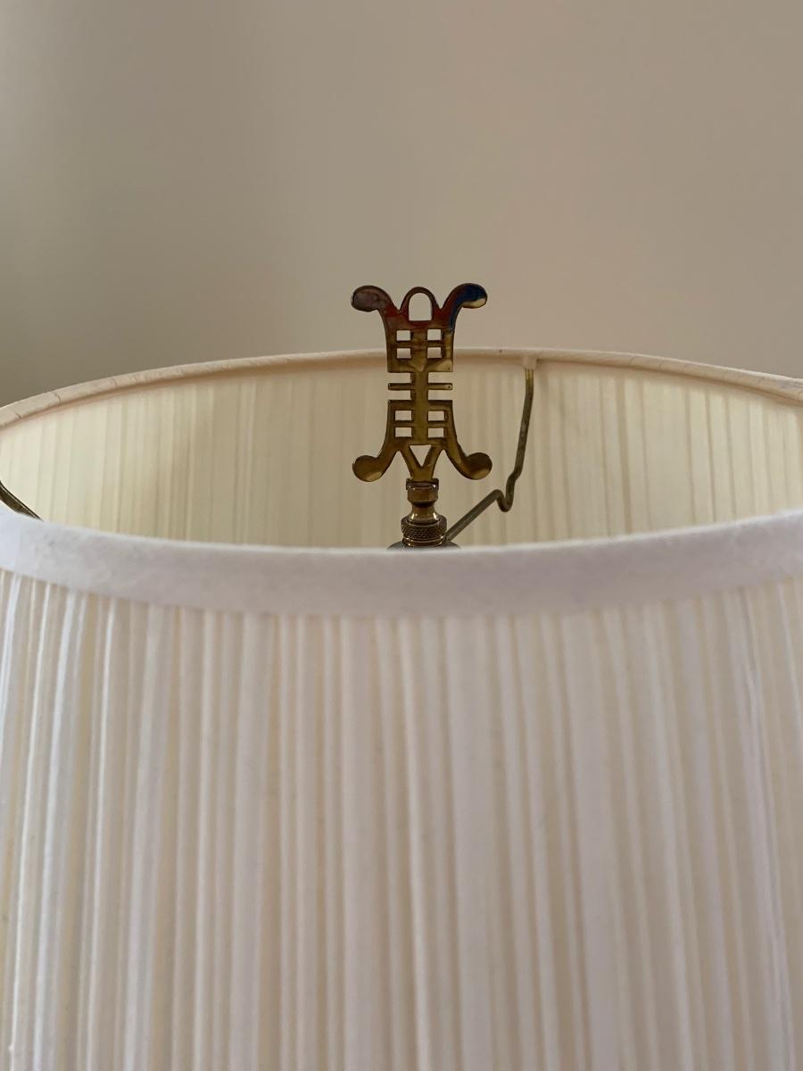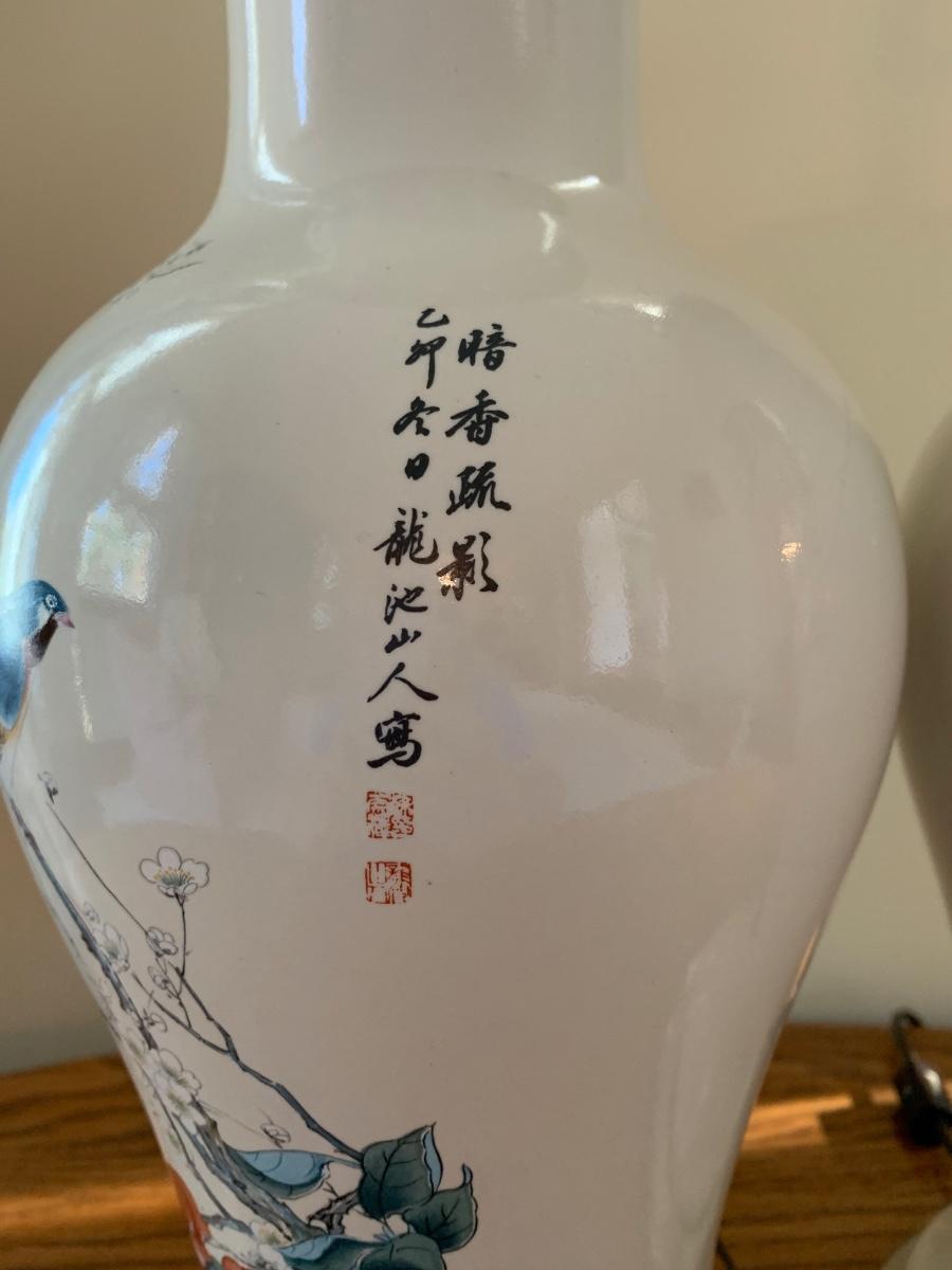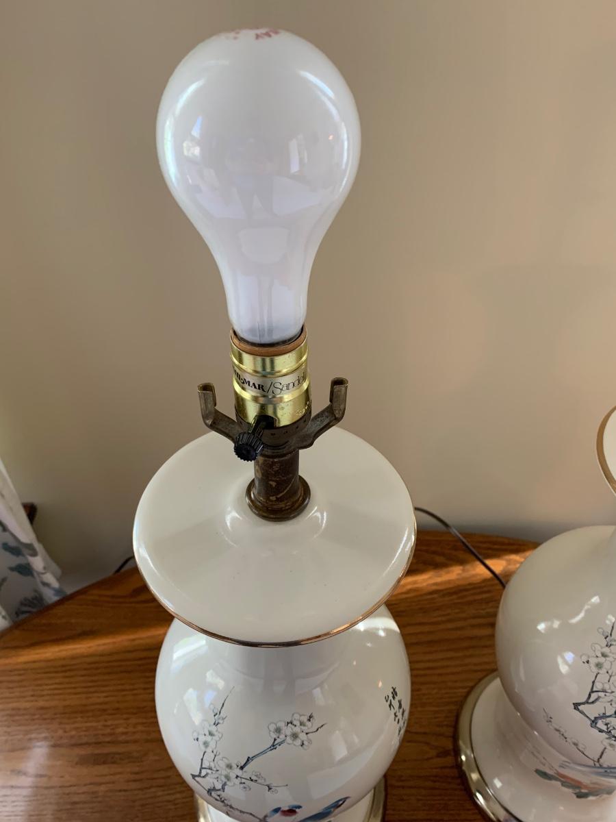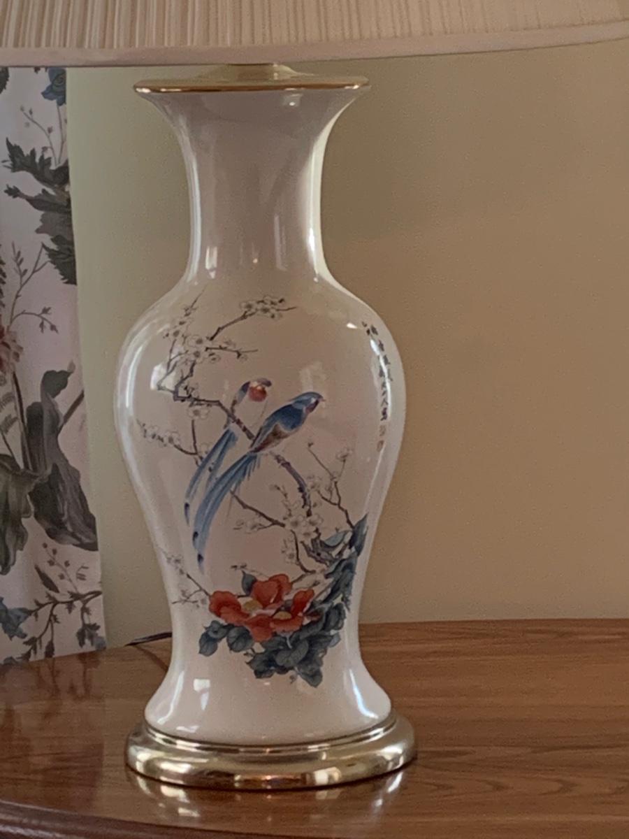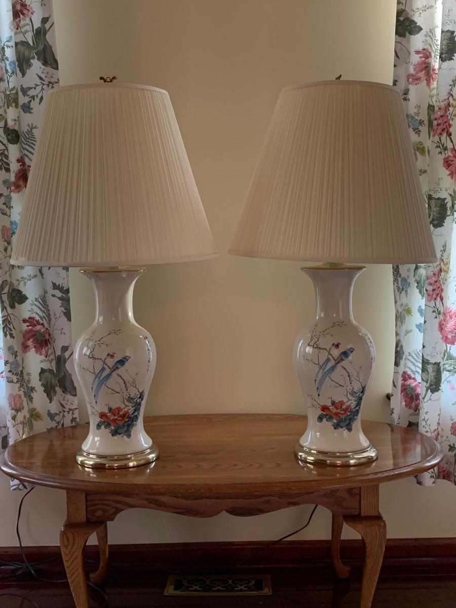 Lovely pair of lamps with Japanese writing up the side and blue long tailed birds. These have brass toned bases and do work. Please see all pictures as they are the best representation of the items. The pictures show condition, measurements if taken, and what is included in the lot. Due to the large amount that we photograph and the time frame, we are not always able to take measurements. All items unless noted, are pre-owned and have been used. If you purchased furniture, you must bring help. We do not allow one person to carry large furniture out on their own. Bring help, tools and a truck for the safety of our client’s homes, and your personal safety. Any damages that result to the property including walls, and floors due to moving of the furniture will be charged to the buyer. Company policy. Thank you.