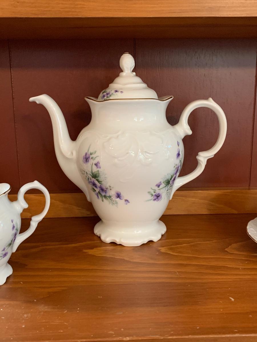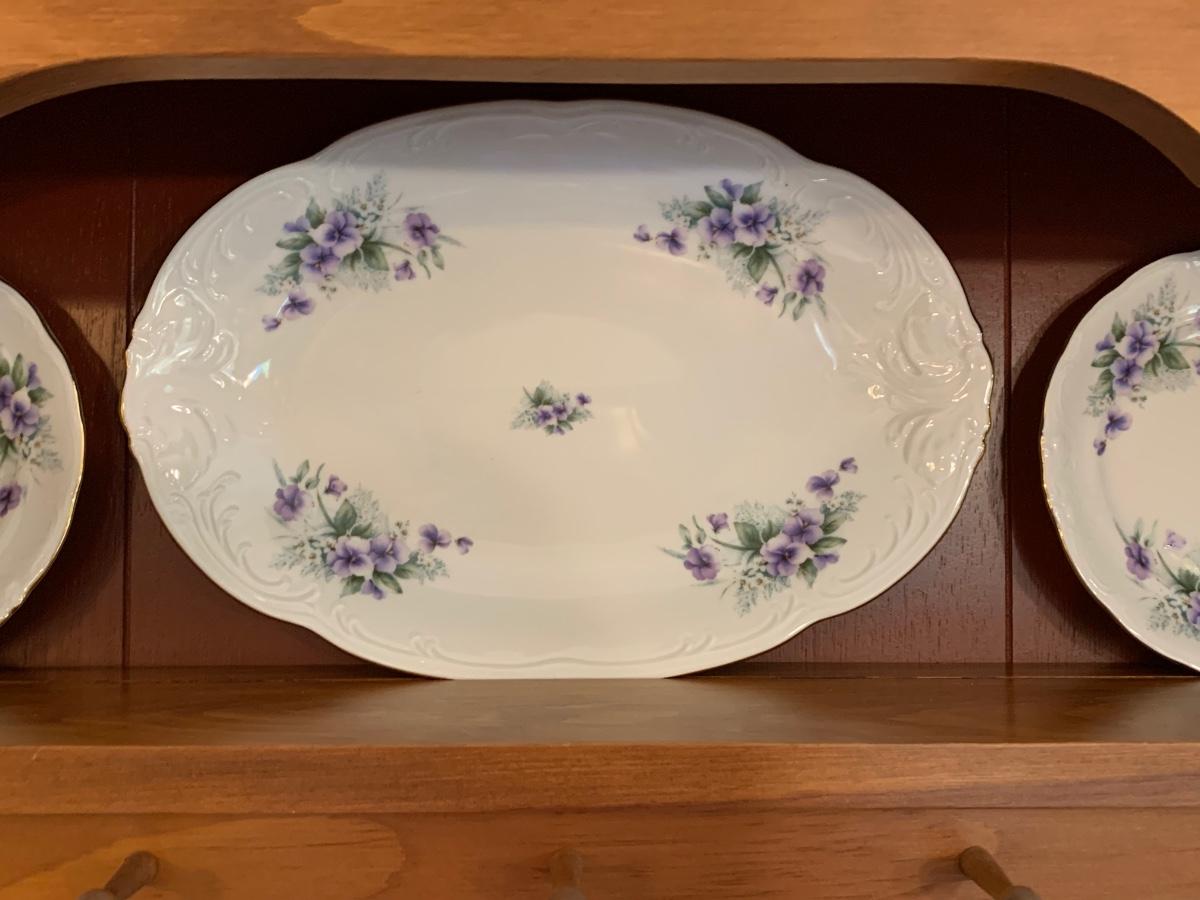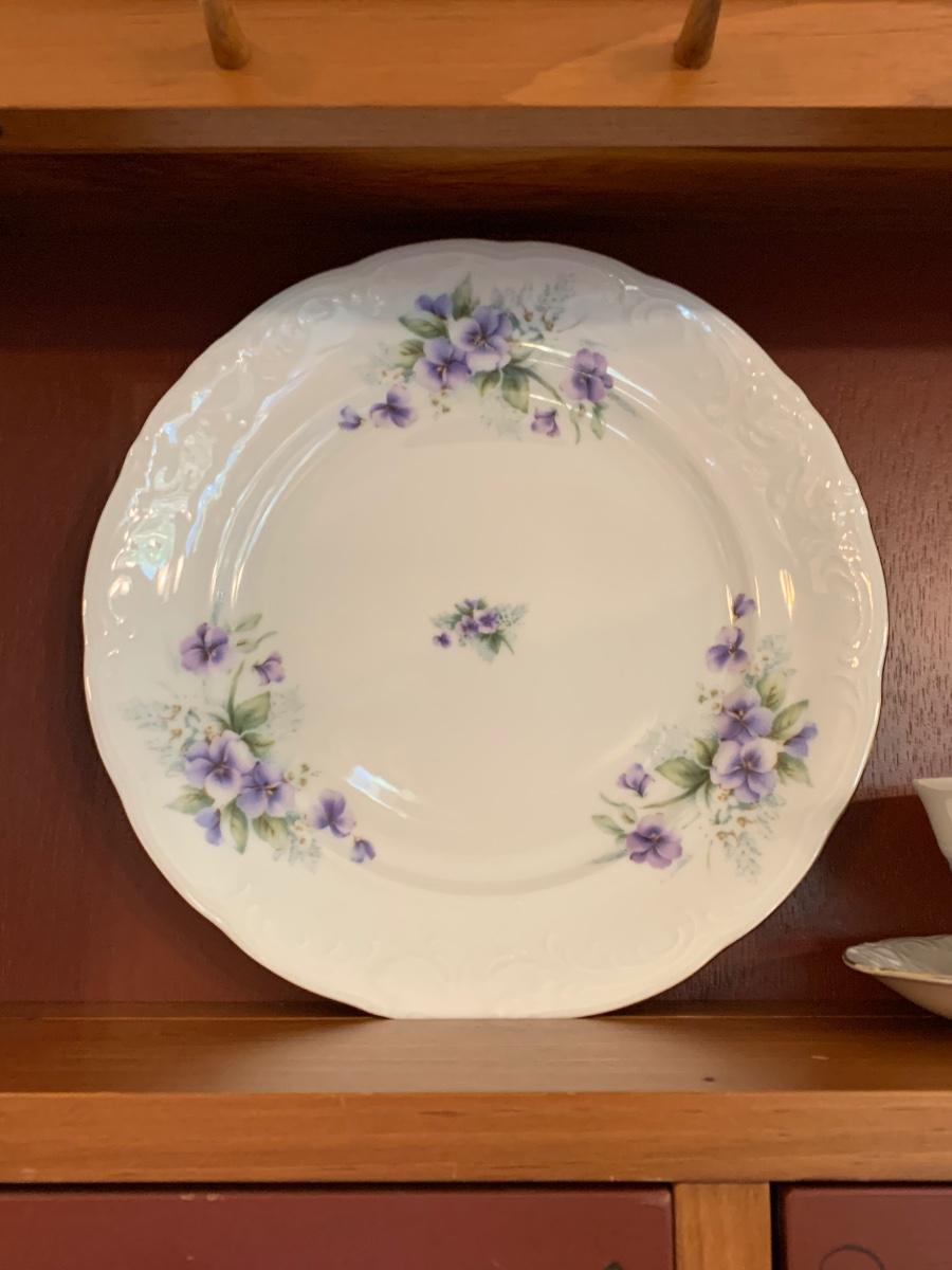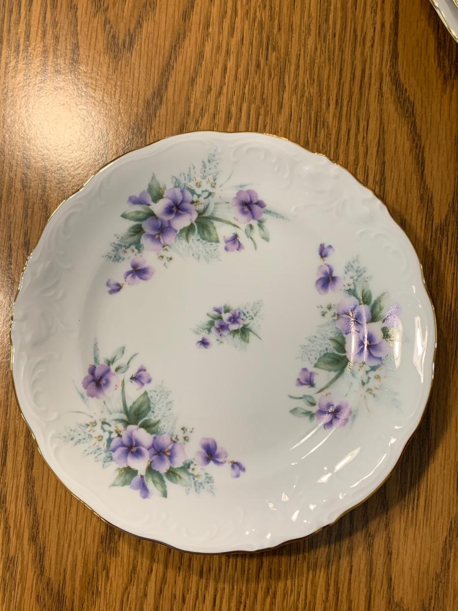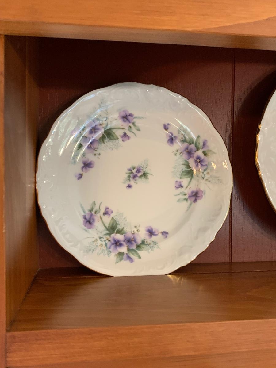 LOT 111R: Royal Kent (Poland) Purple Violet China, 8 each of Plates,Cups & Saucers, Soup Bowls,Dessert Plates along w/.Serving Pieces