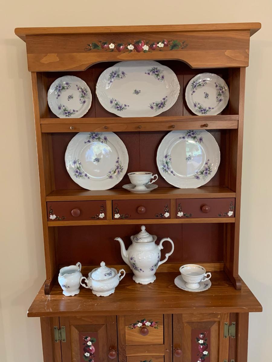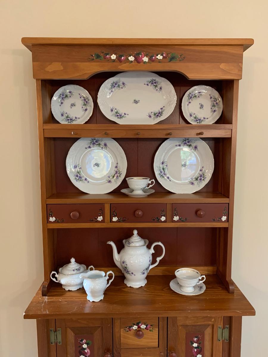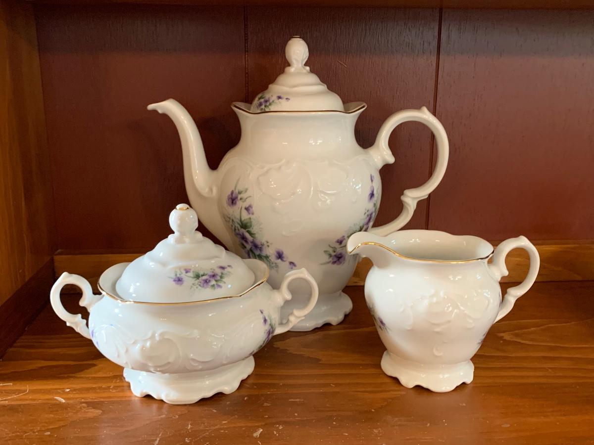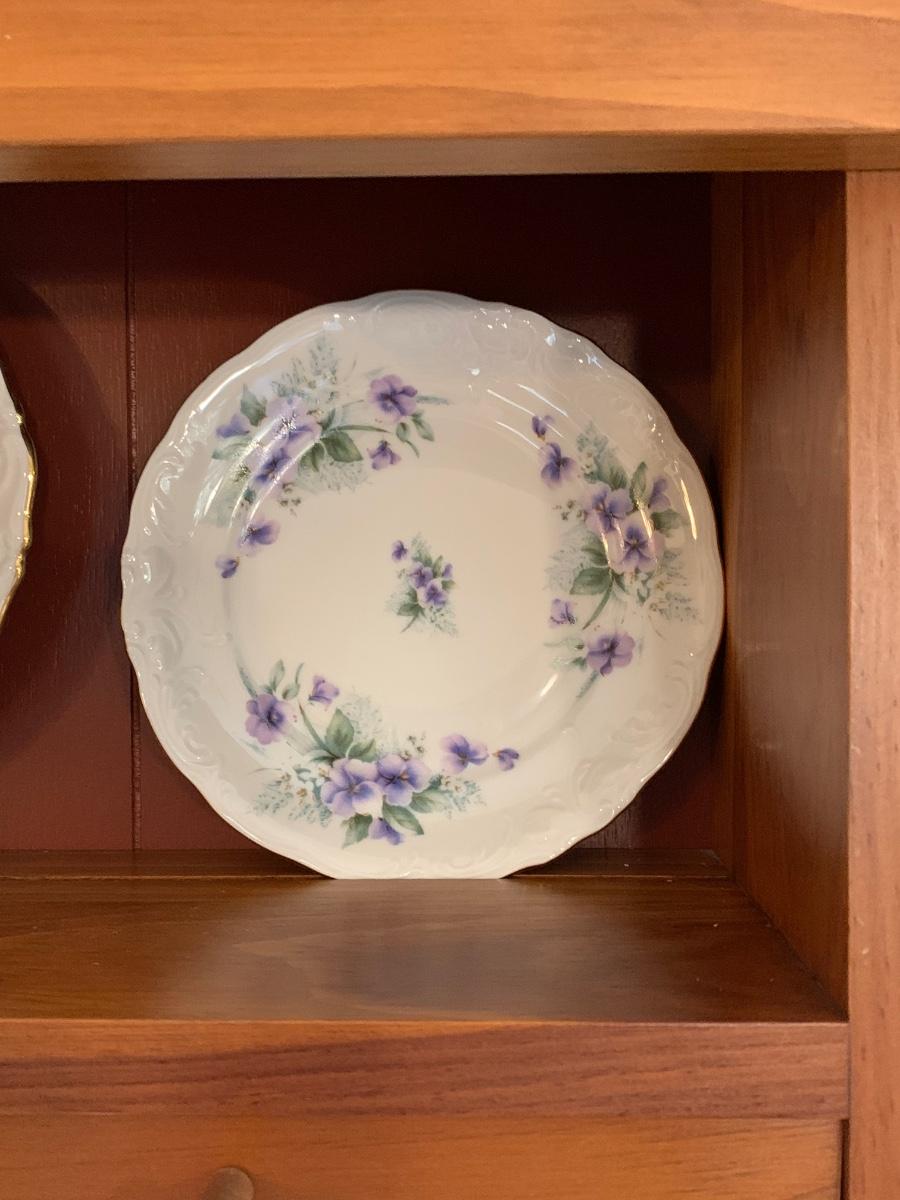 LOT 111R: Royal Kent (Poland) Purple Violet China, 8 each of Plates,Cups & Saucers, Soup Bowls,Dessert Plates along w/.Serving Pieces