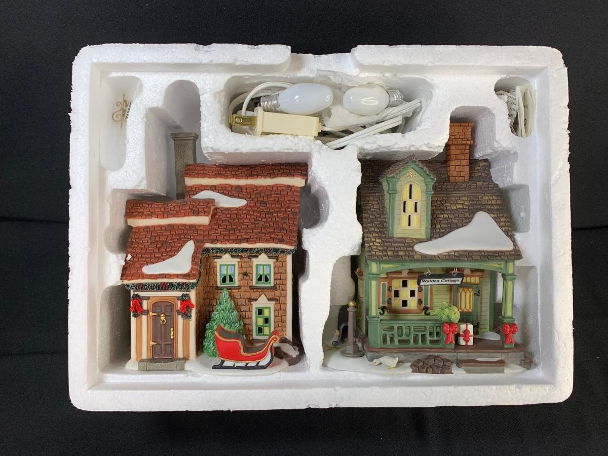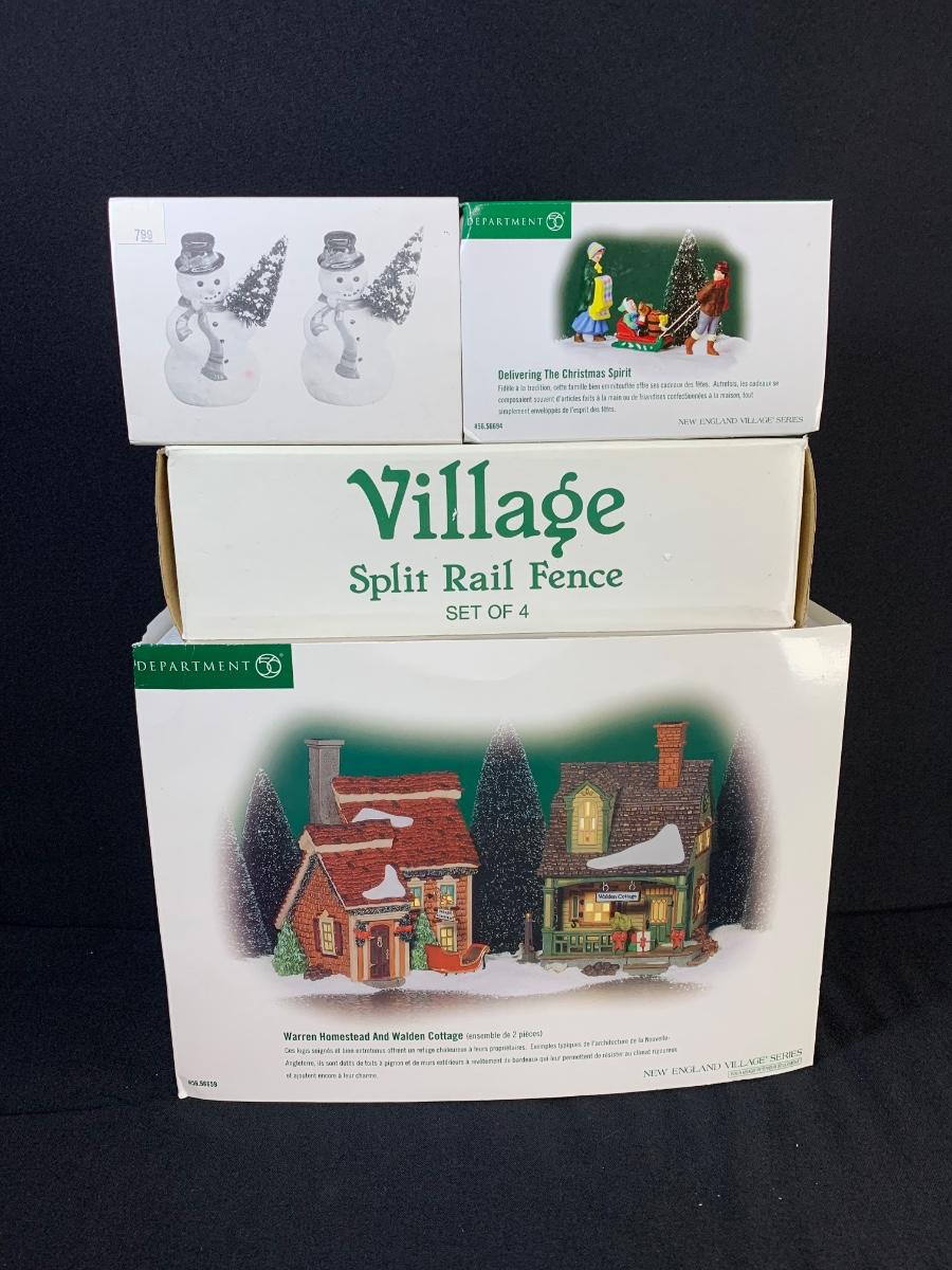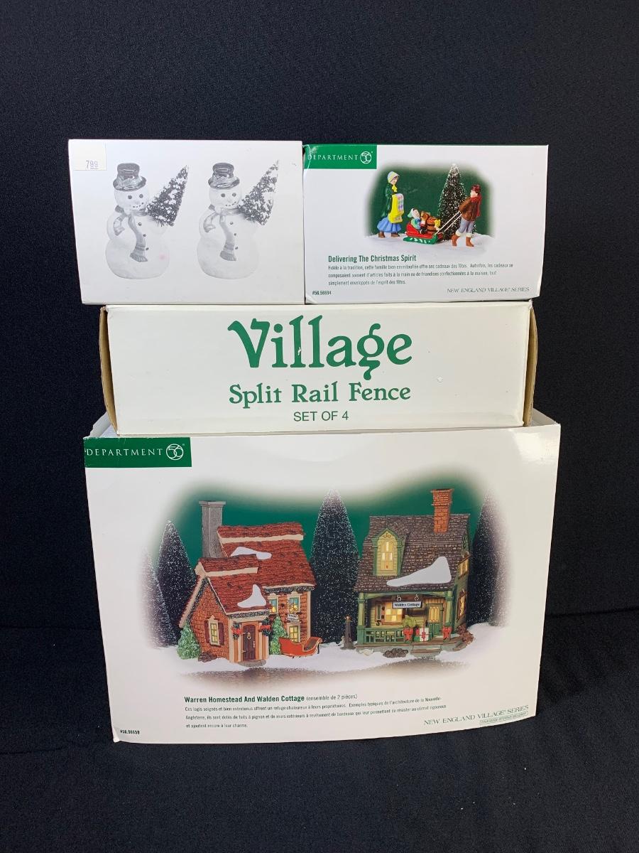 LOT 113R: Boxed Dept 56 Sets: Warren Homestead & Walden Cottage, Split Rail Fence, Delivering The Christmas Spirit, A Tree For Me
