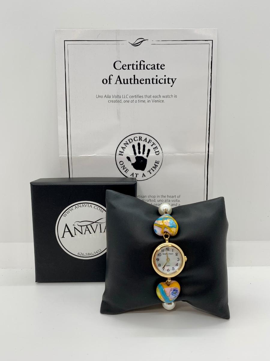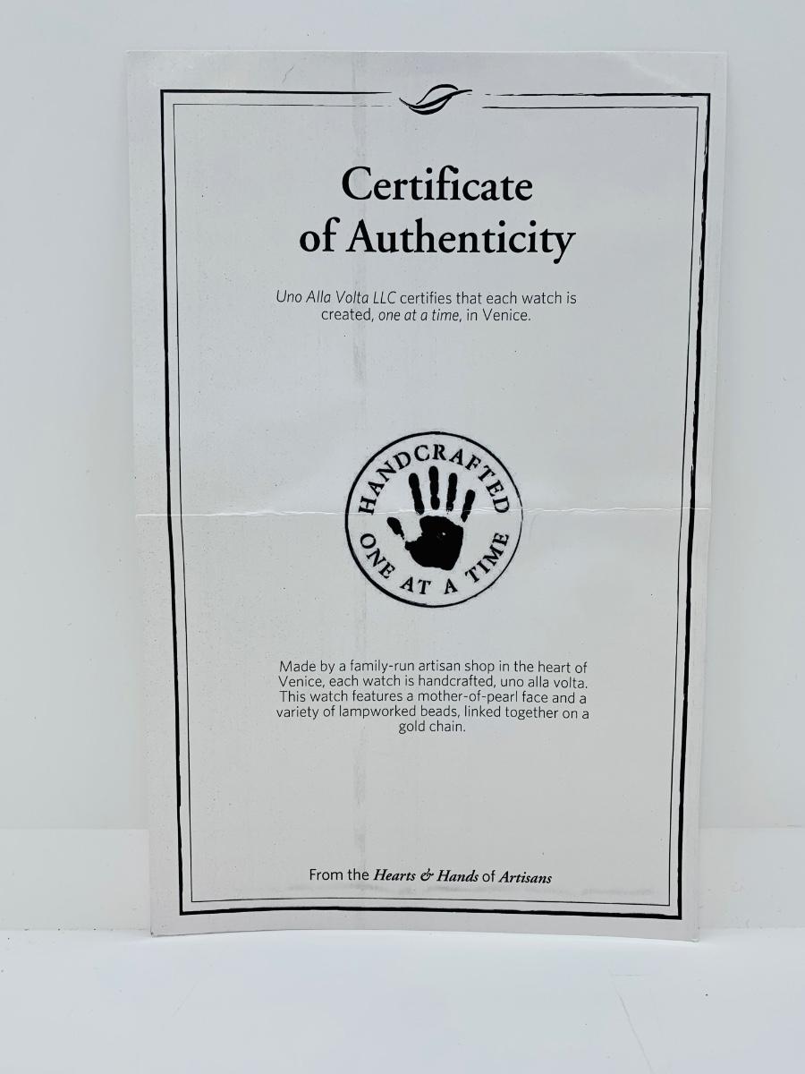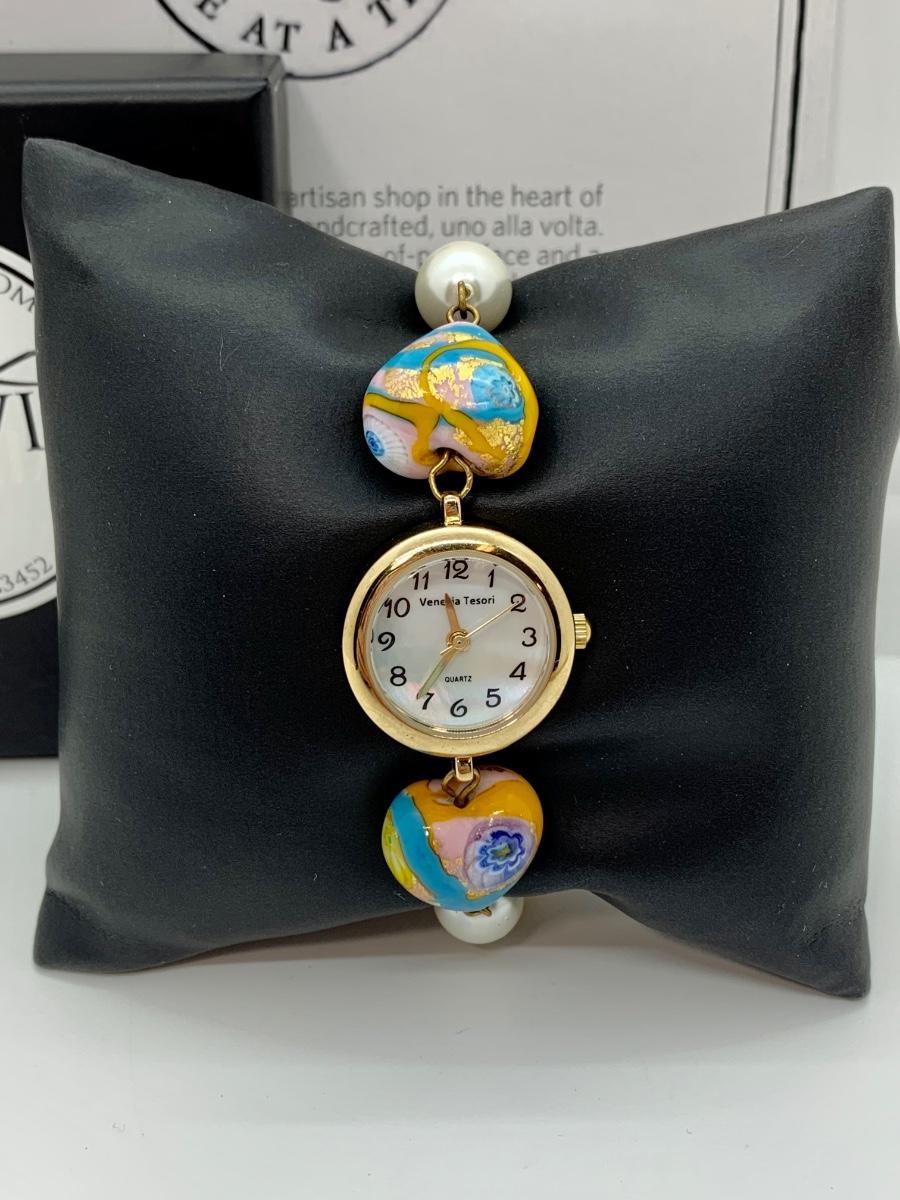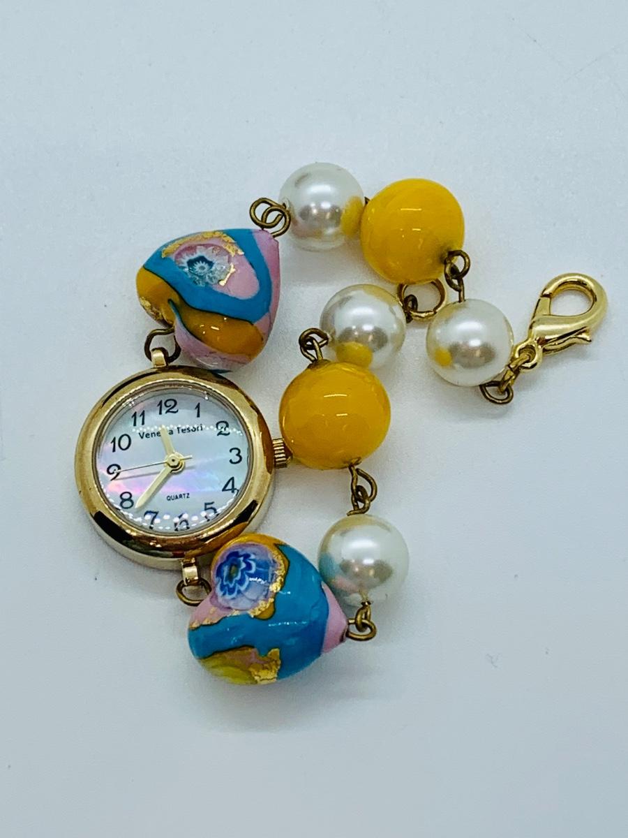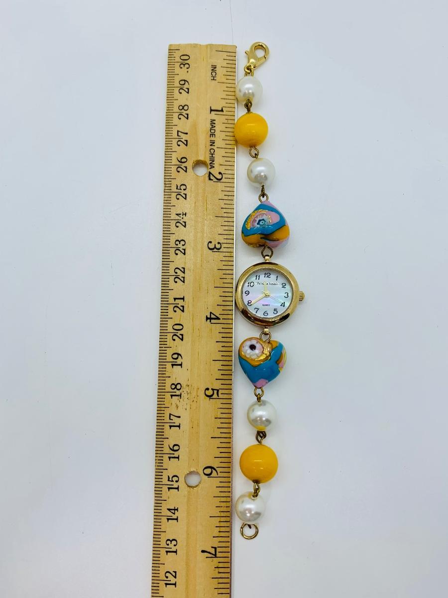 Watch features mother of pearl face, variety of lamp worked beads linked on a gold chain.