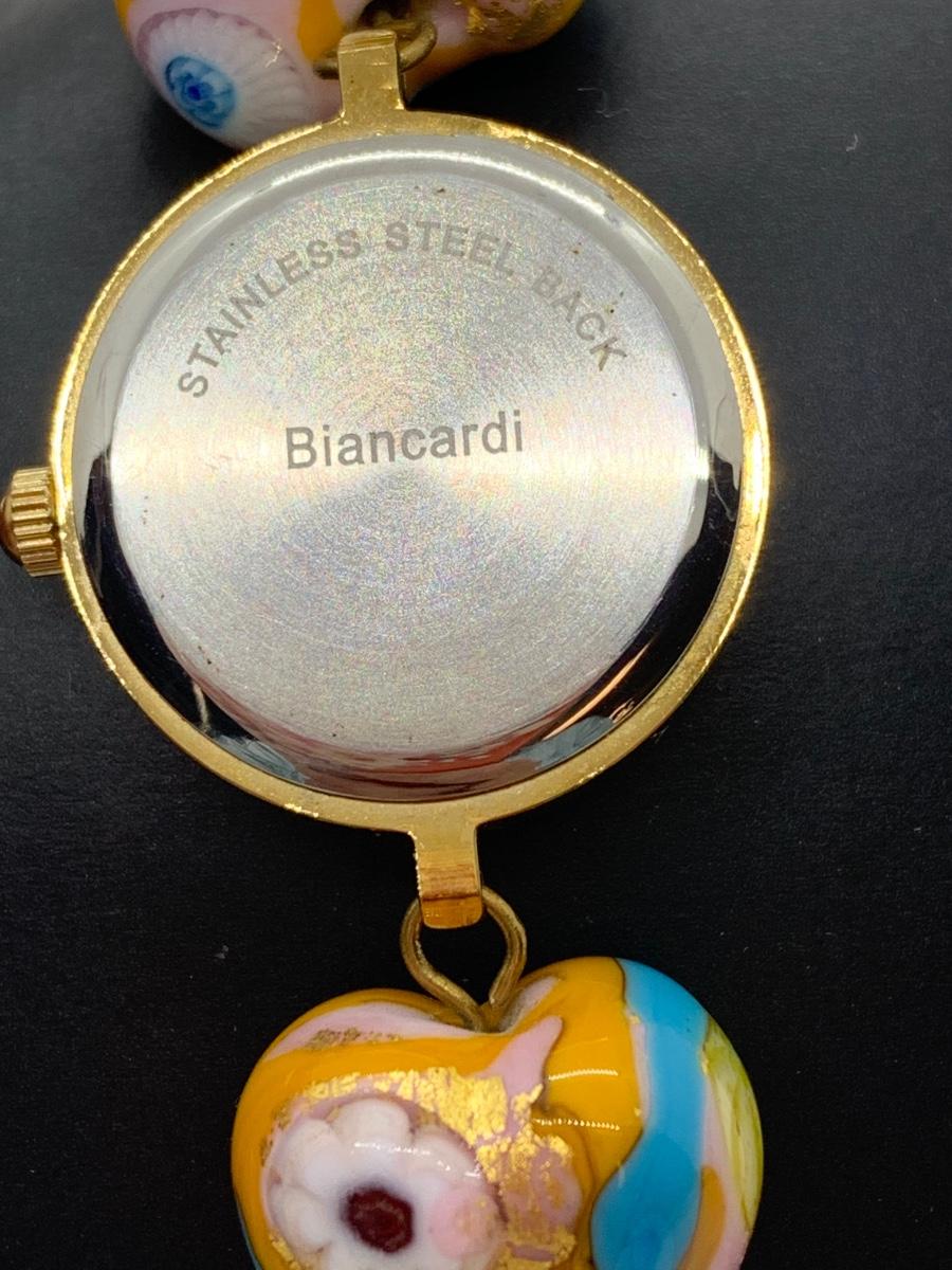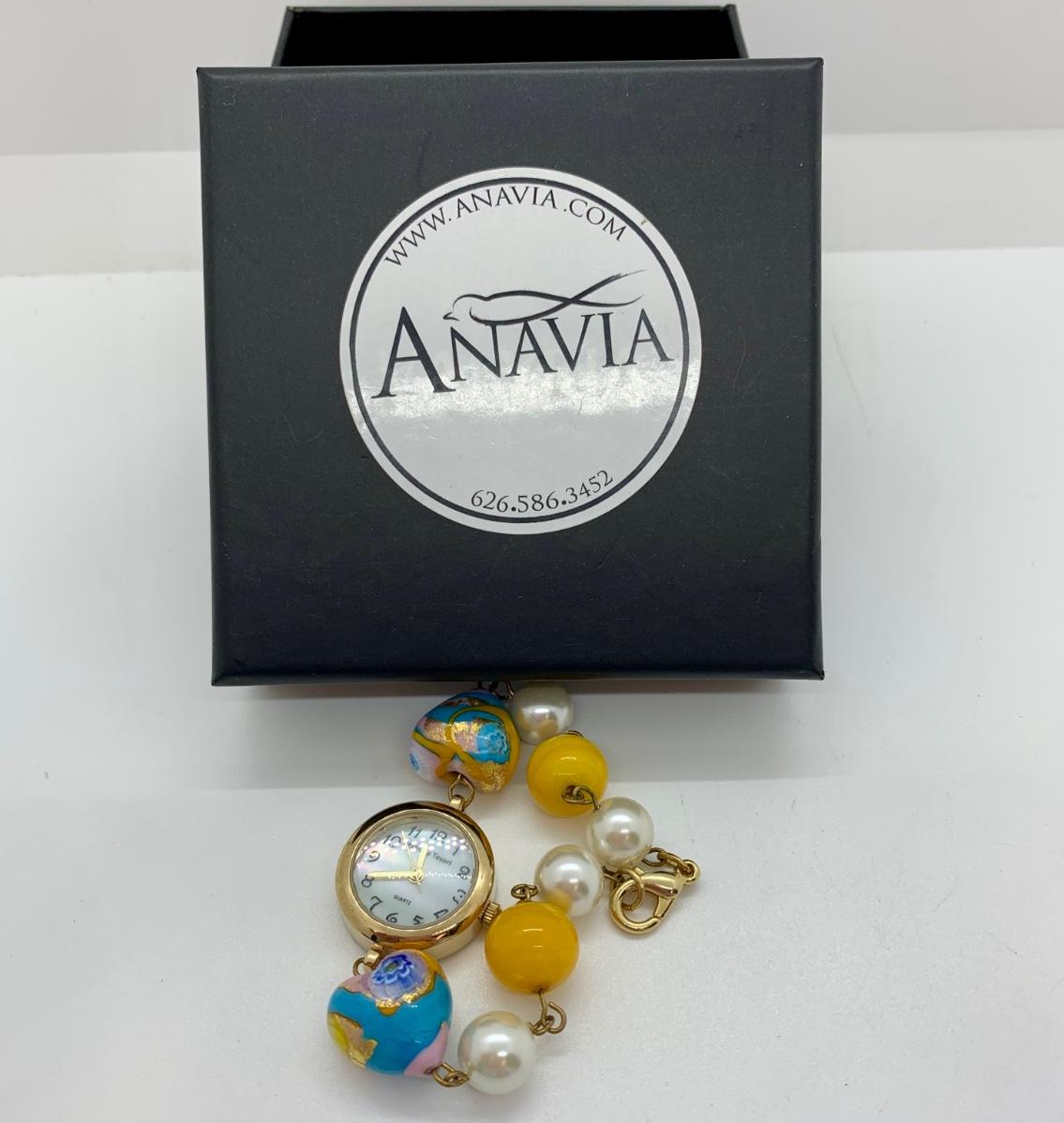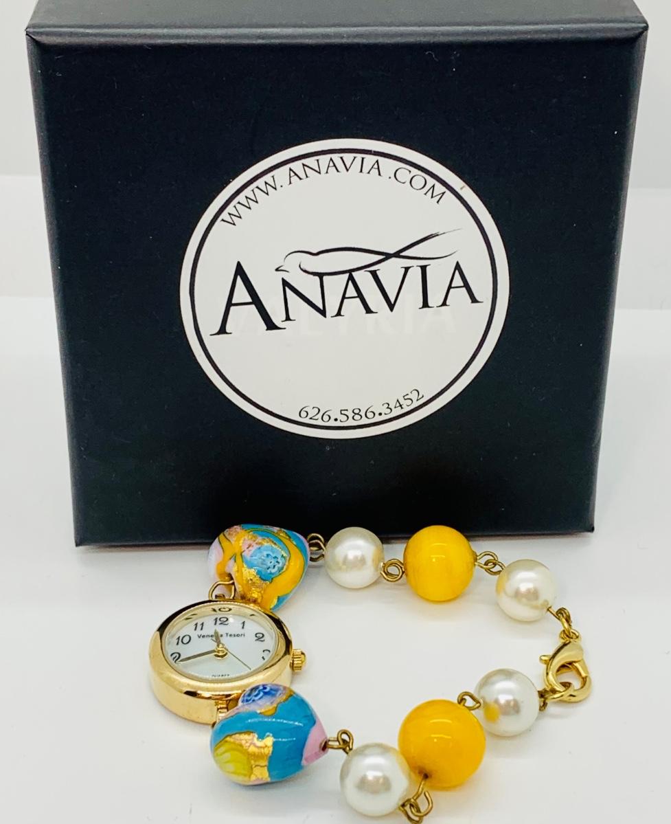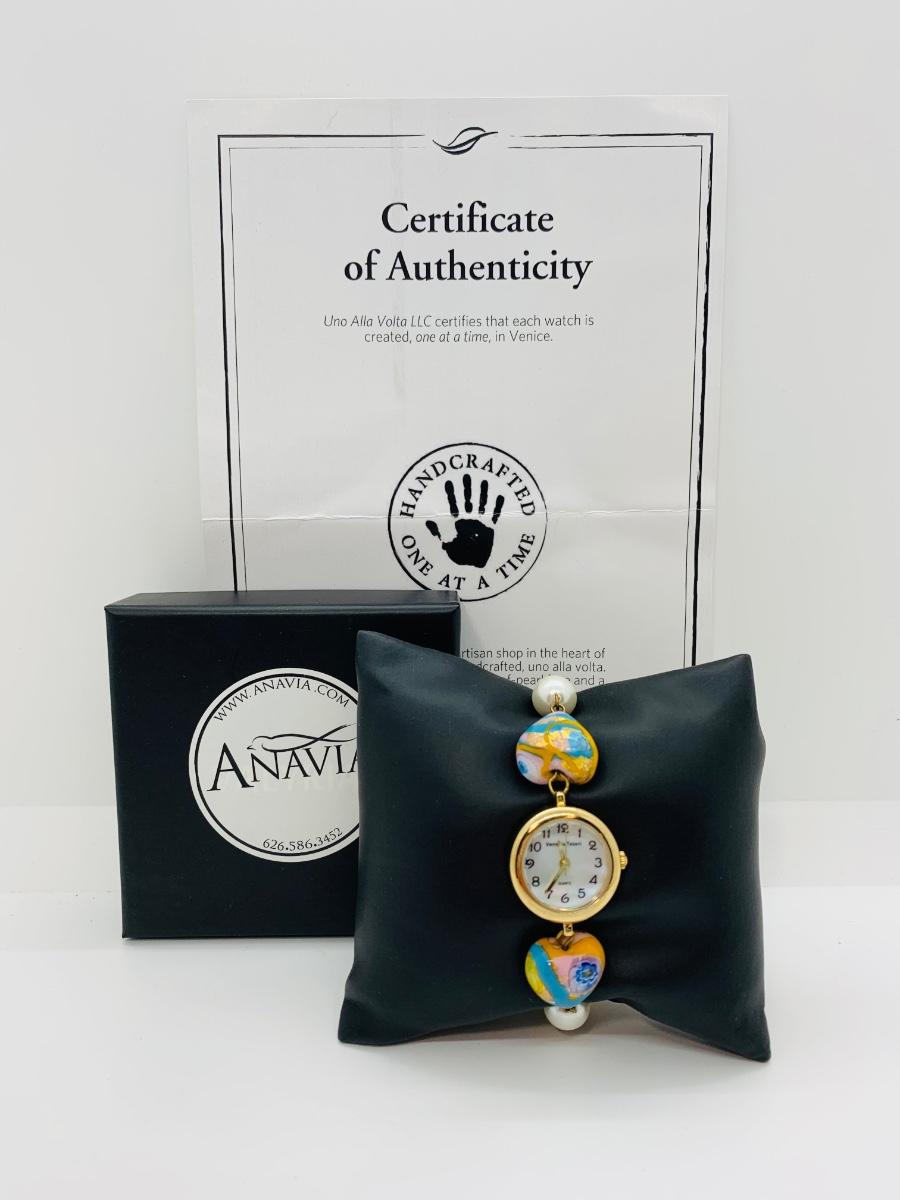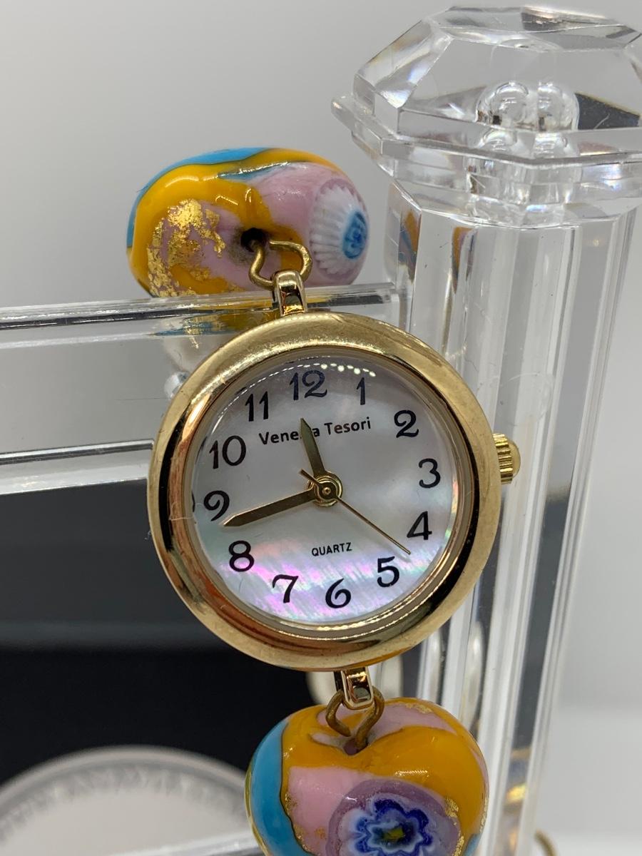 Watch features mother of pearl face, variety of lamp worked beads linked on a gold chain.