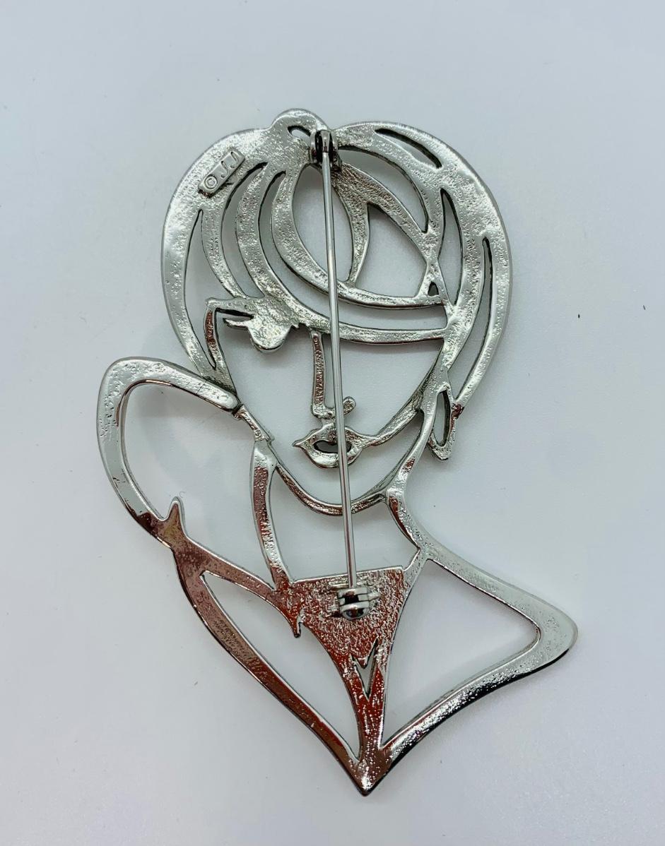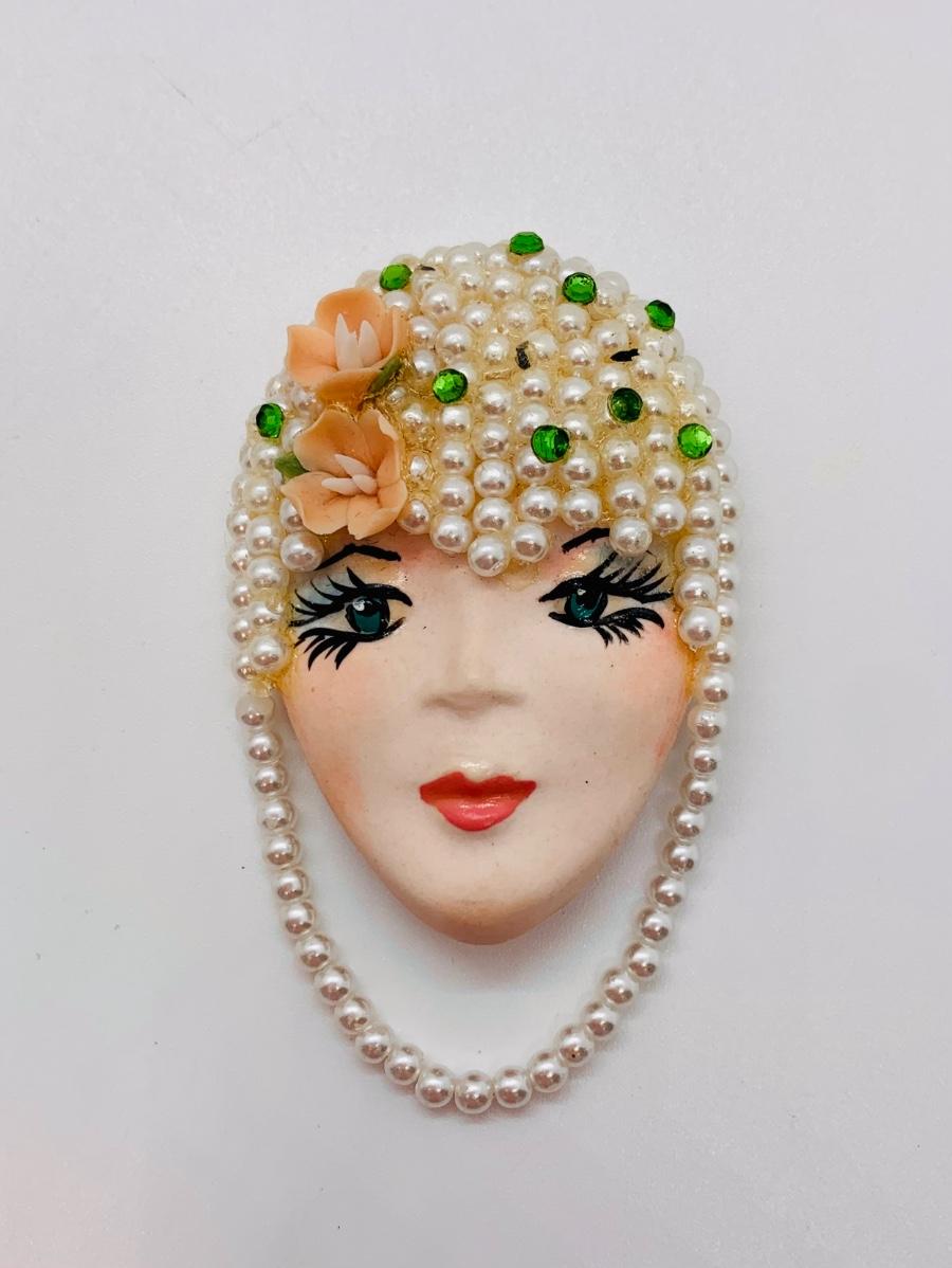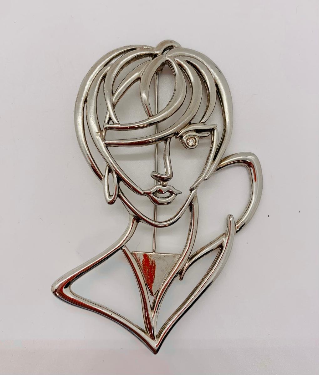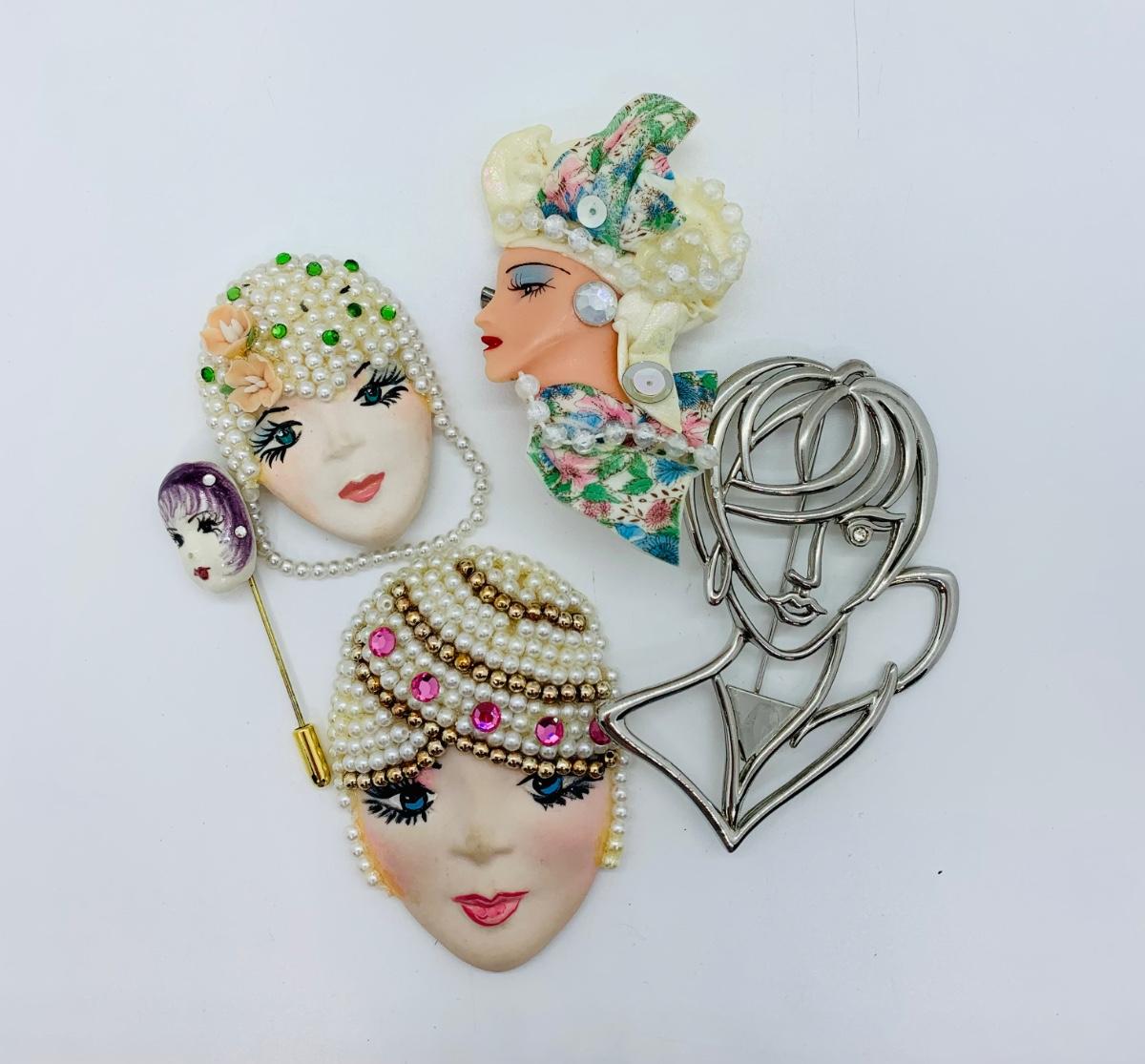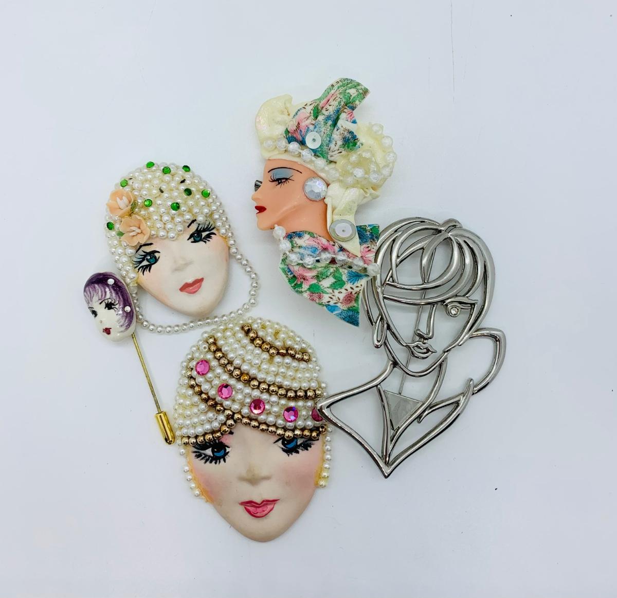 LOT 146J: Face Brooches: Pearl Flappers Dated & Signed, Stick Pin, Signed , JJ Art Deco & More