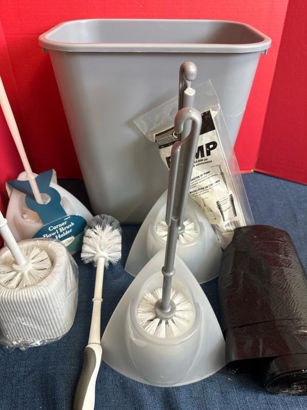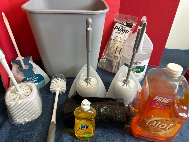 Plastic trash can, toilet brushes, Hand sanitizer,