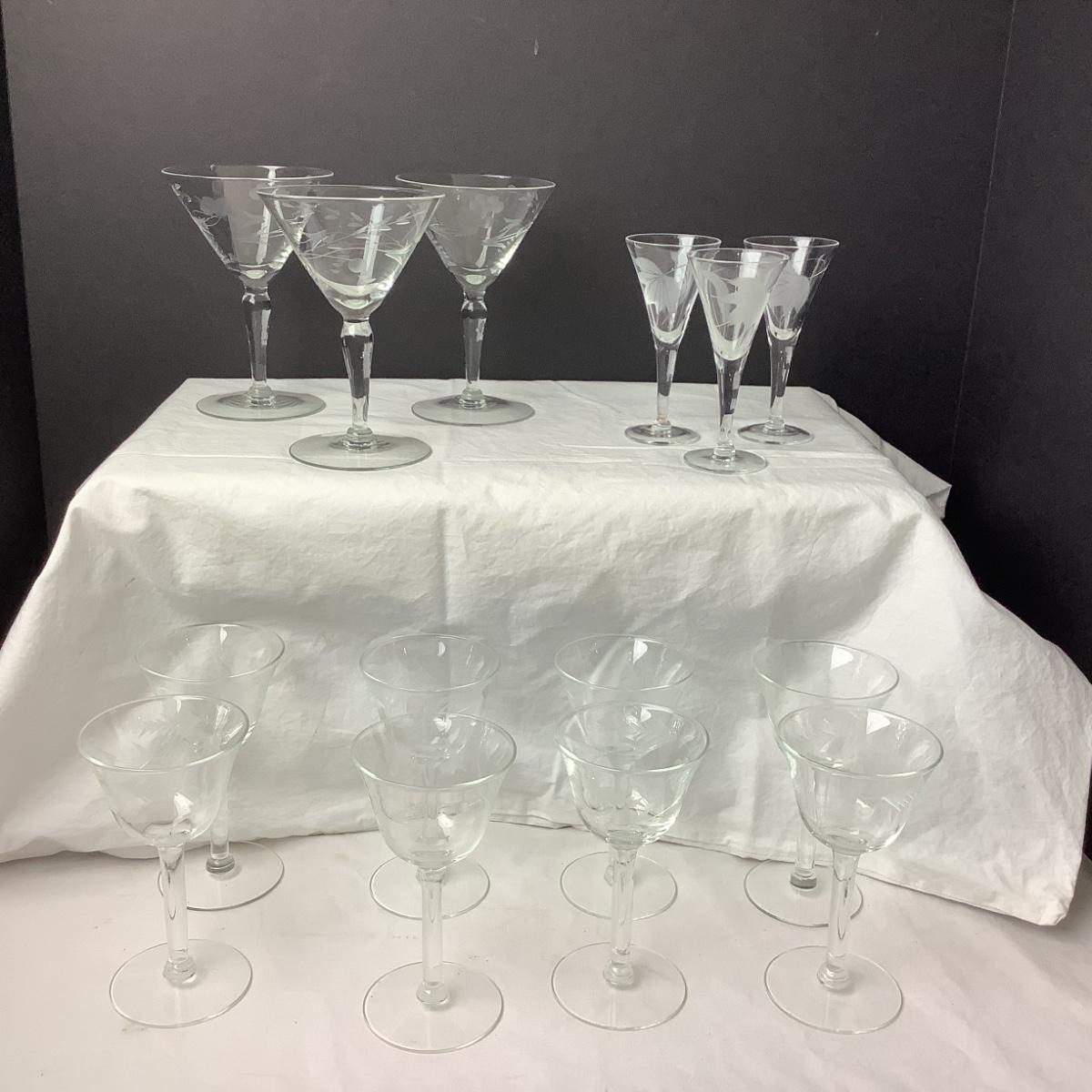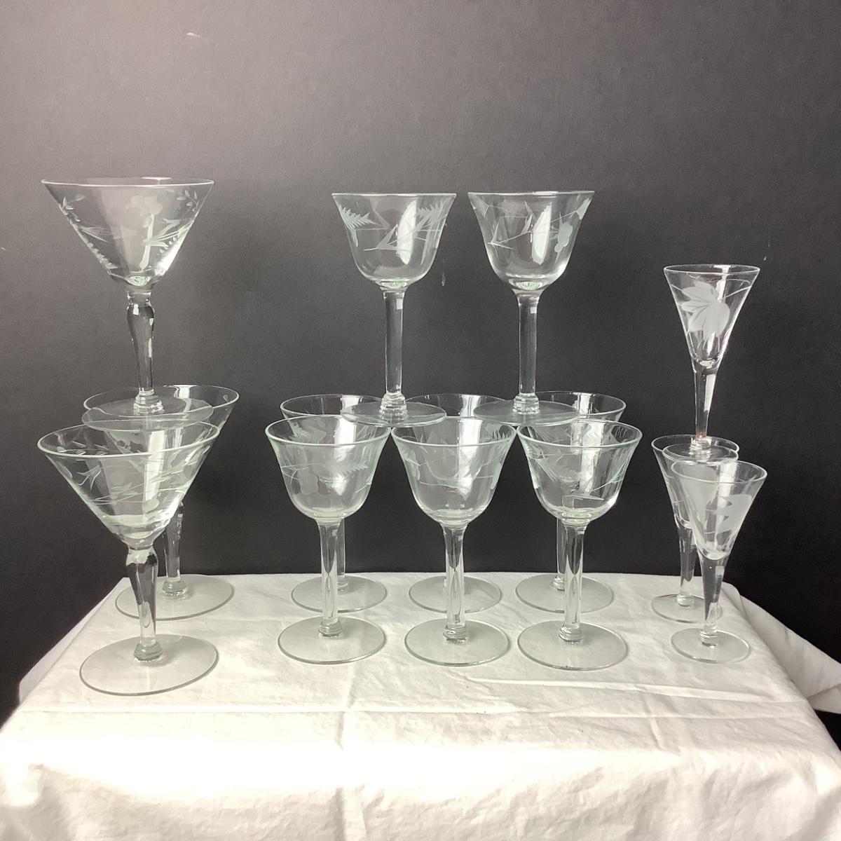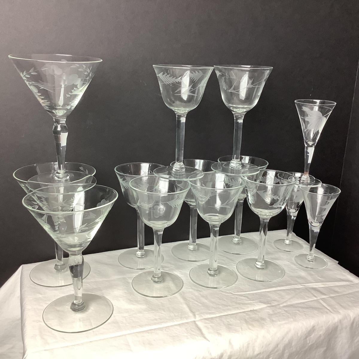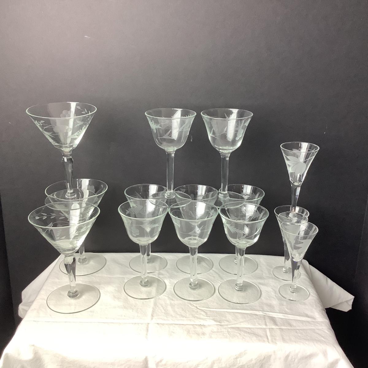 Lot 804. 14 Piece Vintage Etched Grape Design Glasses