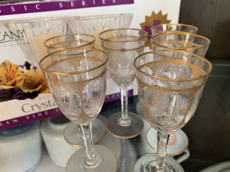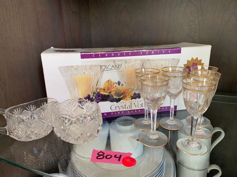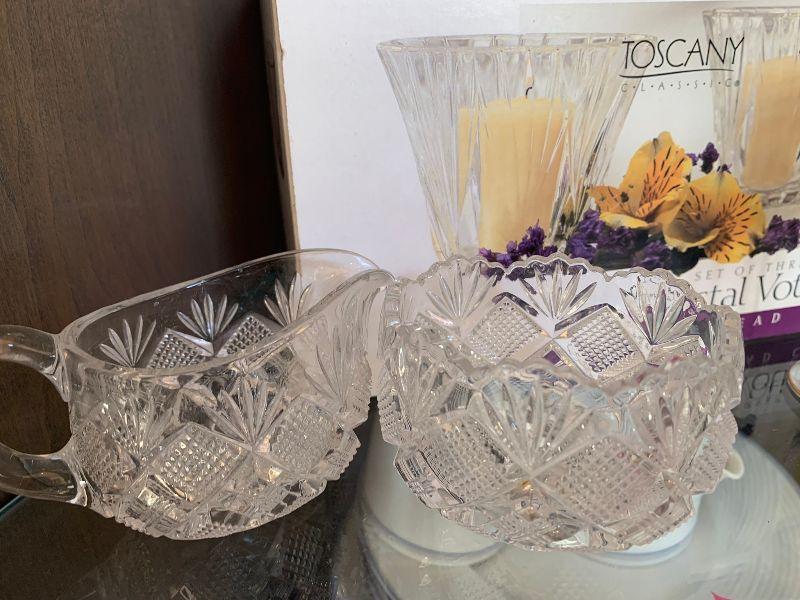 Set of three crystal votives 24% lead crystal Set of creamer with sugar bowl Lead crystal 6 port glasses with gold design