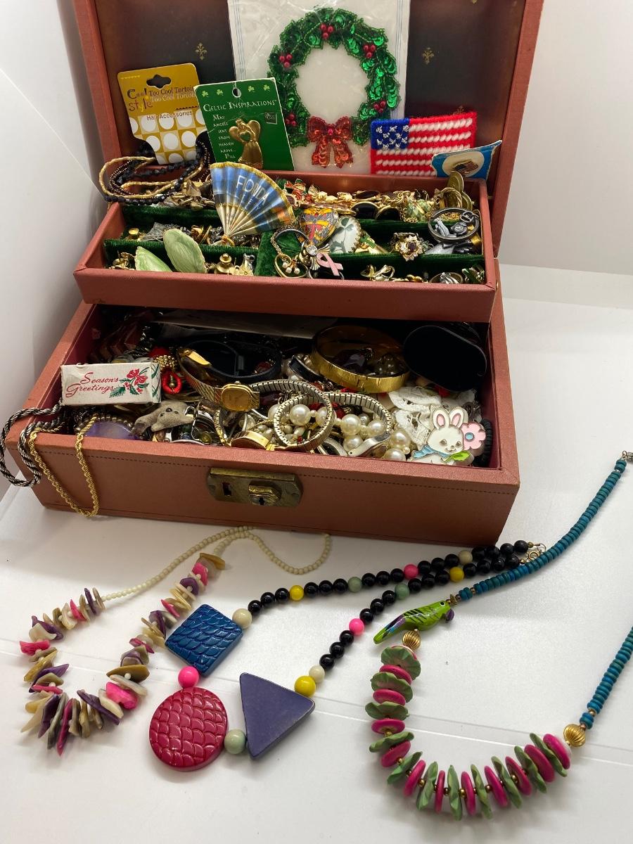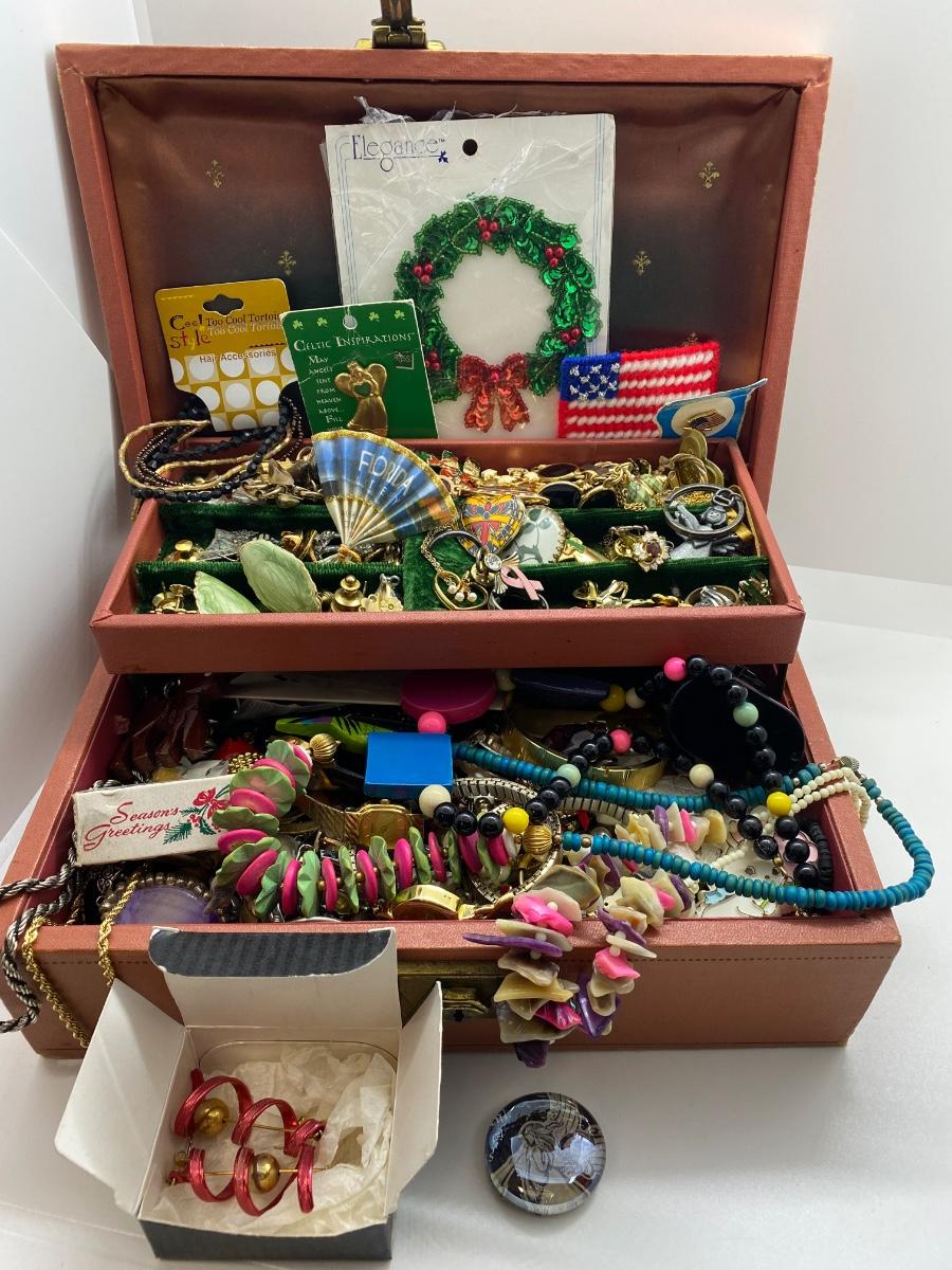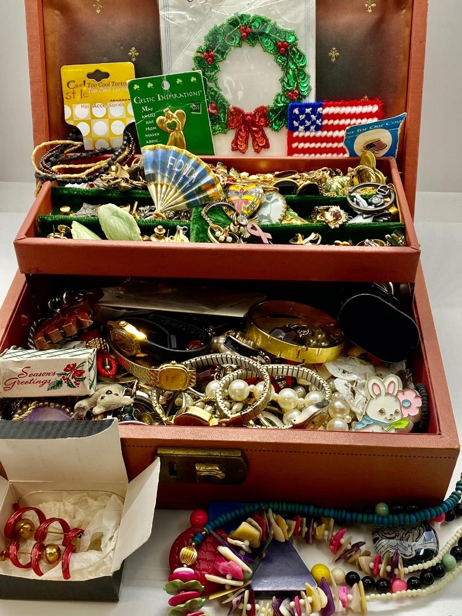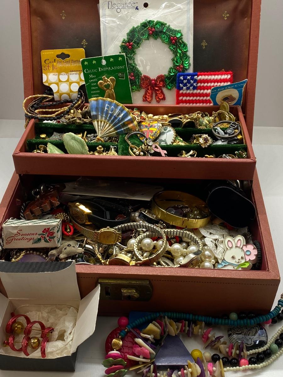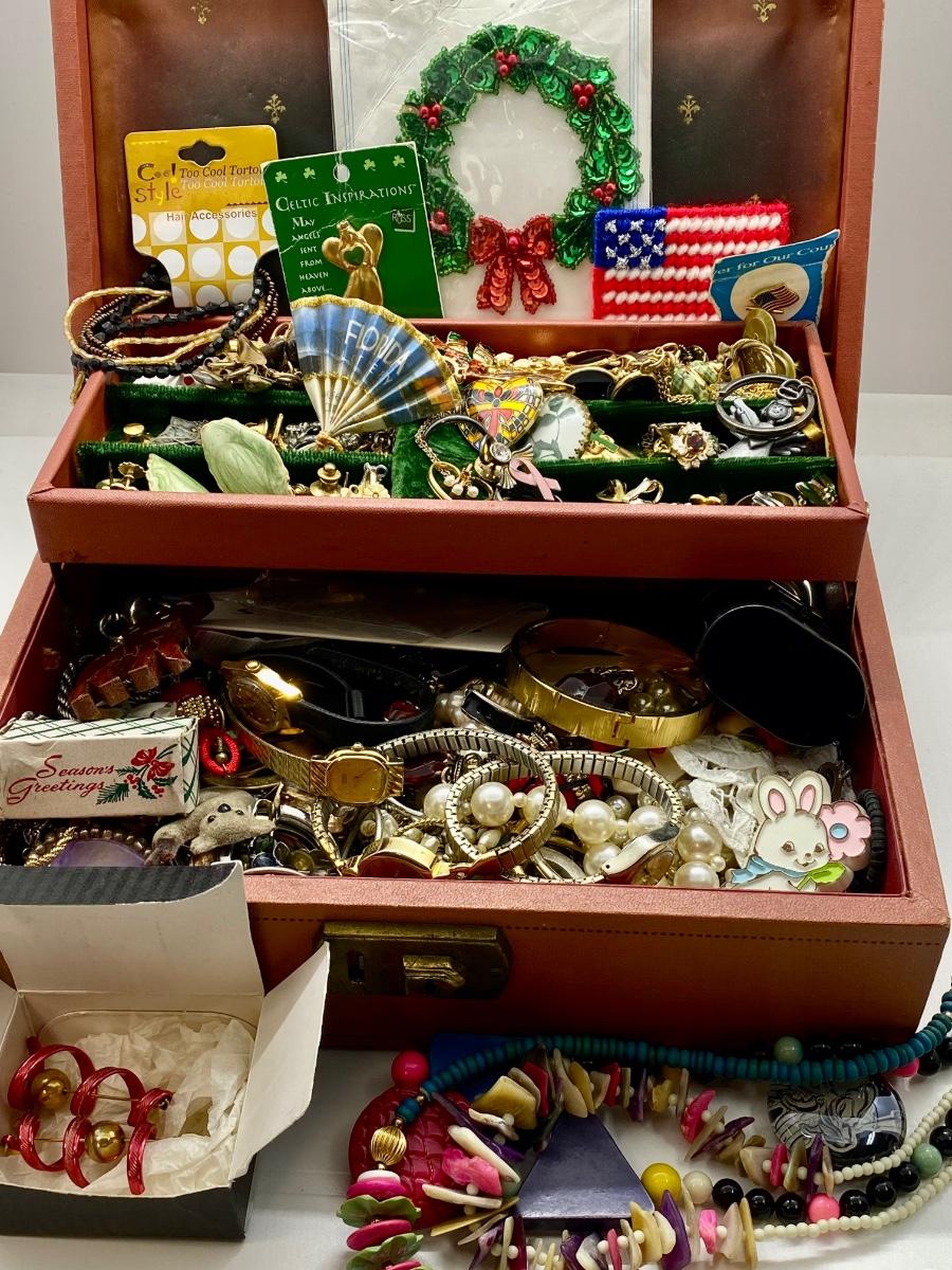 LOT 48: Jewelry Box Filled with Pins, Earrings, Watches, Necklaces and More