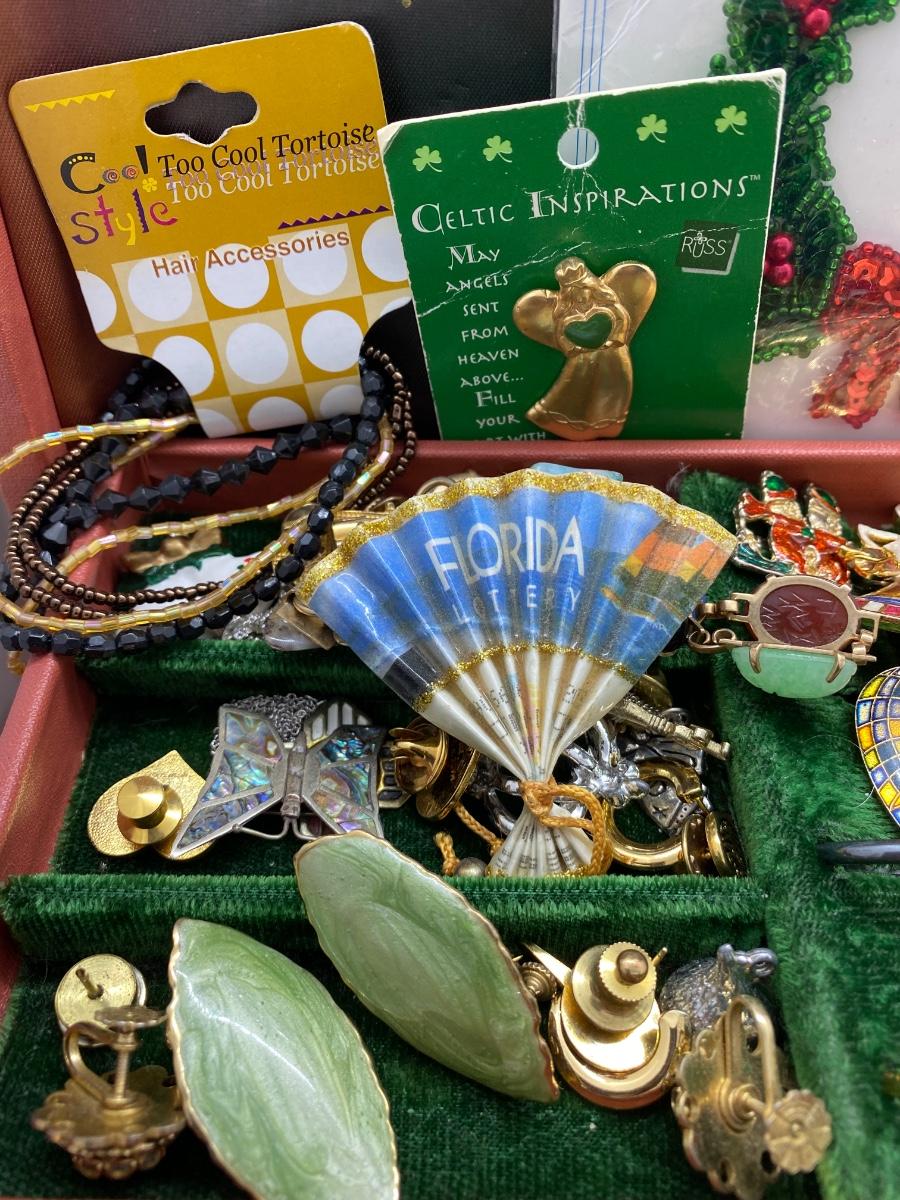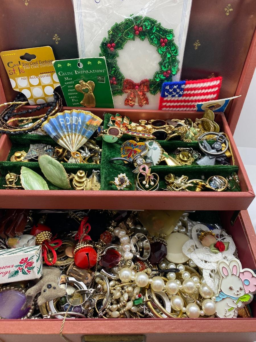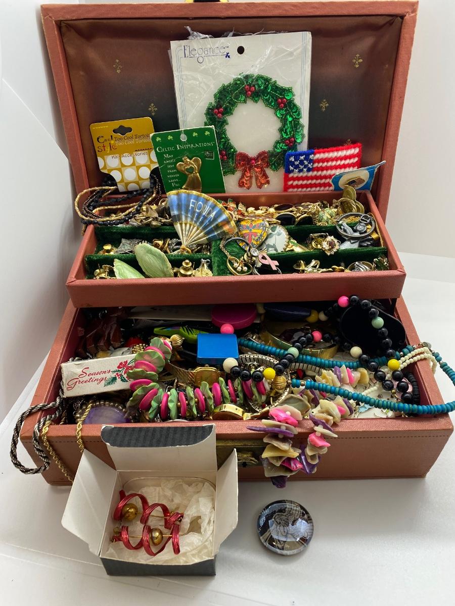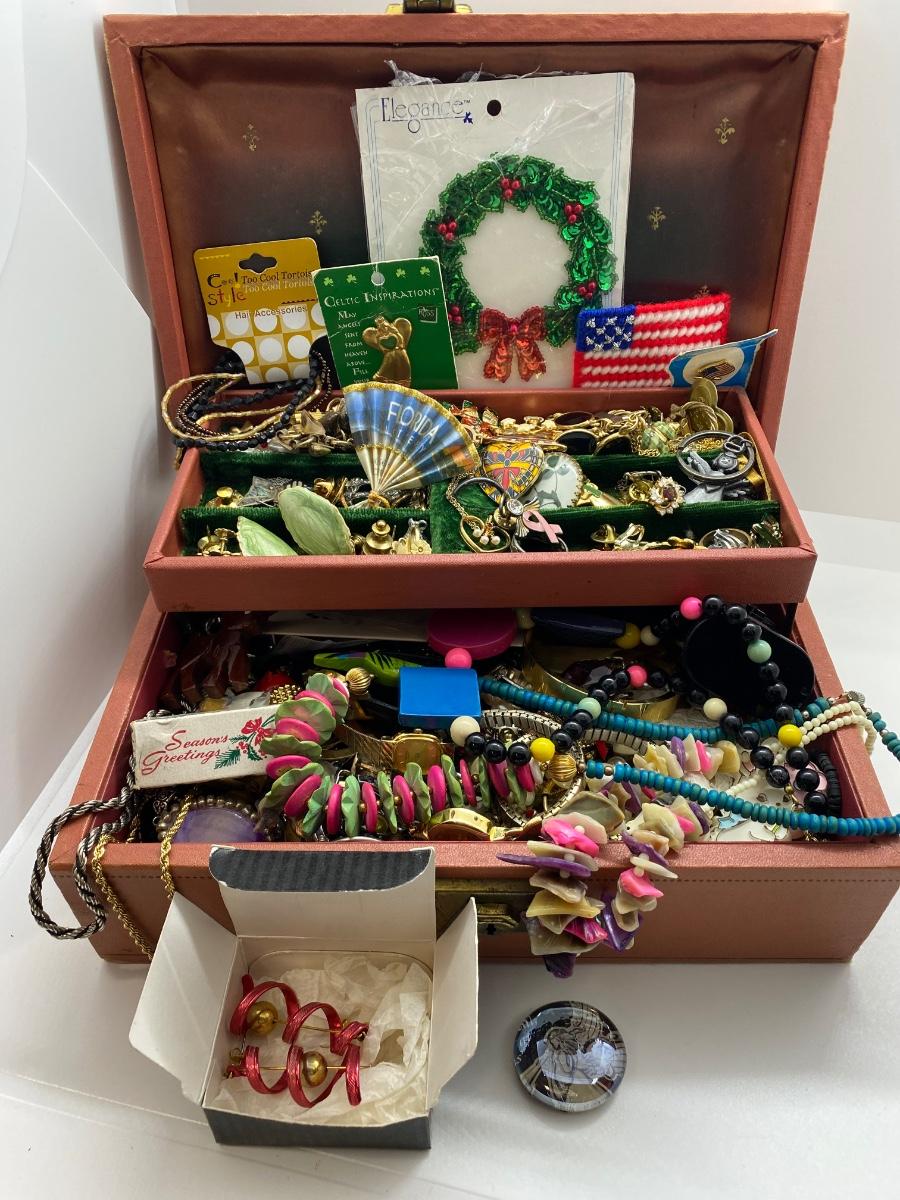 LOT 48: Jewelry Box Filled with Pins, Earrings, Watches, Necklaces and More