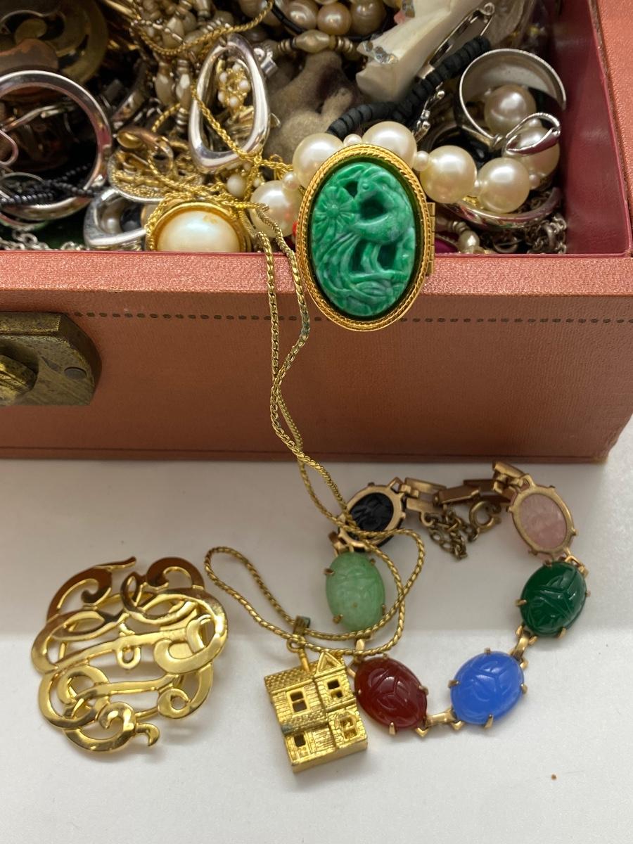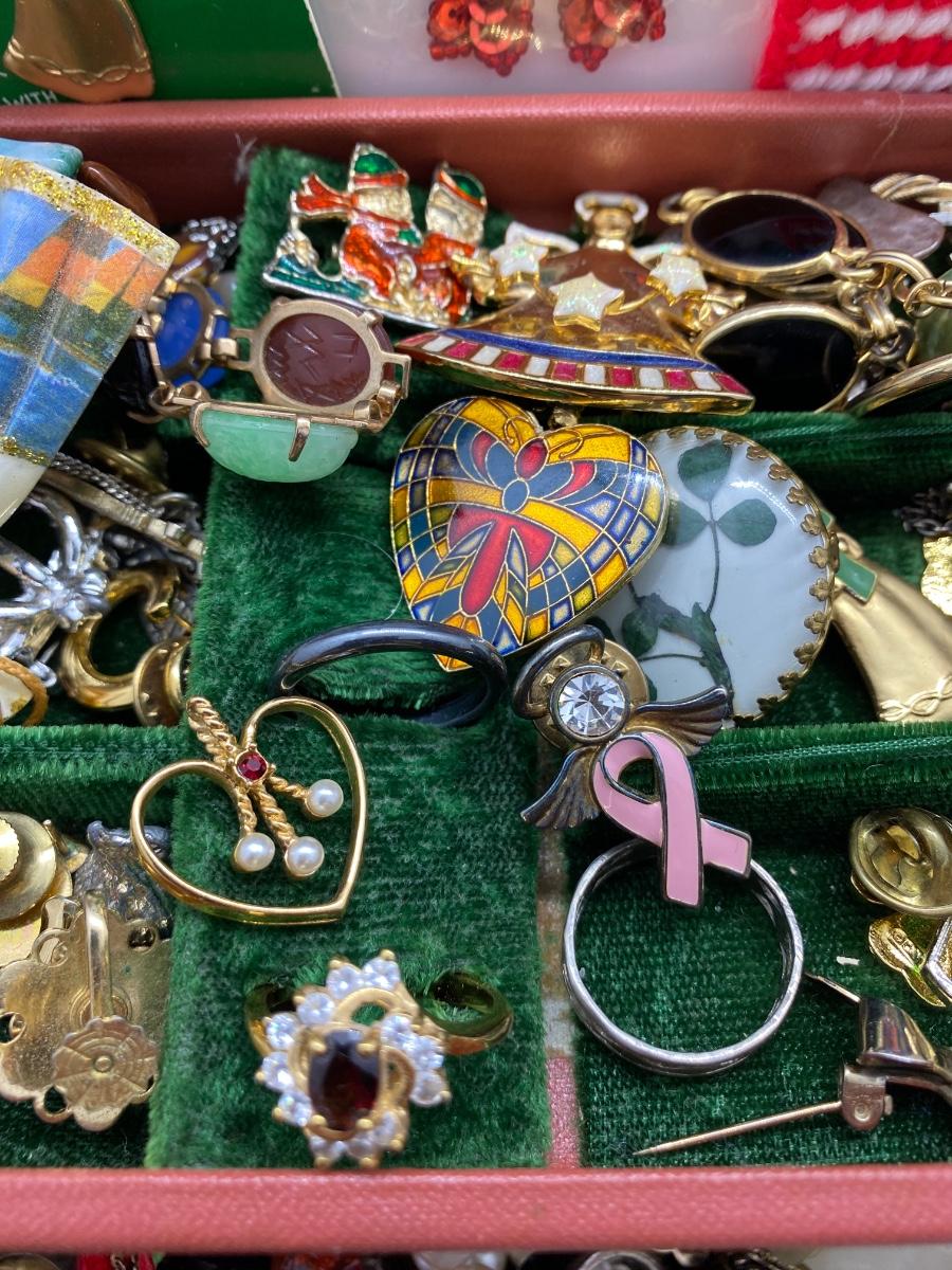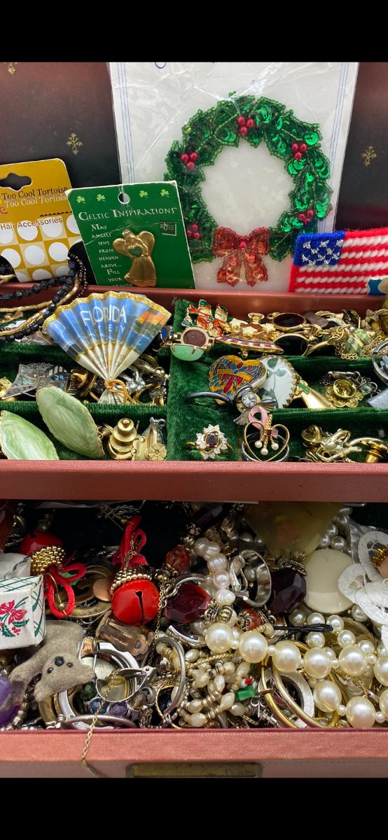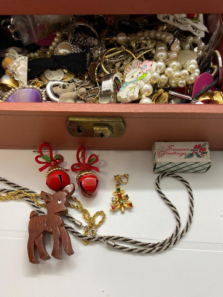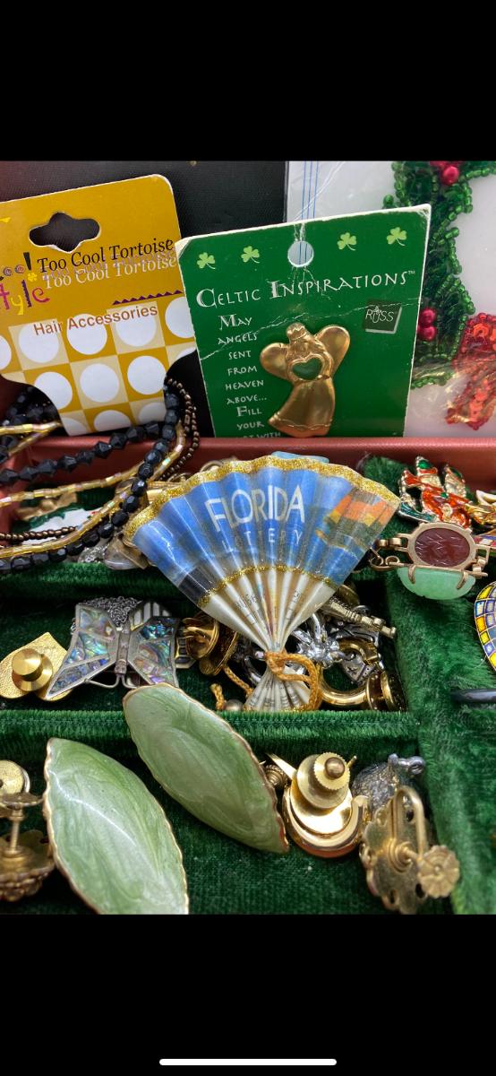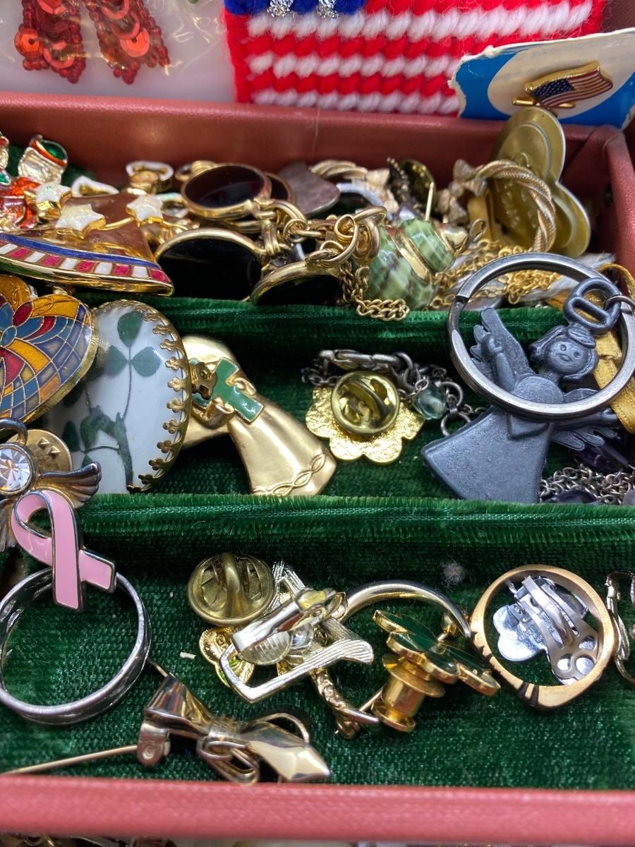 LOT 48: Jewelry Box Filled with Pins, Earrings, Watches, Necklaces and More