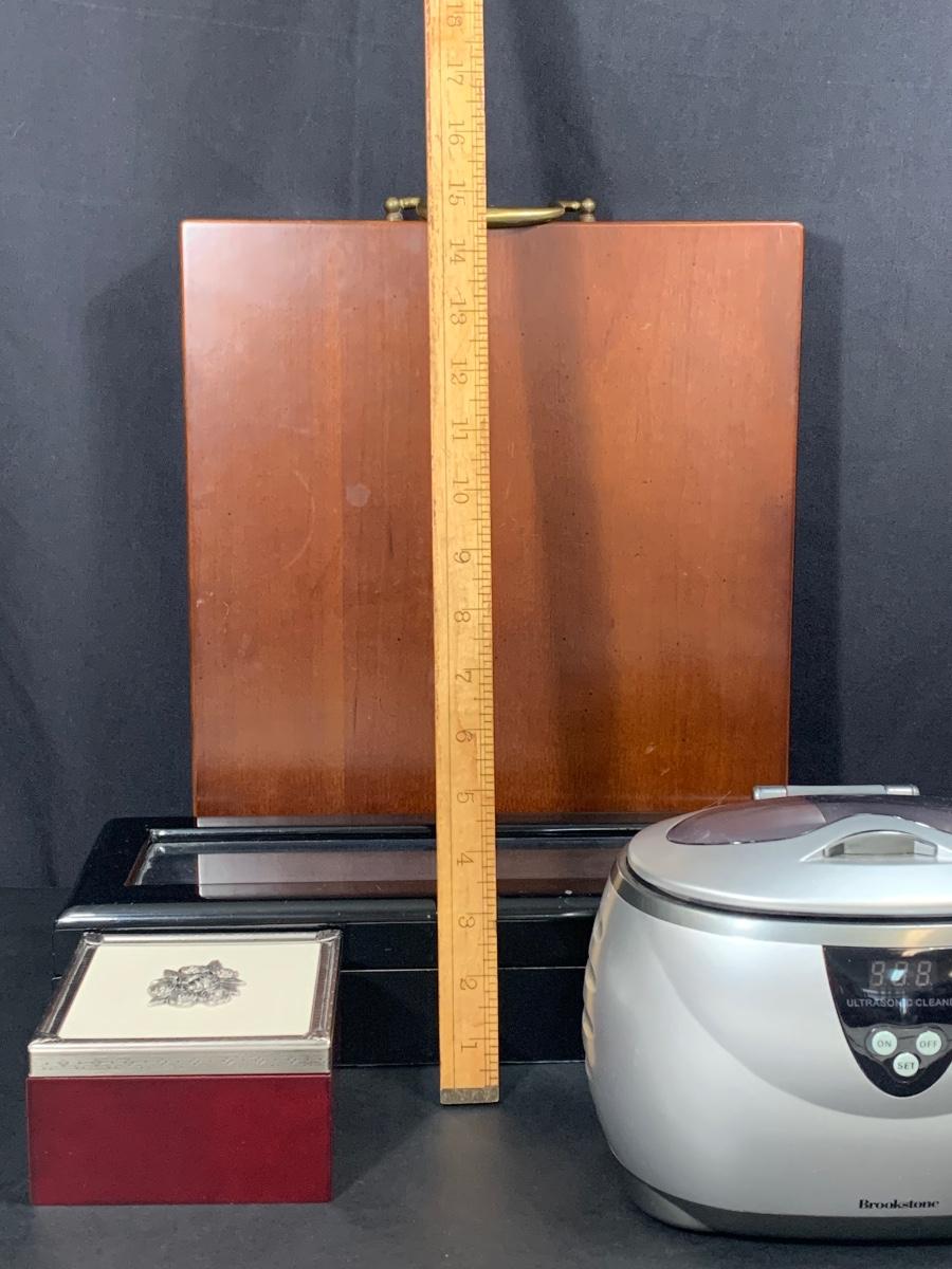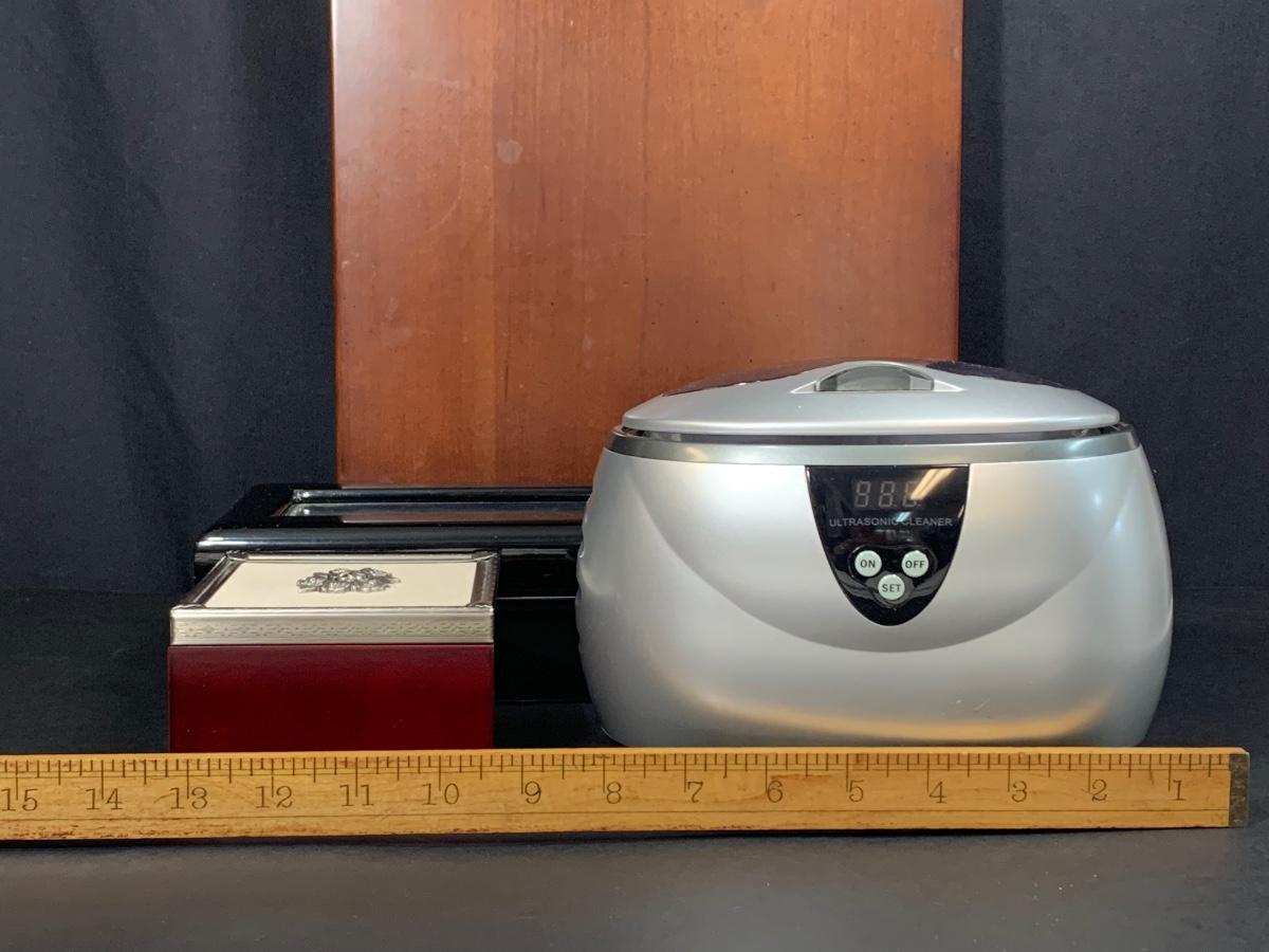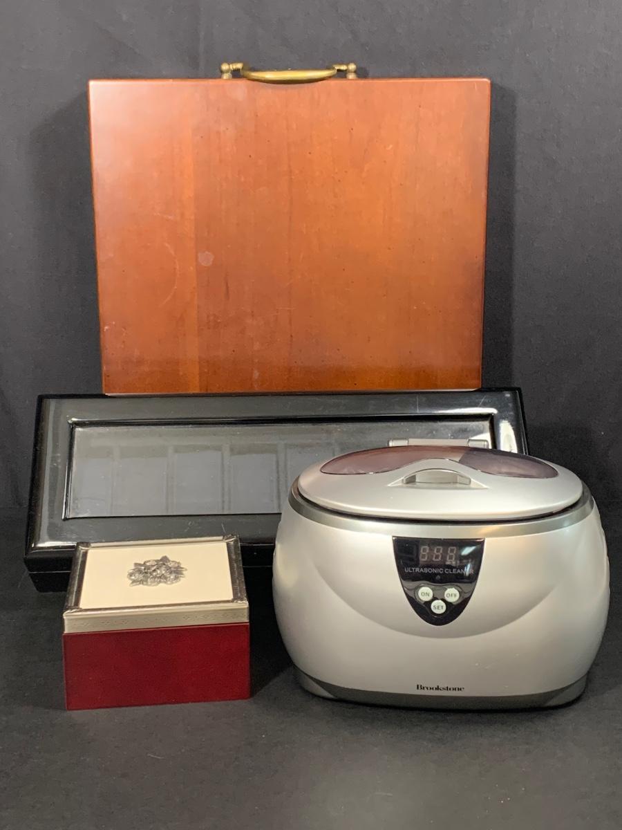 LOT 63R: Ultrasonic Jewelry Cleaner #CD-3800A, Bombay Co. Box, Watch/Bracket Box & Royal Limited Trinket Box