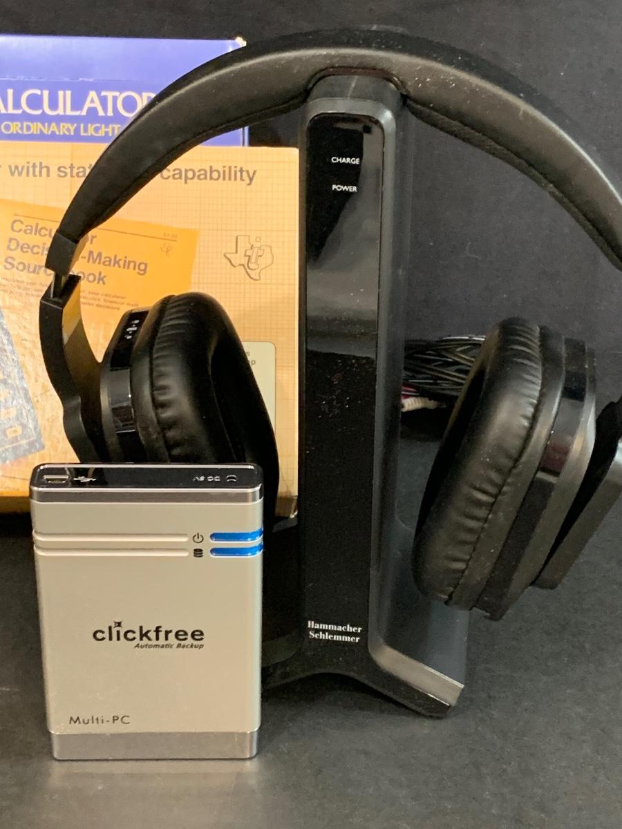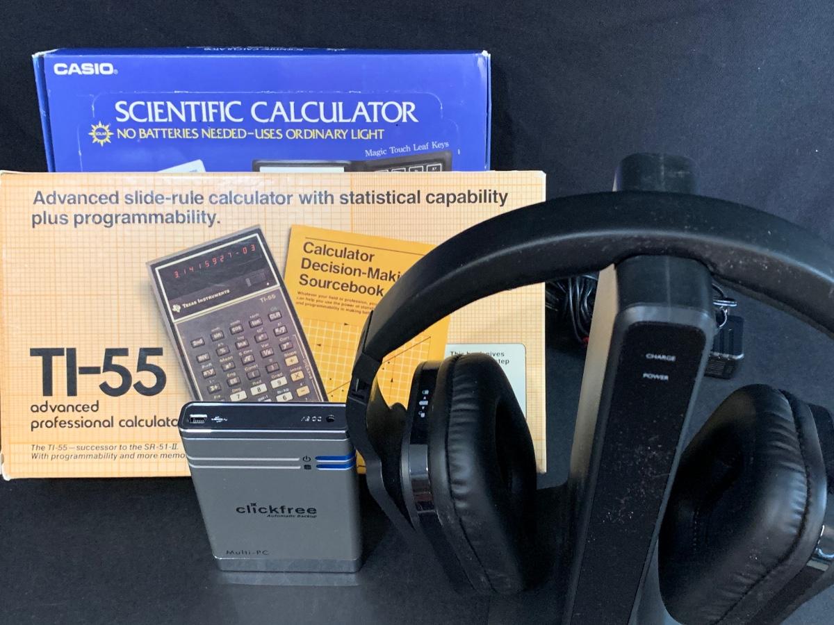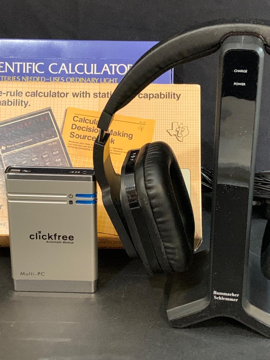 LOT 79R:Hammacher Schlemmer Wireless TV Headphones, Click Free Automatic Backup & Scientific Calculators