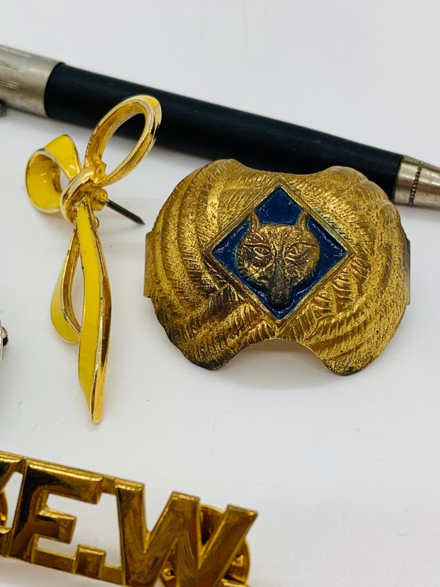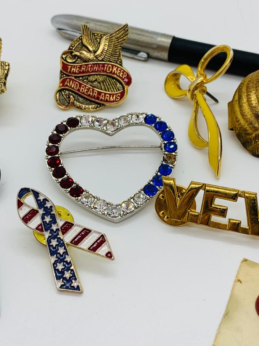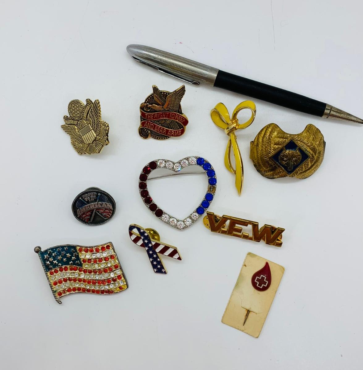 LOT 111R: Wings Mechanical Pencil, 4-H Pin, Vintage Cub Scout Bolo Tie Slide, Patriotic Pins