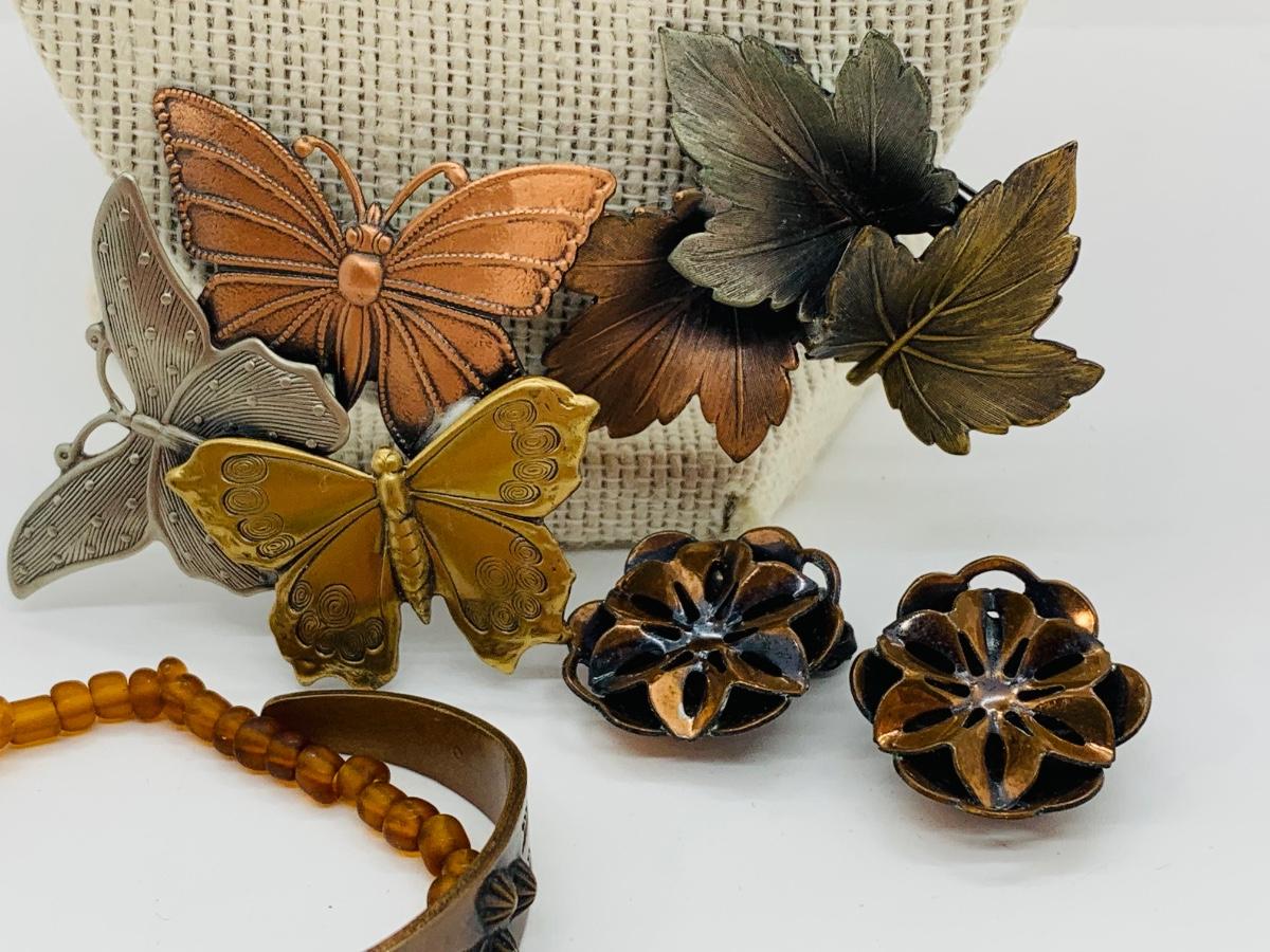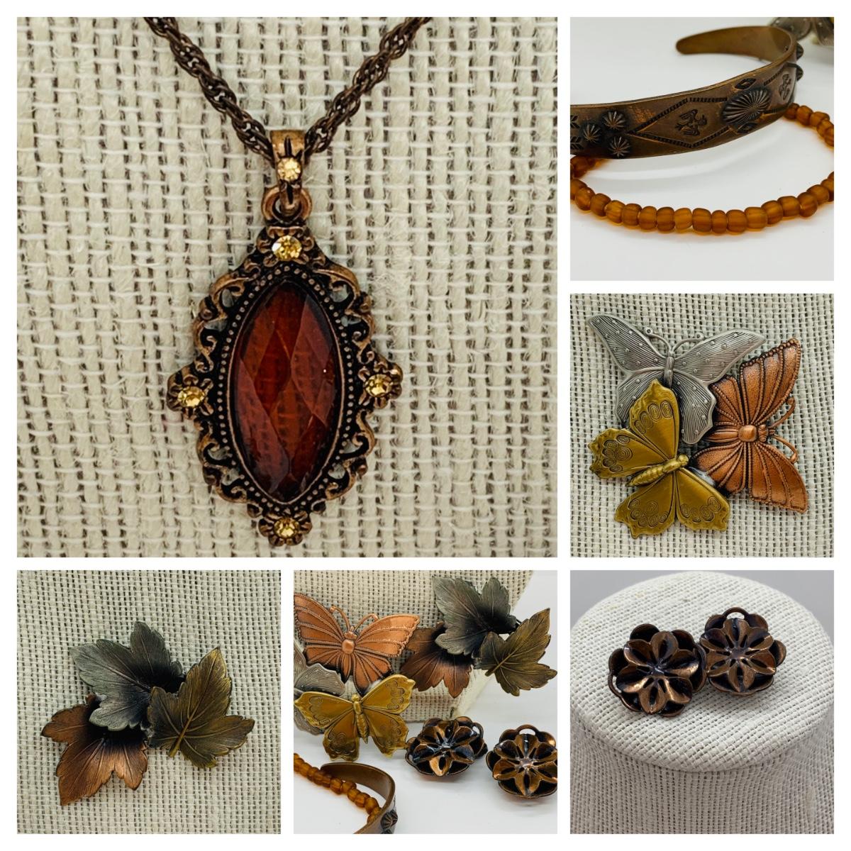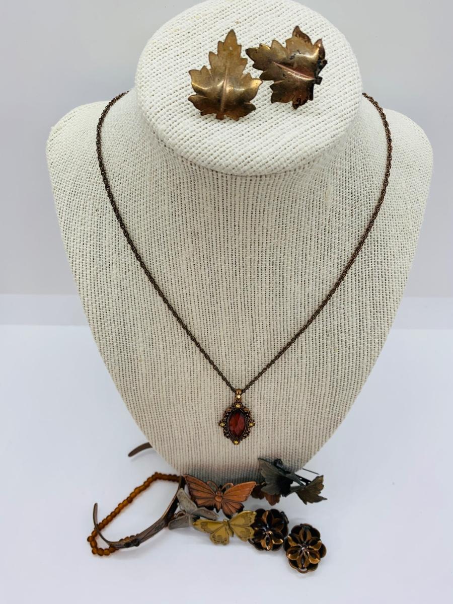 LOT 112R: Copper & Tri Color Necklace, Clip Earrings & Cuff Bracelet and Brooches