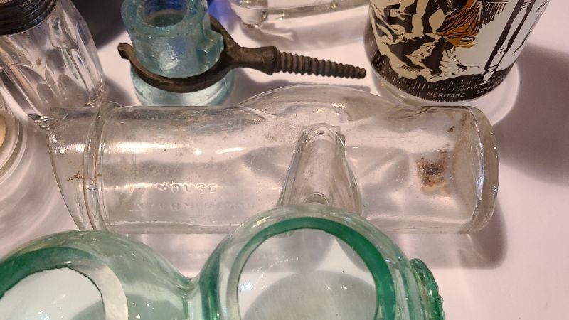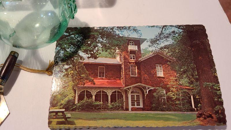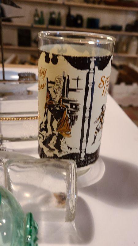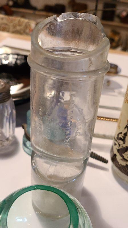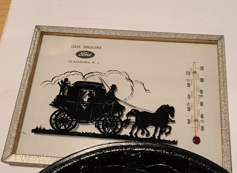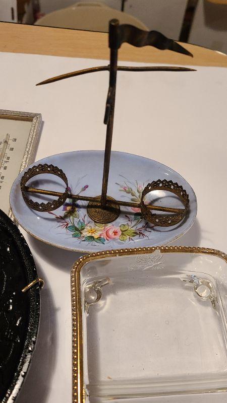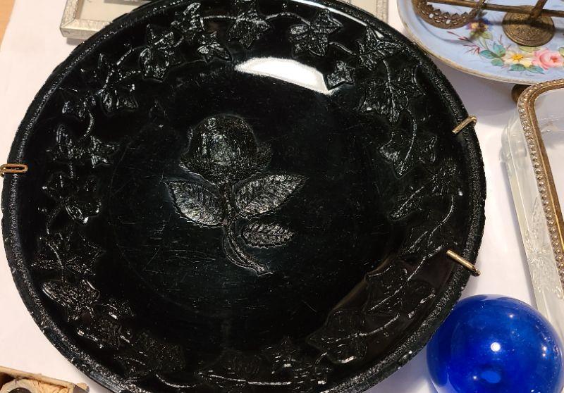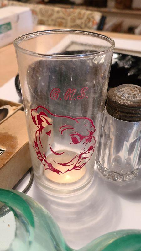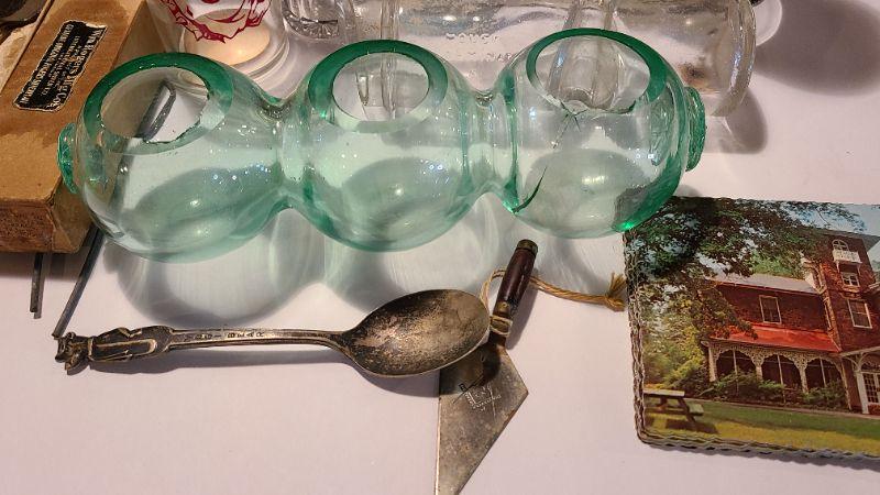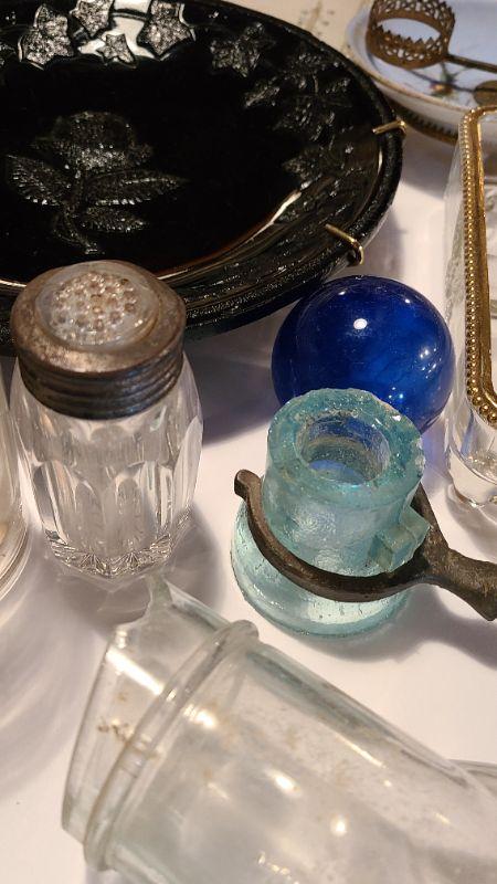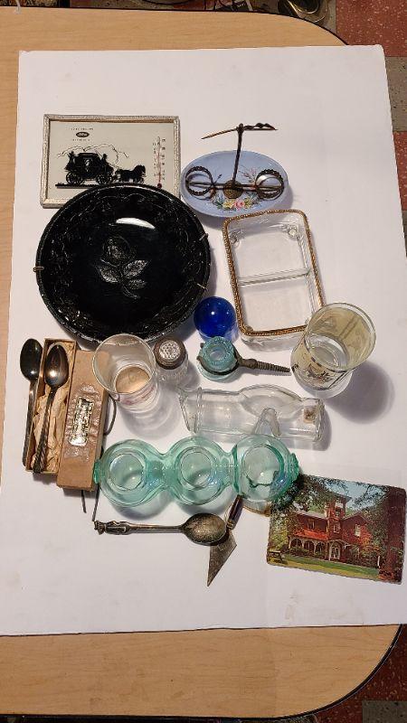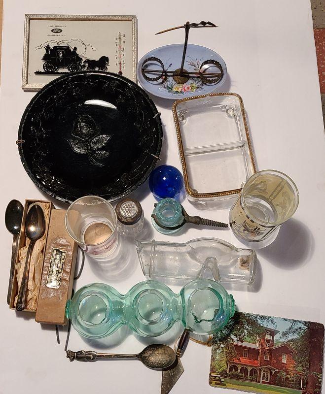 Nice lot of miscellaneous. Glassboro High School glass and thermometer, lighting rod insulator with cast iron bracket, Holly's postcards, glass mouse trap broken on end, Ferroline Black Glass Plate, crystal shaker and more. Please see all pictures for contents of the lot and condition.