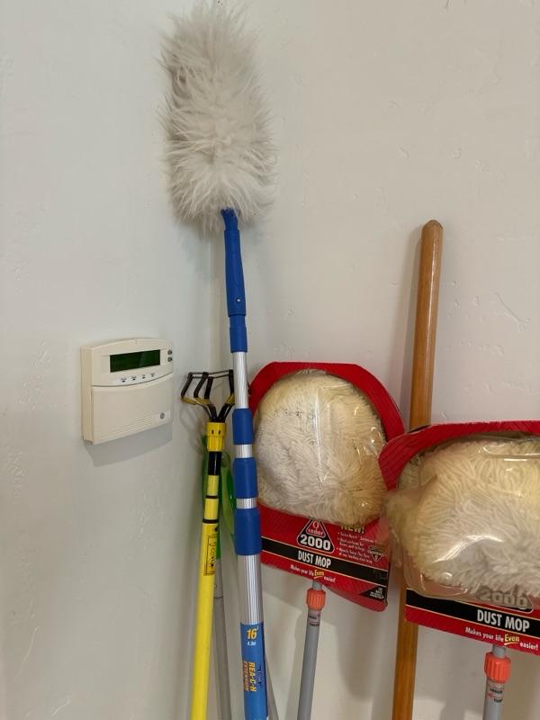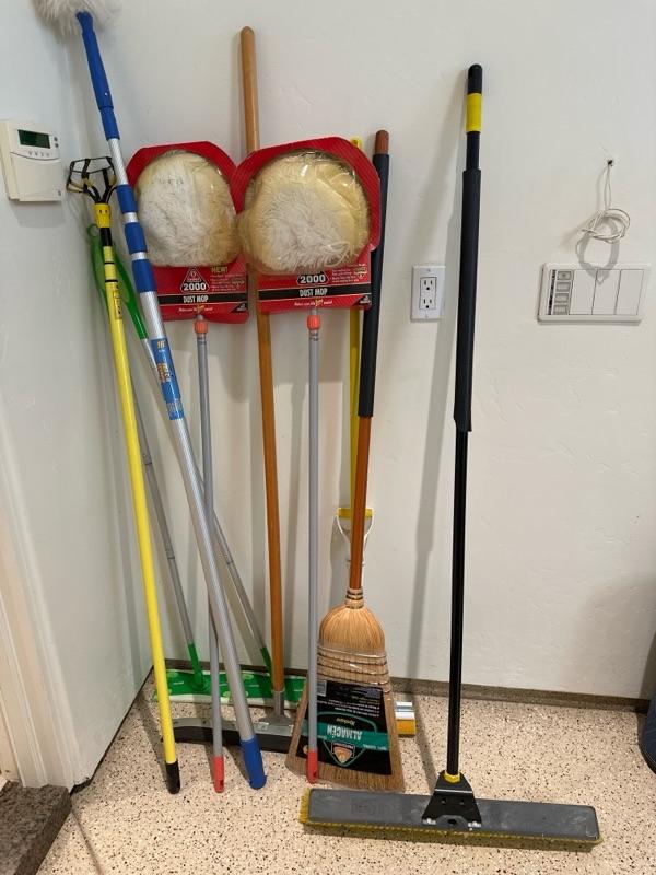 Variety of brooms and dusters