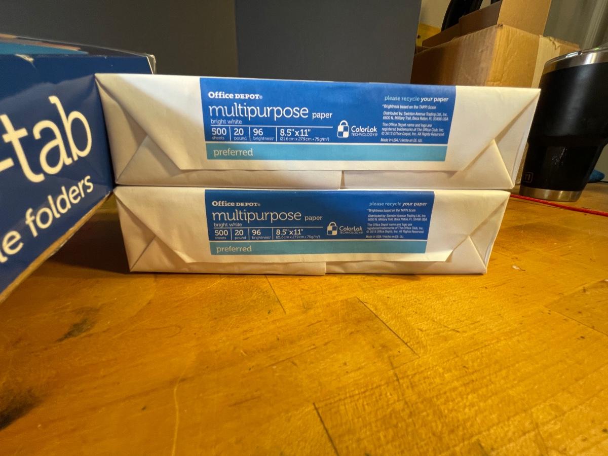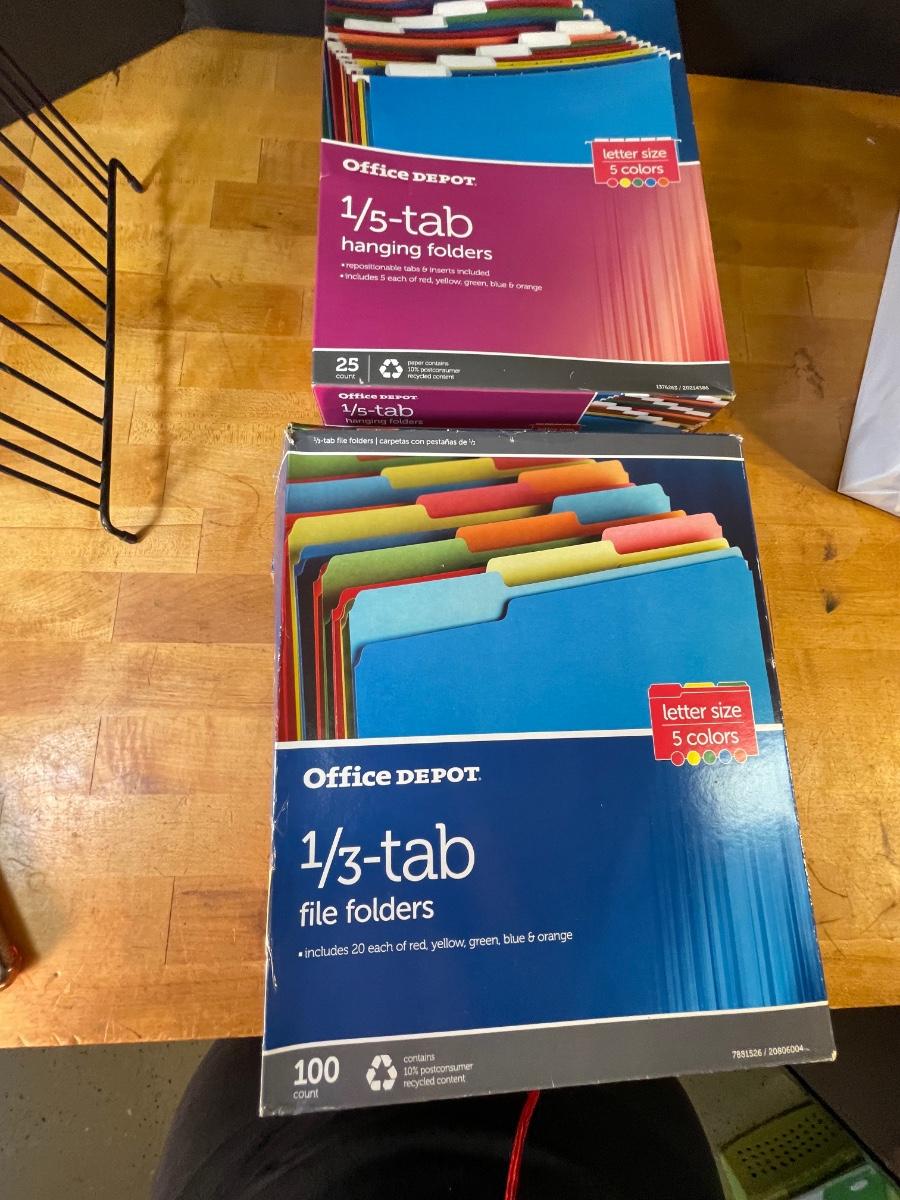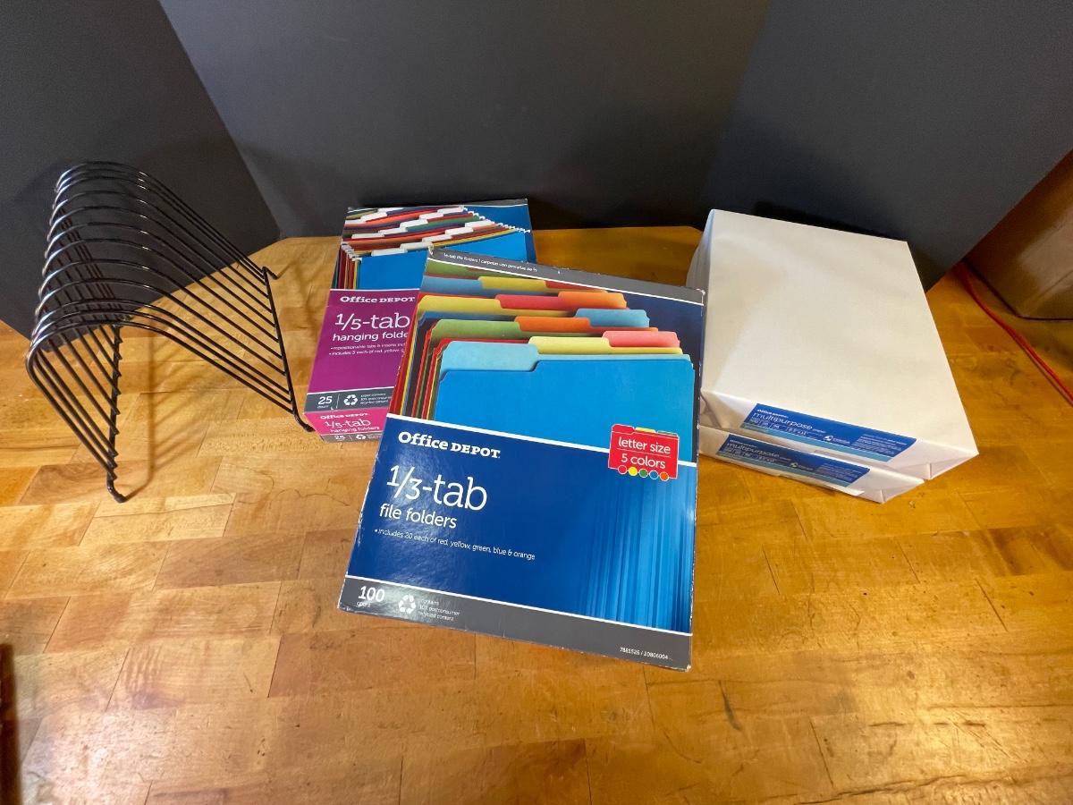 almost full box of 1/3 tab multi-colored assortment file folders, box of hanging file folders, two reams of printer paper and a wire file rack