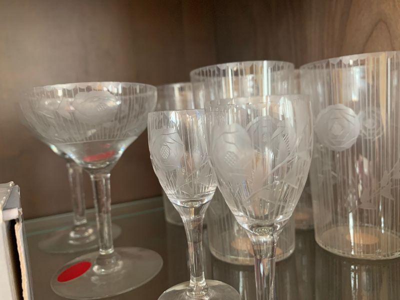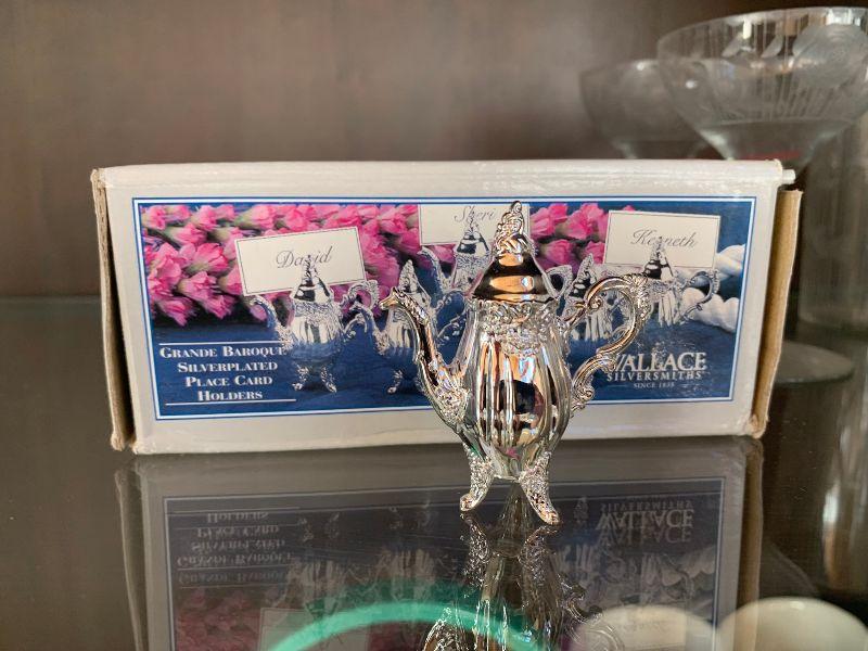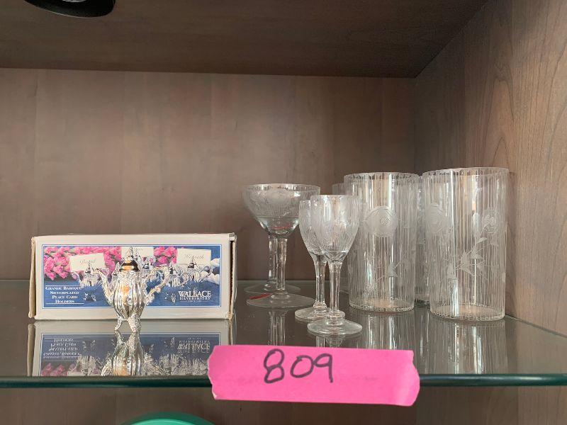 6 Wallace silversmiths place card holders, and 9 glasses etched