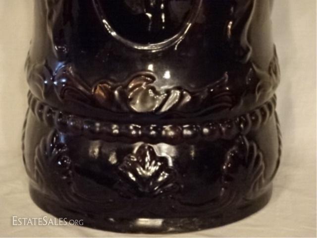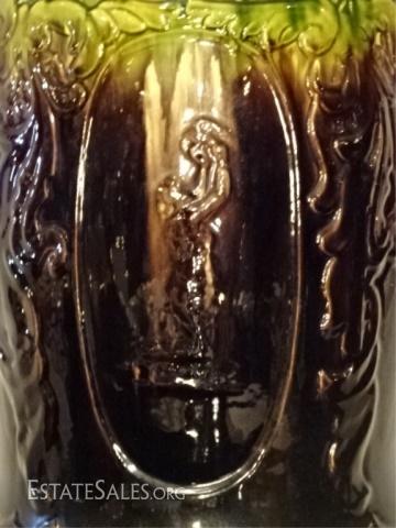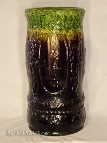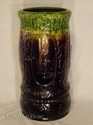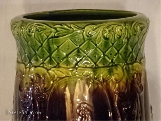 LOT 80B: CERAMIC UMBRELLA STAND, GREEN AND BROWN GLAZE WITH FOLIATE DESIGNS IN RELIEF, 22"H X 11"W, SKU390.30